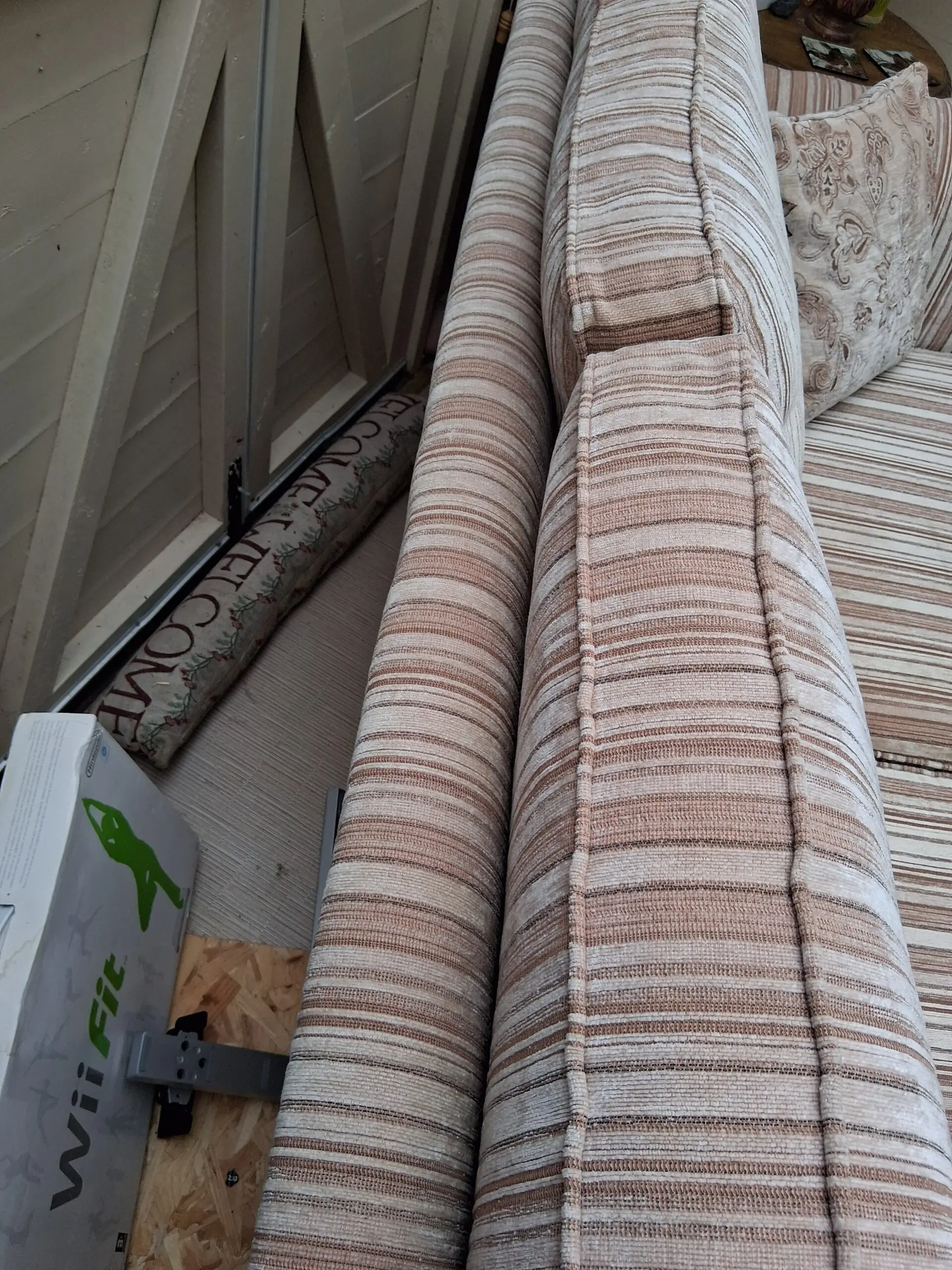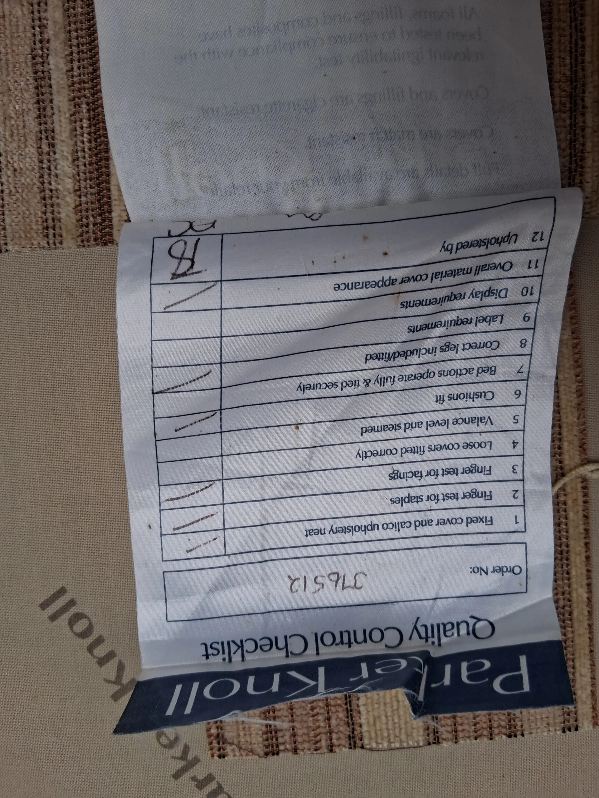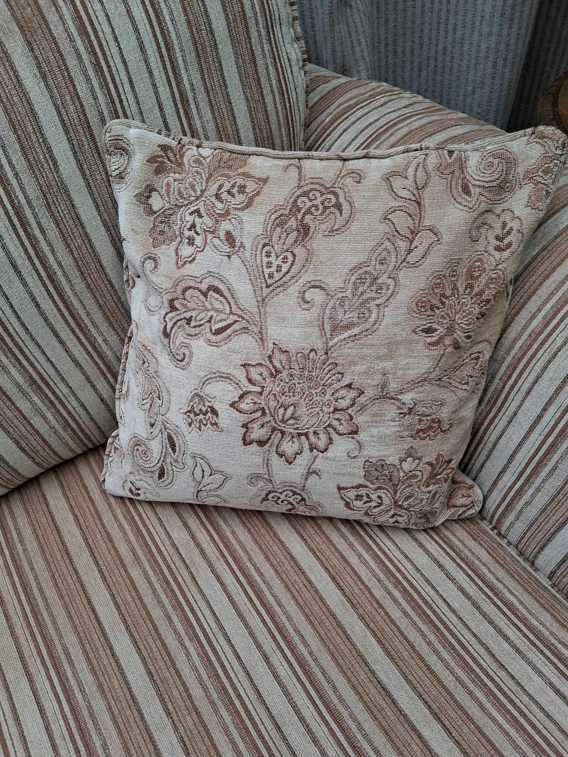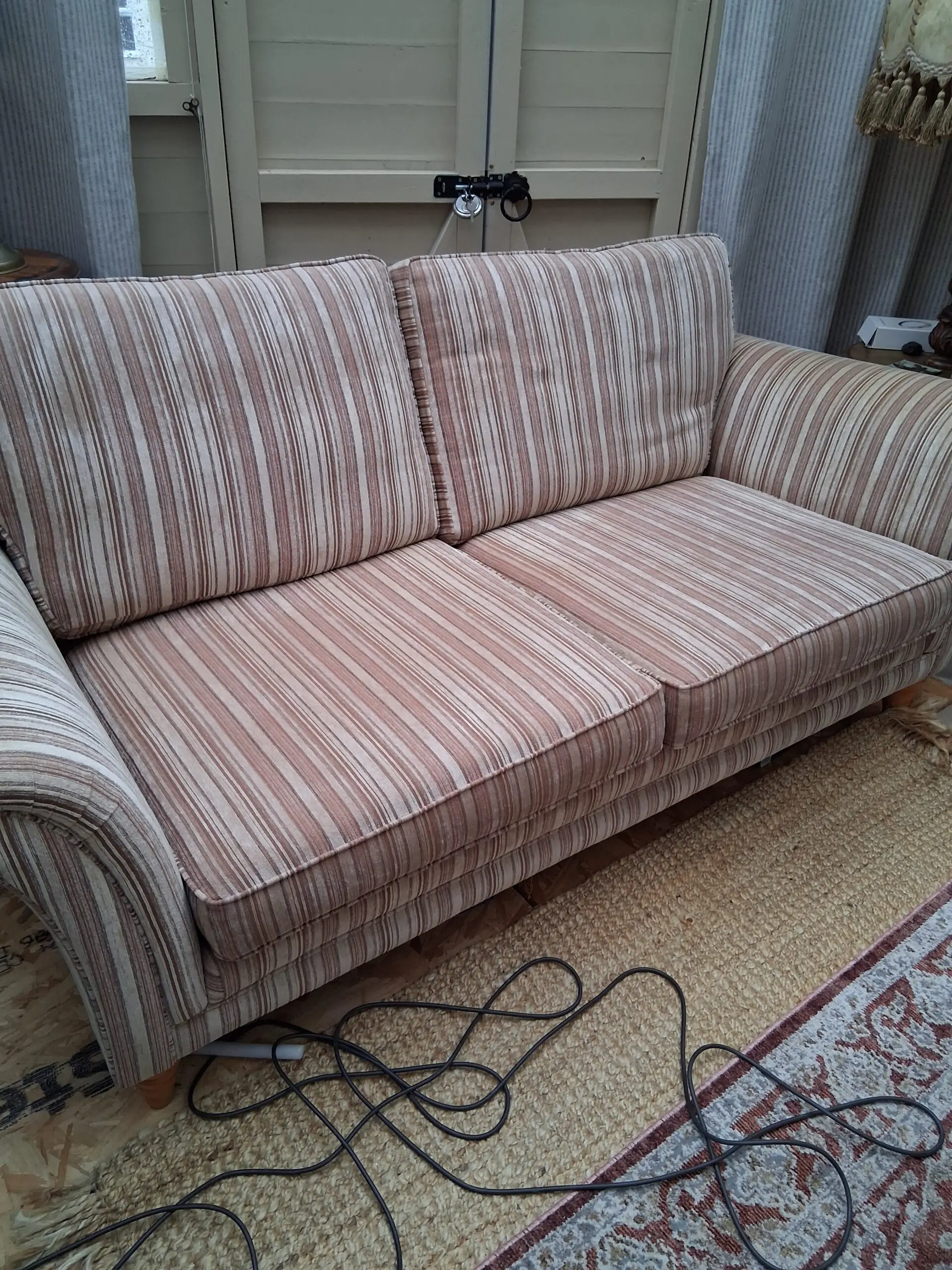 Beautiful parker knoll 3 seater in basley stripe gold, brilliant quality all covers Come off to wash. I Ve washed it a couple of times in excellent condition.bought it a few years ago now, and it still bounces back into place. So comfortable, it’s unbelievable. Selling due to change of décor arms covers, extra as well to protect the arms wooden legs.