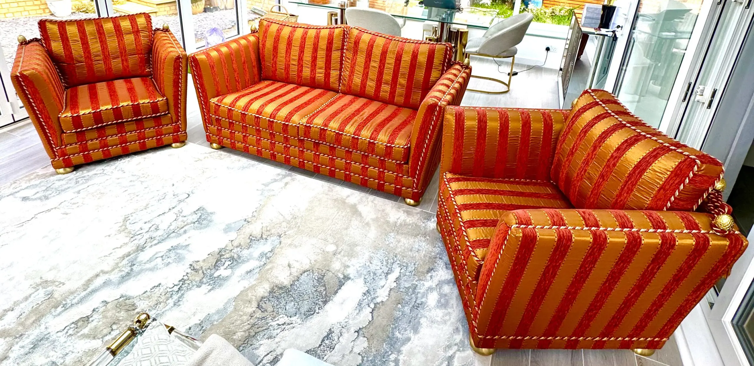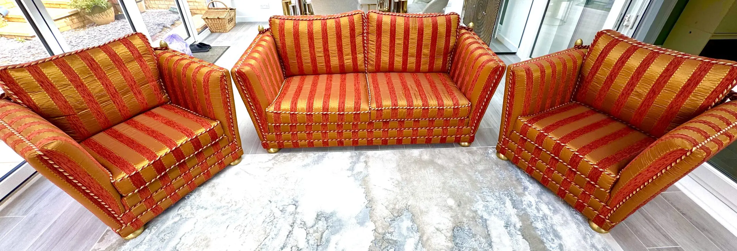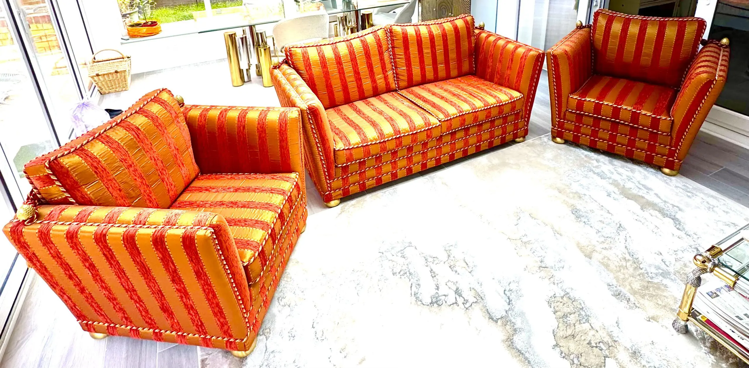 Pre-loved 3-piece lounge suit with red & gold fabric kept in a smoke free, child free & pet free home.