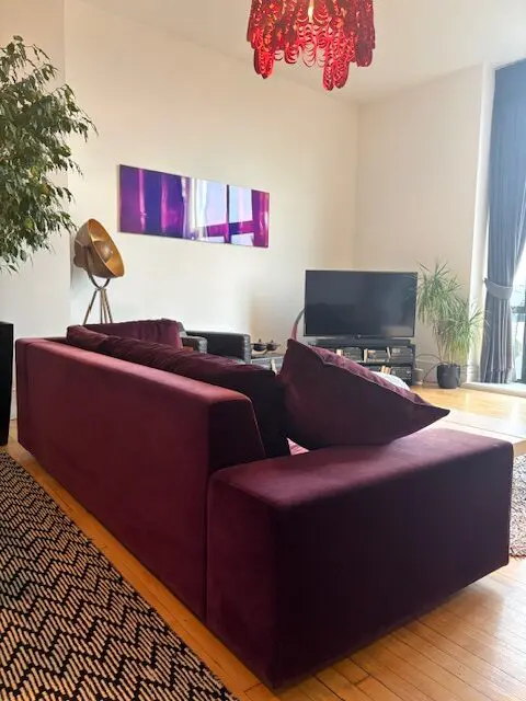 The sofa has been used in a room with natural light and there is visible sunlight fading to the upholstery, particularly on the more exposed areas. The fading is cosmetic only – the structure, cushions and comfort are unaffected.