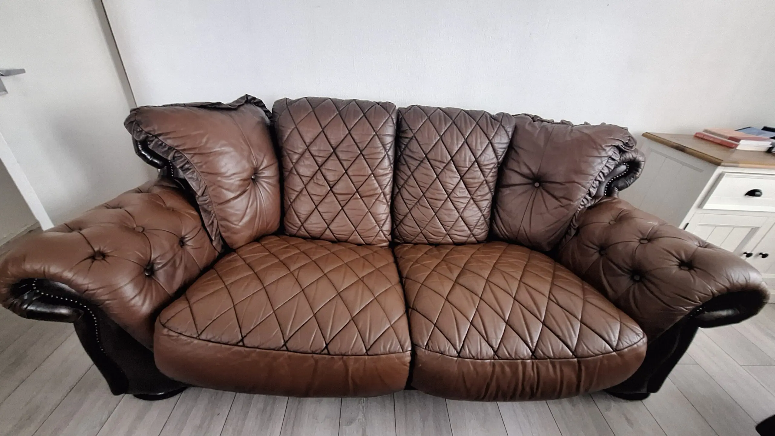 This stylish 3-seater sofa features an eye-catching diamond quilted pattern across the seat and back cushions, creating a sophisticated look for any living room. The generously padded button-tufted arms provide excellent comfort and support, whilst the classic design works beautifully in both traditional and contemporary settings. Perfect for family use or entertaining guests, this substantial sofa offers ample seating space. The quilted detailing and studded trim add a touch of luxury that will enhance your home décor.