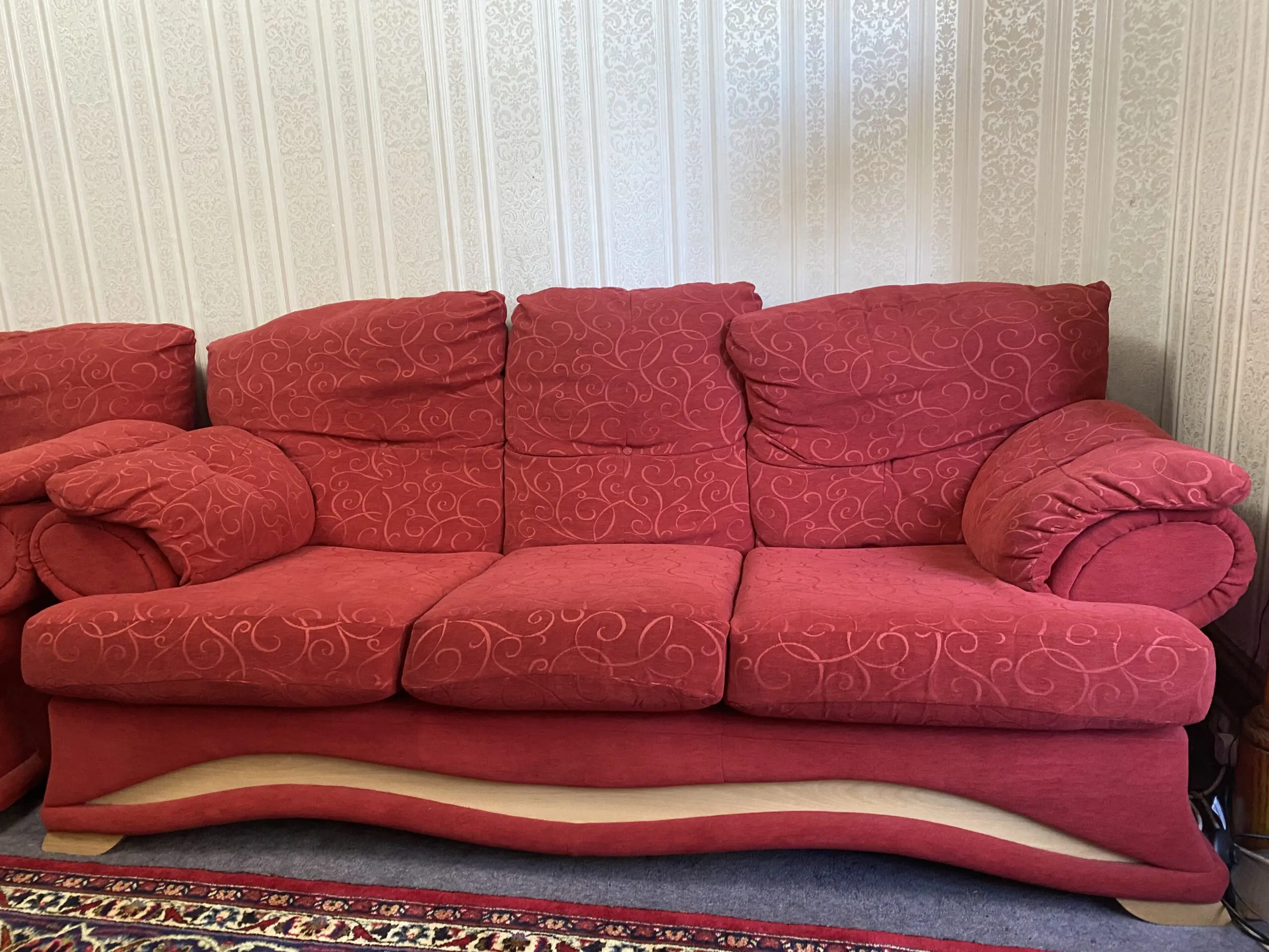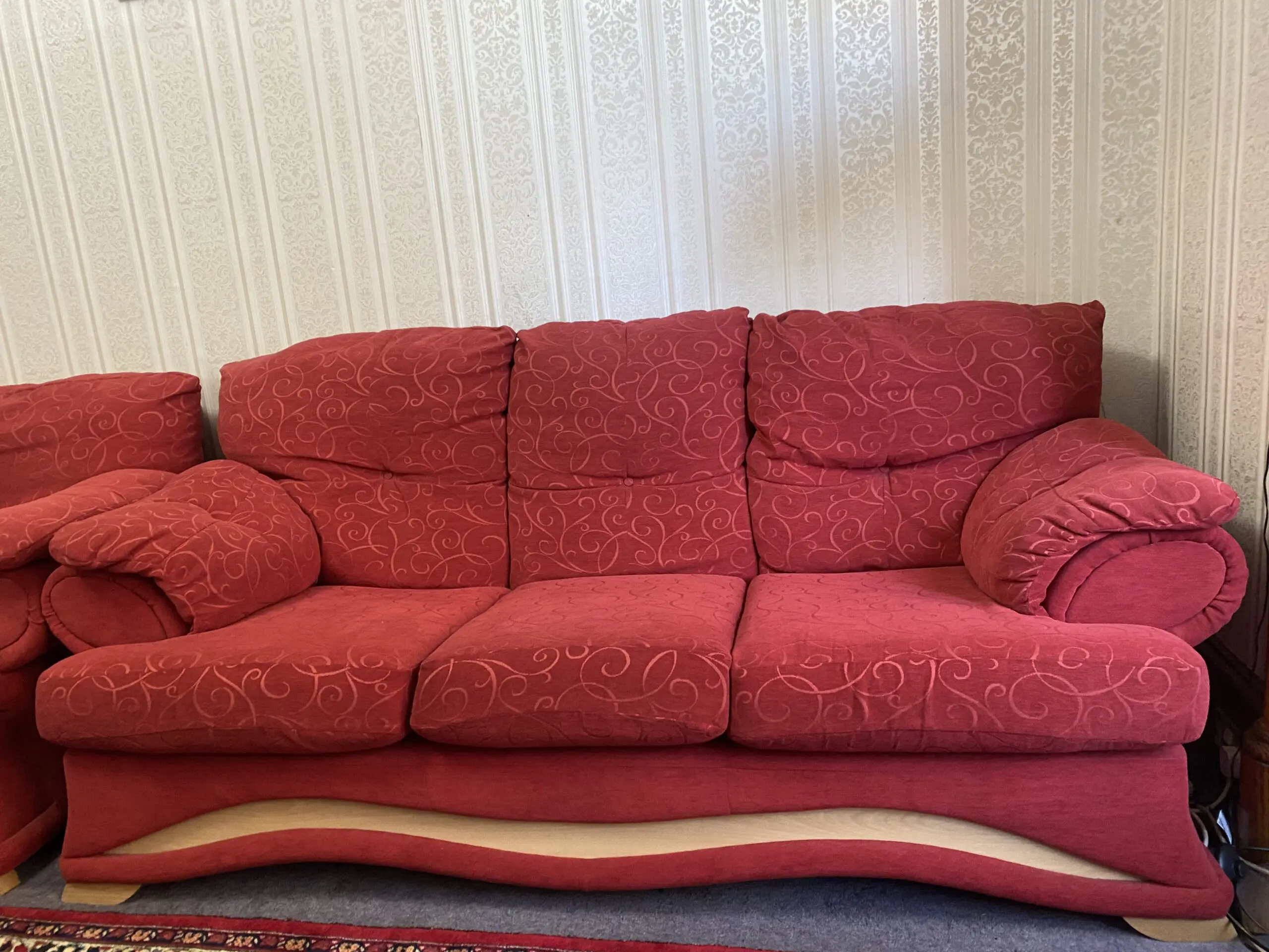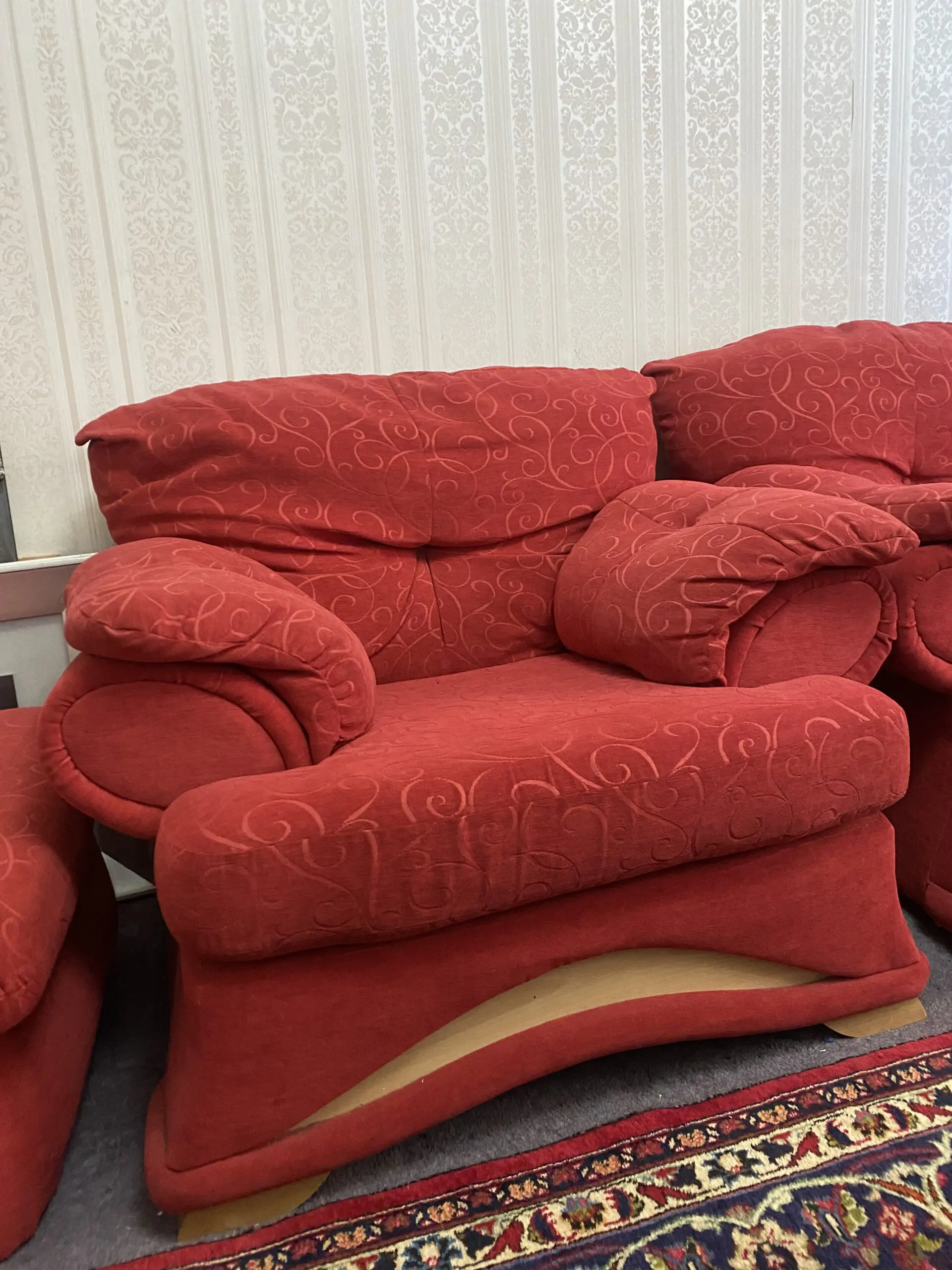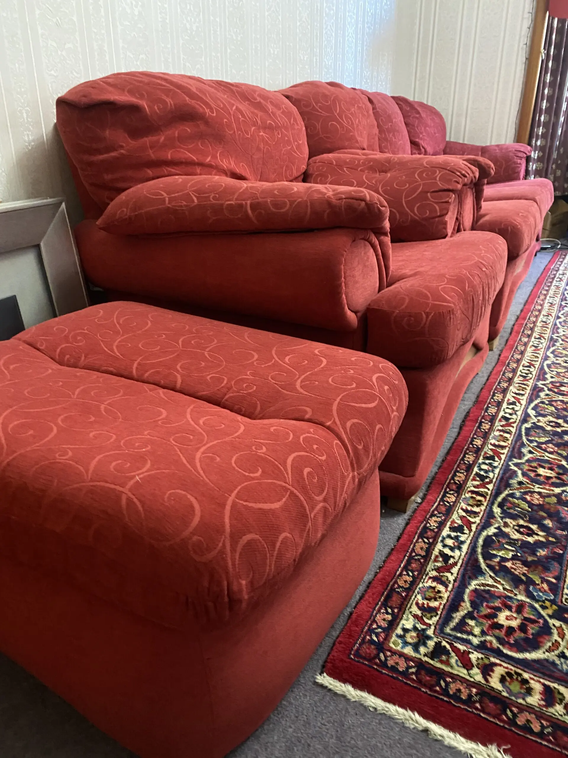 This red sofa set is in mint condition, having been covered for years and barely used. The fabric is vibrant with an elegant swirl pattern, and all cushions are plump, supportive, and extremely comfortable. The set includes: