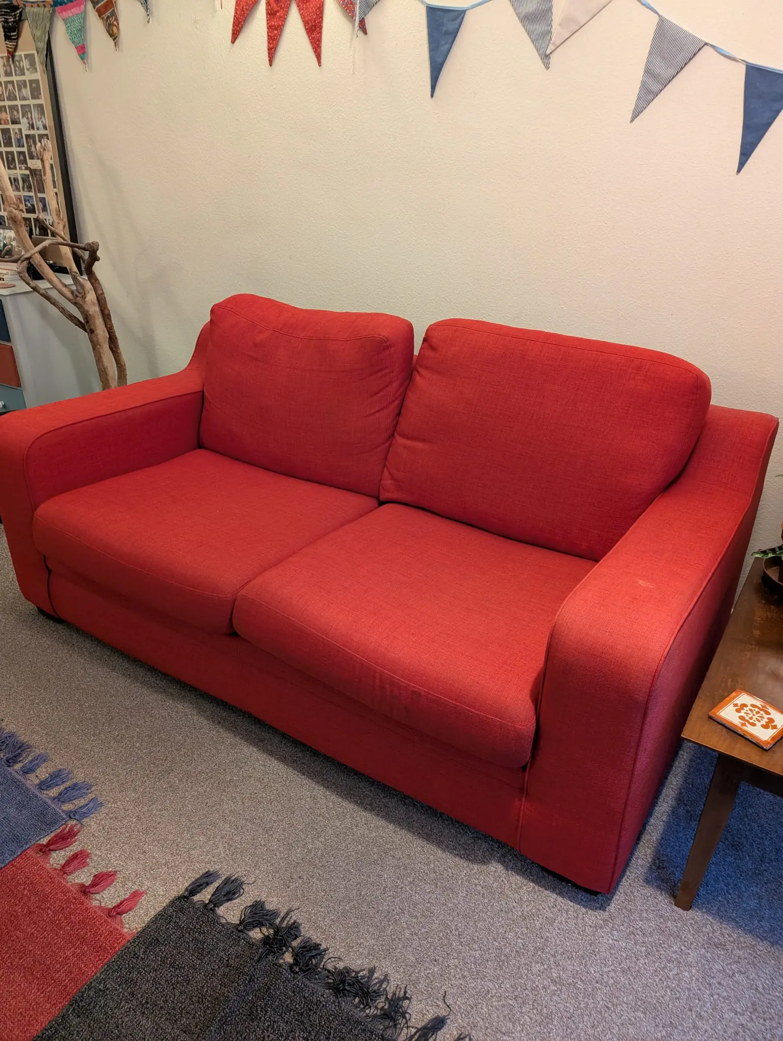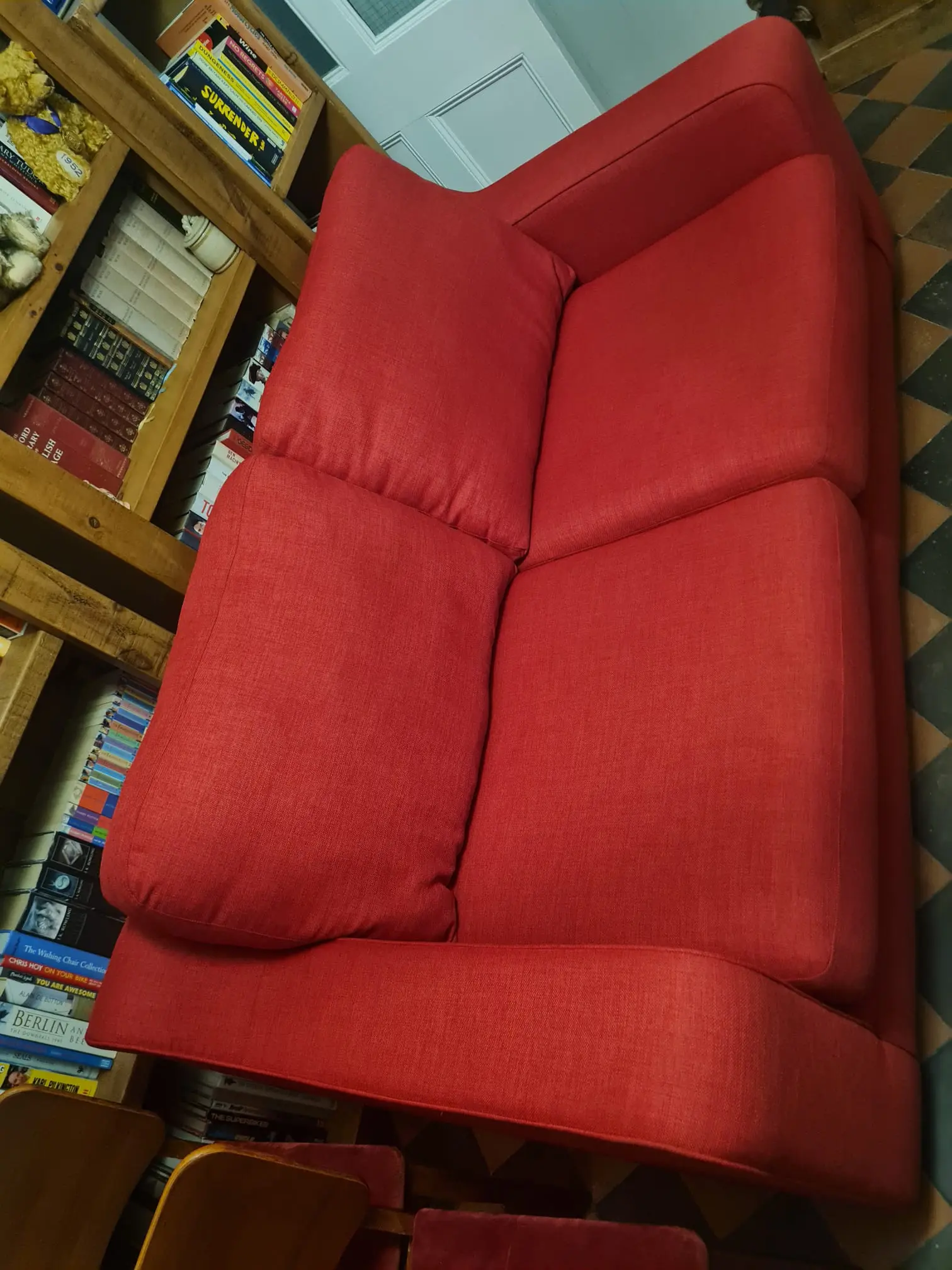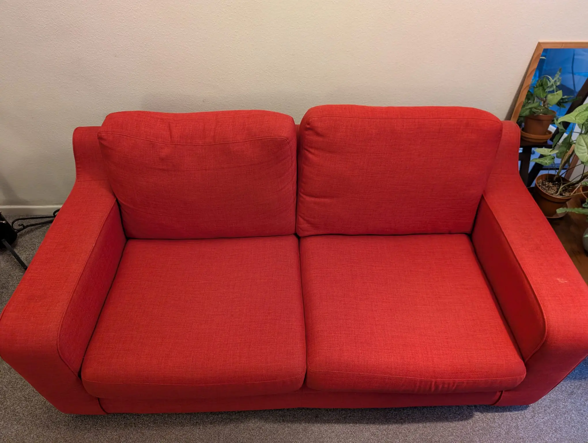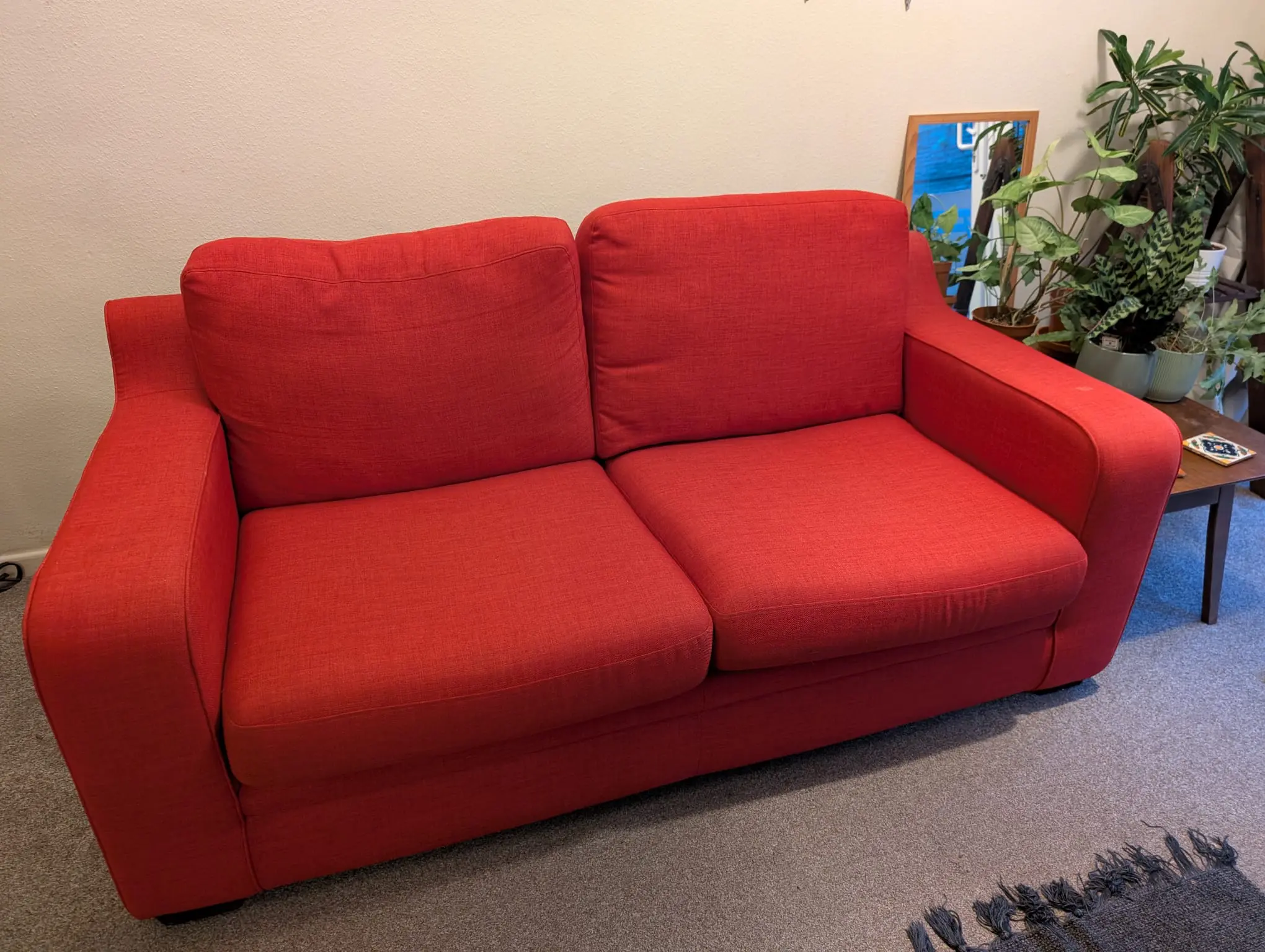 Lovely red sofa. Very comfortable! Have loved having it in our home for 2.5 years.