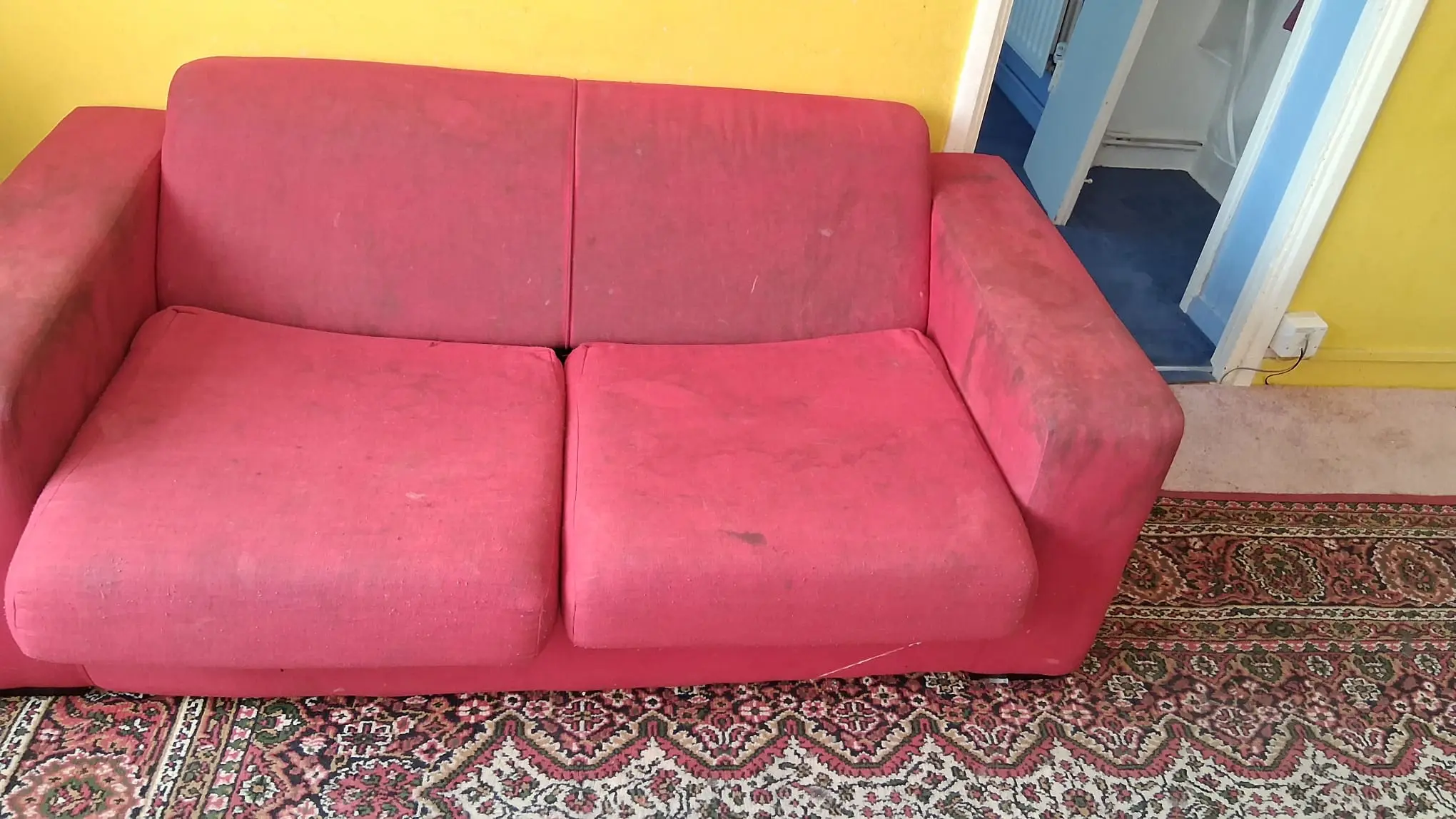 Red Sofa bed, with marks. A 6ft person can fit the sofa bed when opened out.