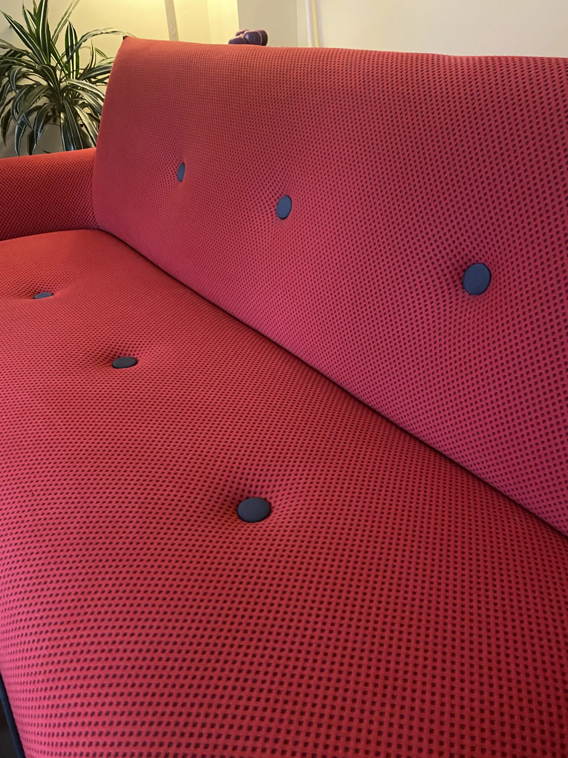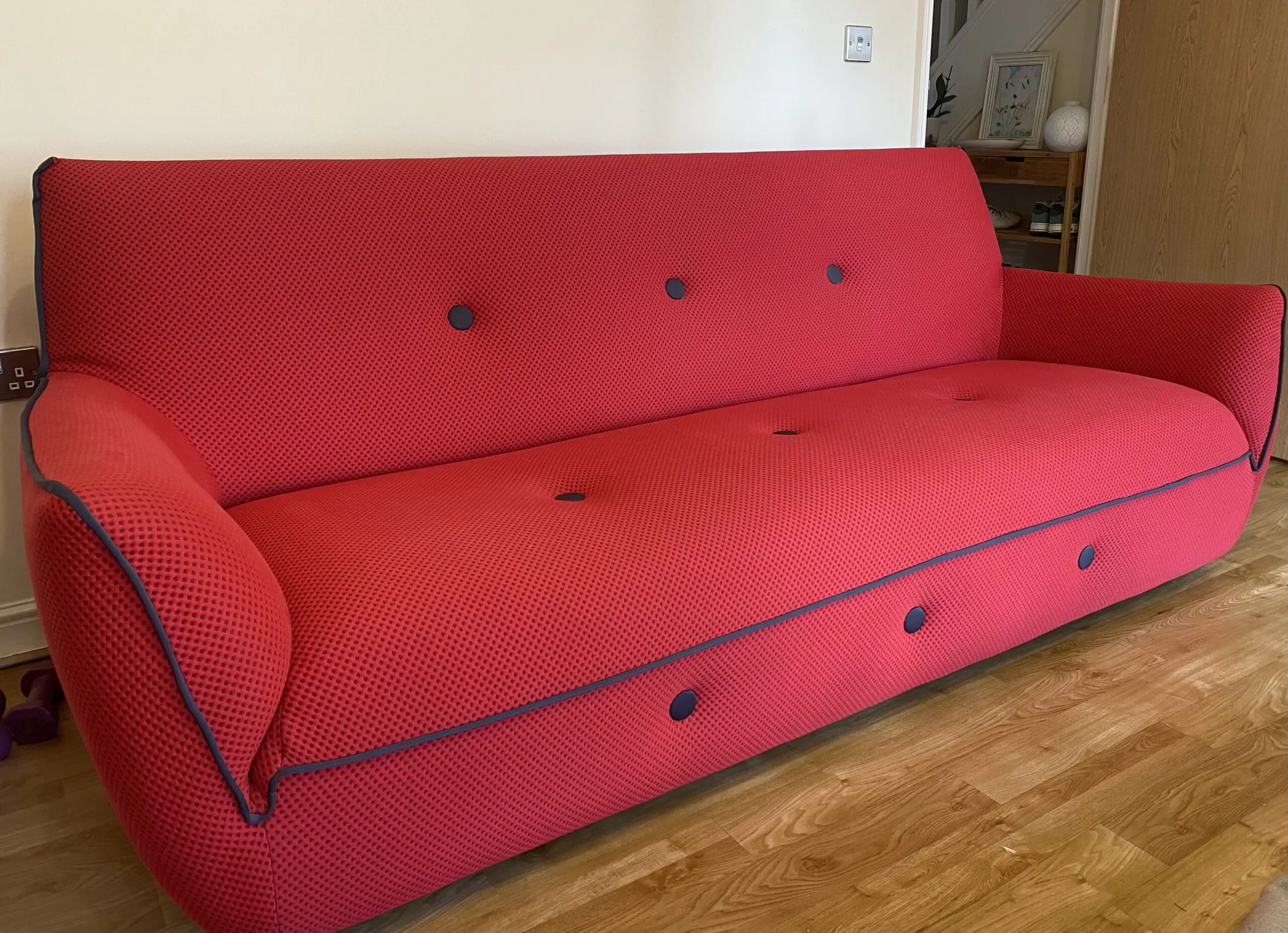 Hello. Welcome to this lovely deep red three seater sofa, made in Italy. Manufacturer unknown. The red is enriched by the dark grey piping and buttons.