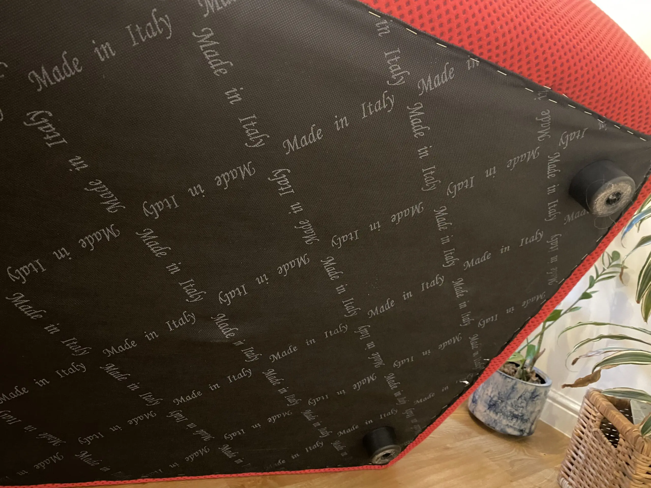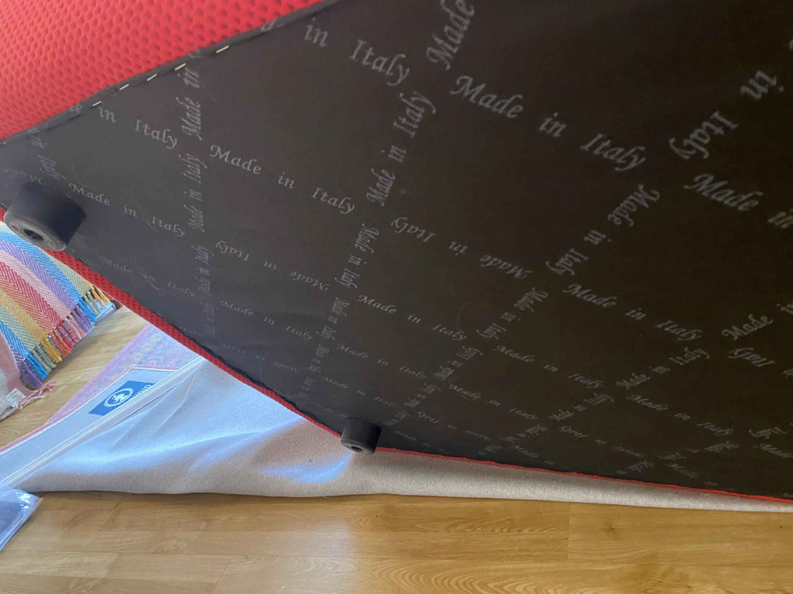 It has plastic feet; a “made in Italy” covering on the underside; no fire label that I can find.