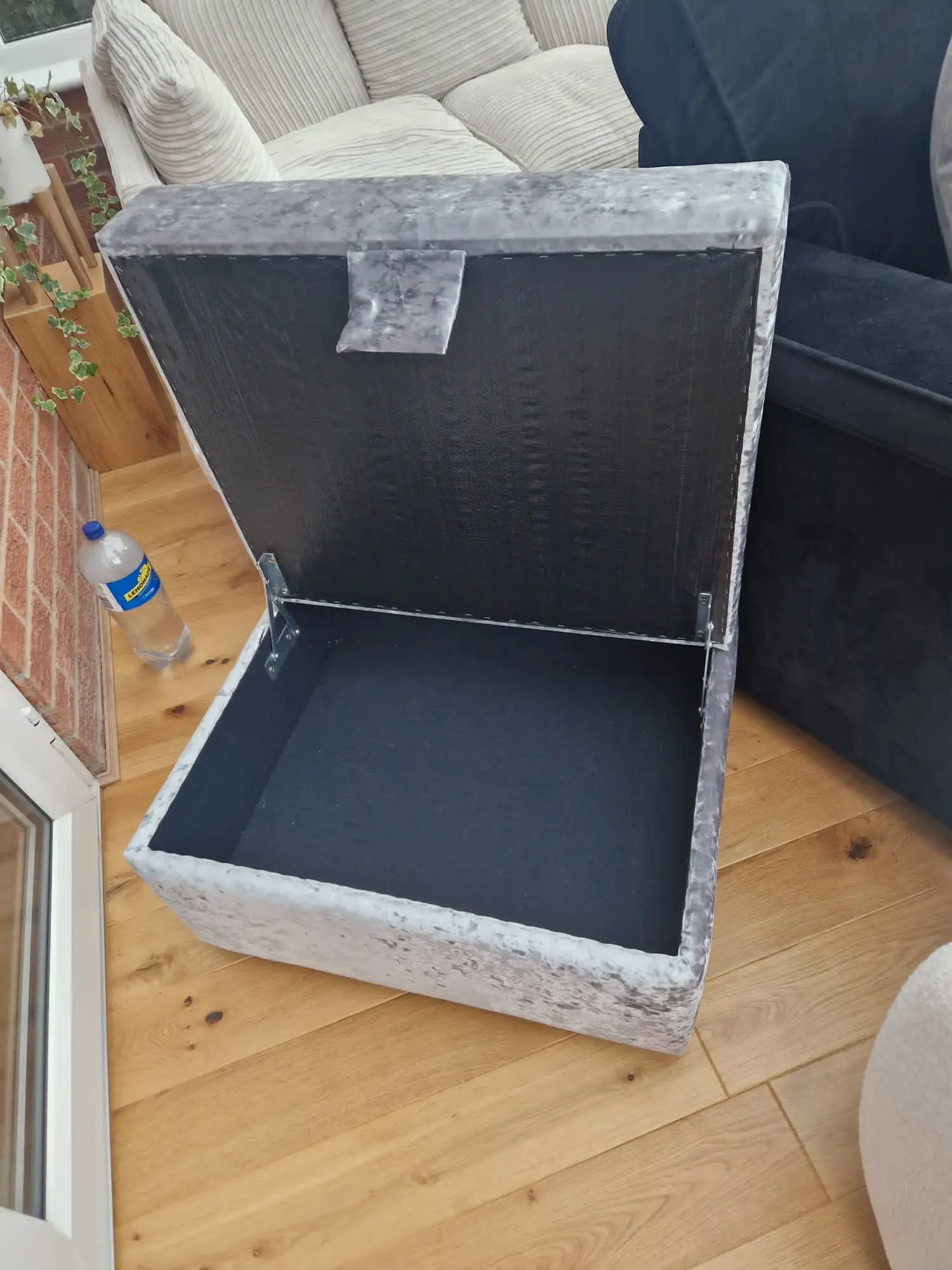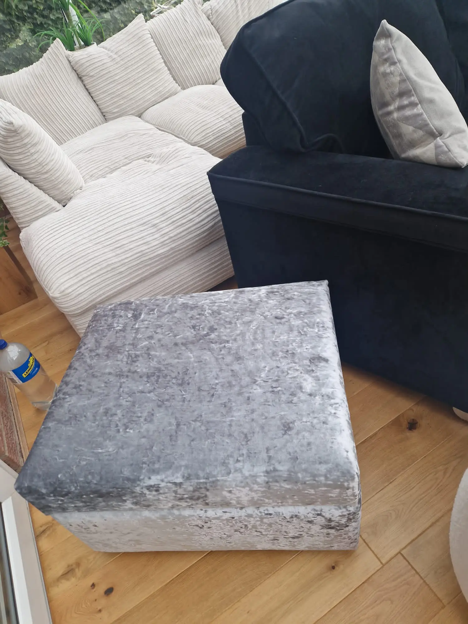 As good as new 3 seater in Black Velvet fabric. Less than 12 months old. Fire tags attached. Originally cost £900. Very little use. Solid wood high quality frame. 2 people to lift. Comes with free storage box/foot rest in Crushed Silver fabric.