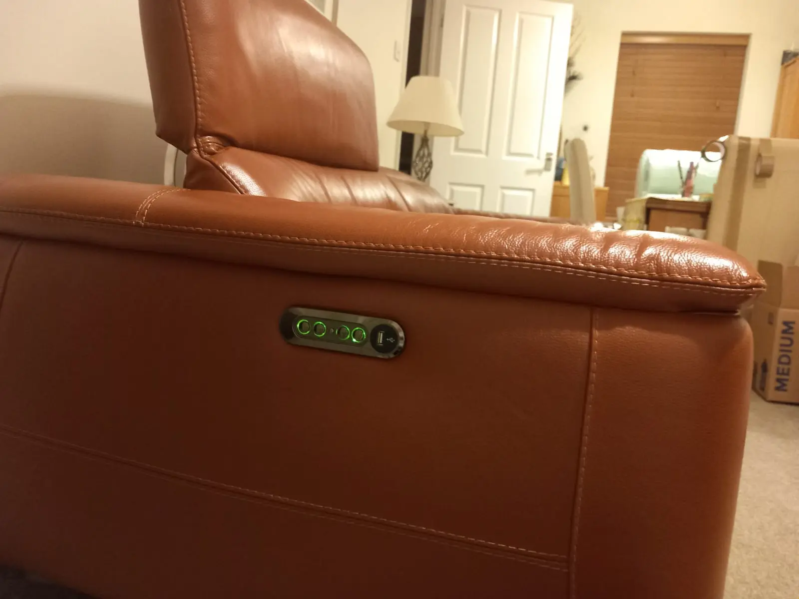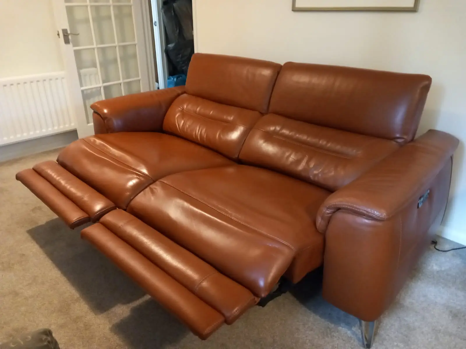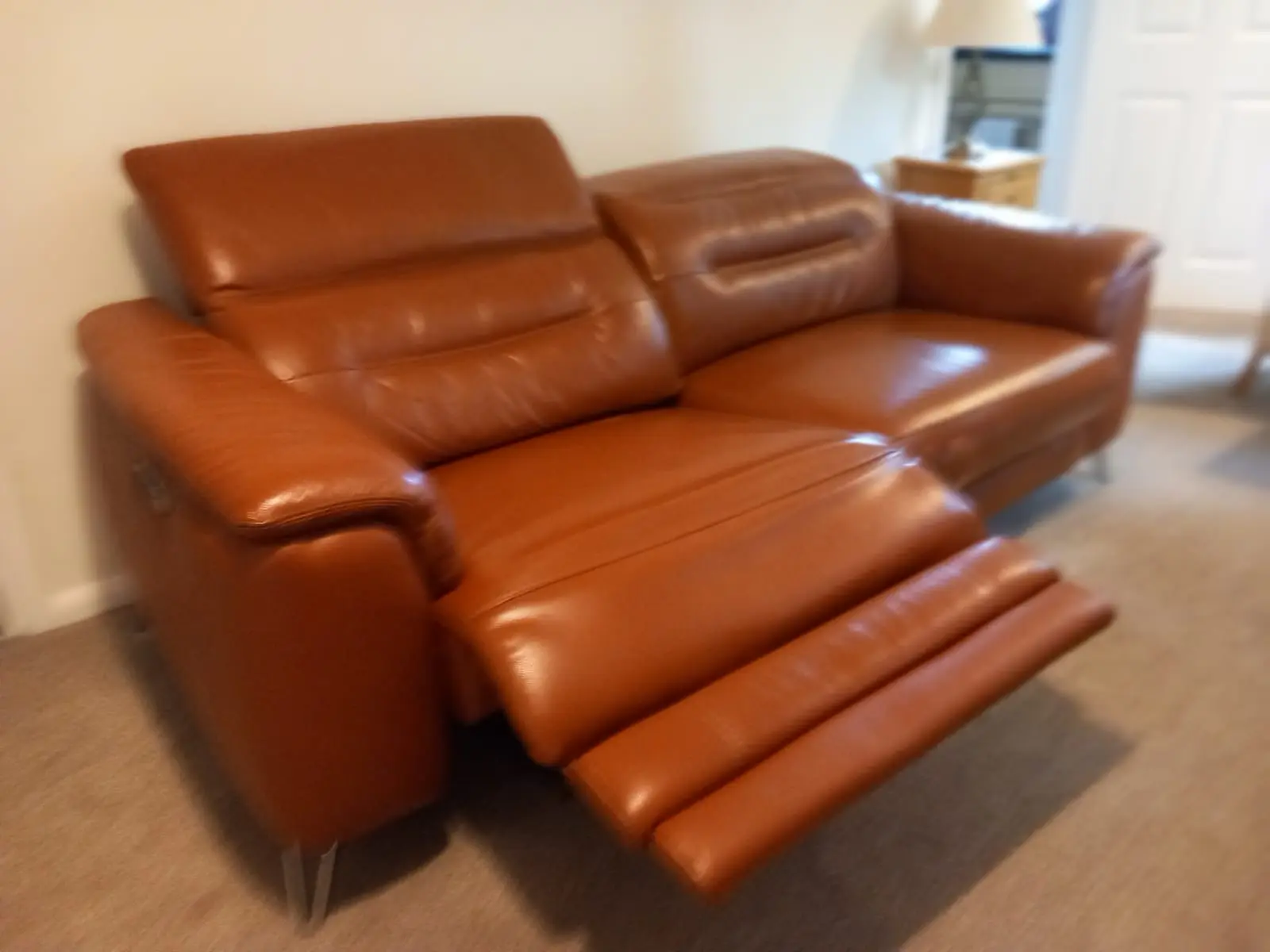 Absolutely stunning and immaculate “Sanza” 3 seater double recliner power sofa with power headrests and polished steel legs in warm brown (tan) quality leather.