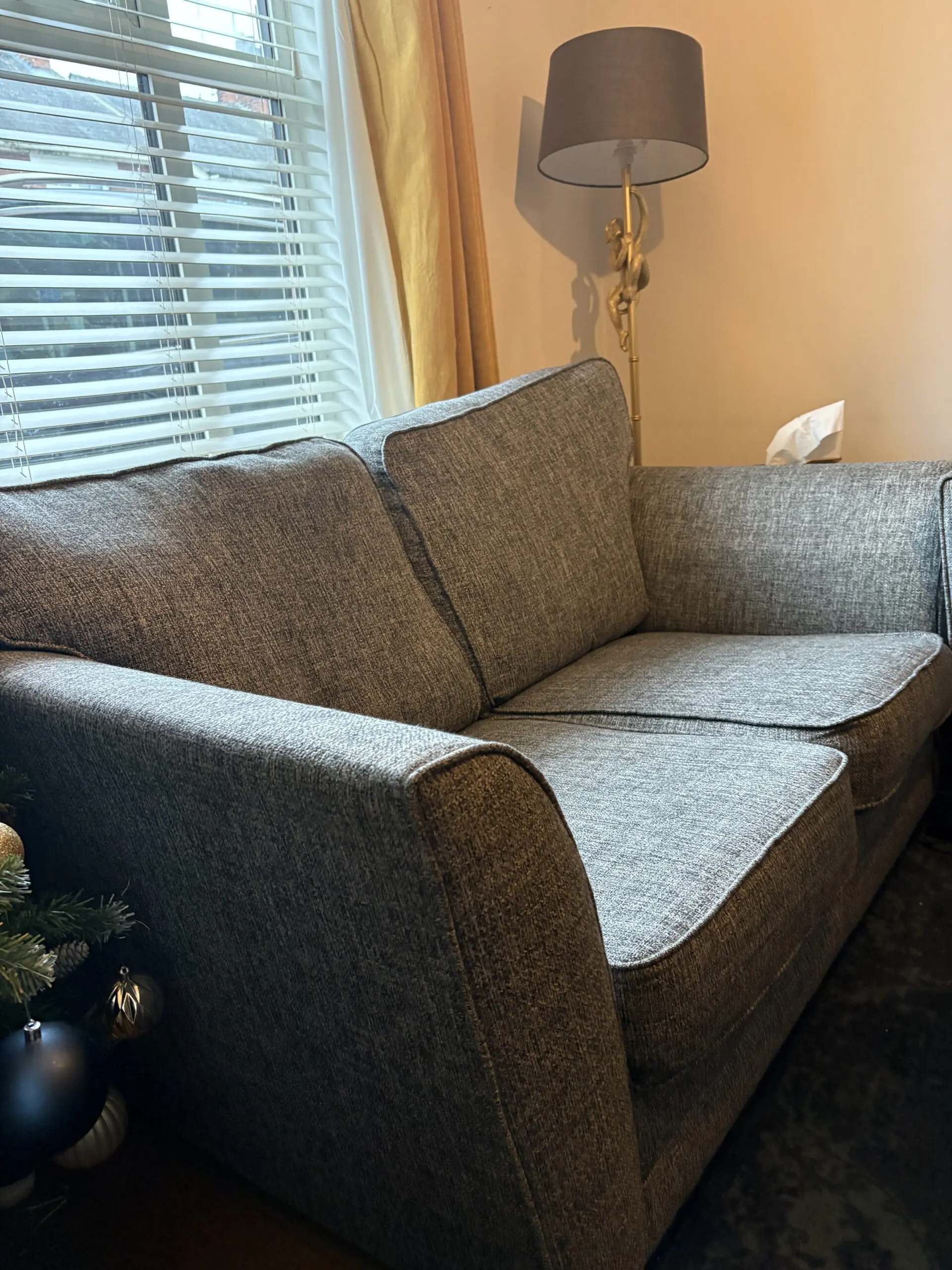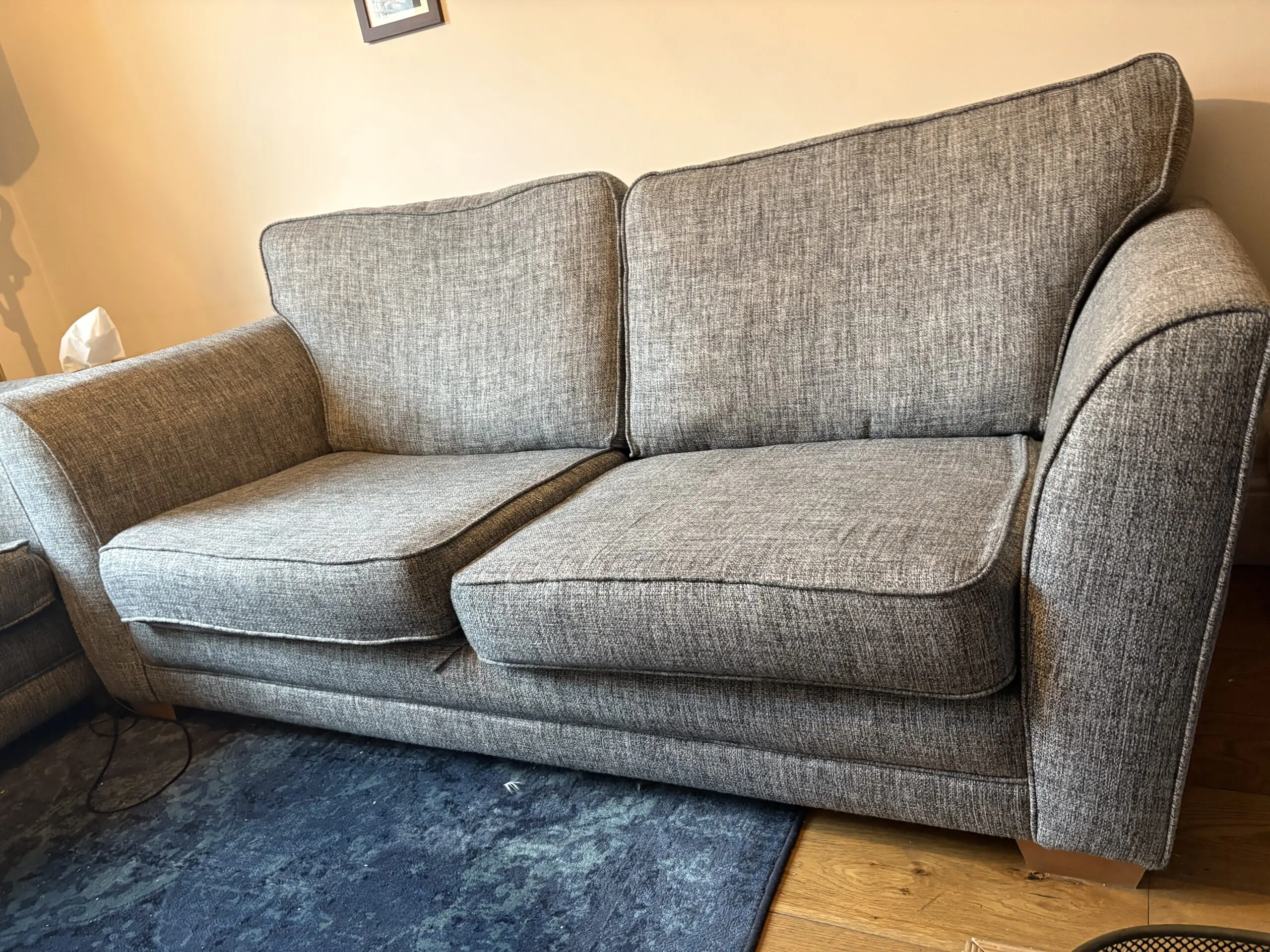 Stylish and comfortable grey fabric sofa set in great condition, perfect for living rooms of all sizes. The set includes: