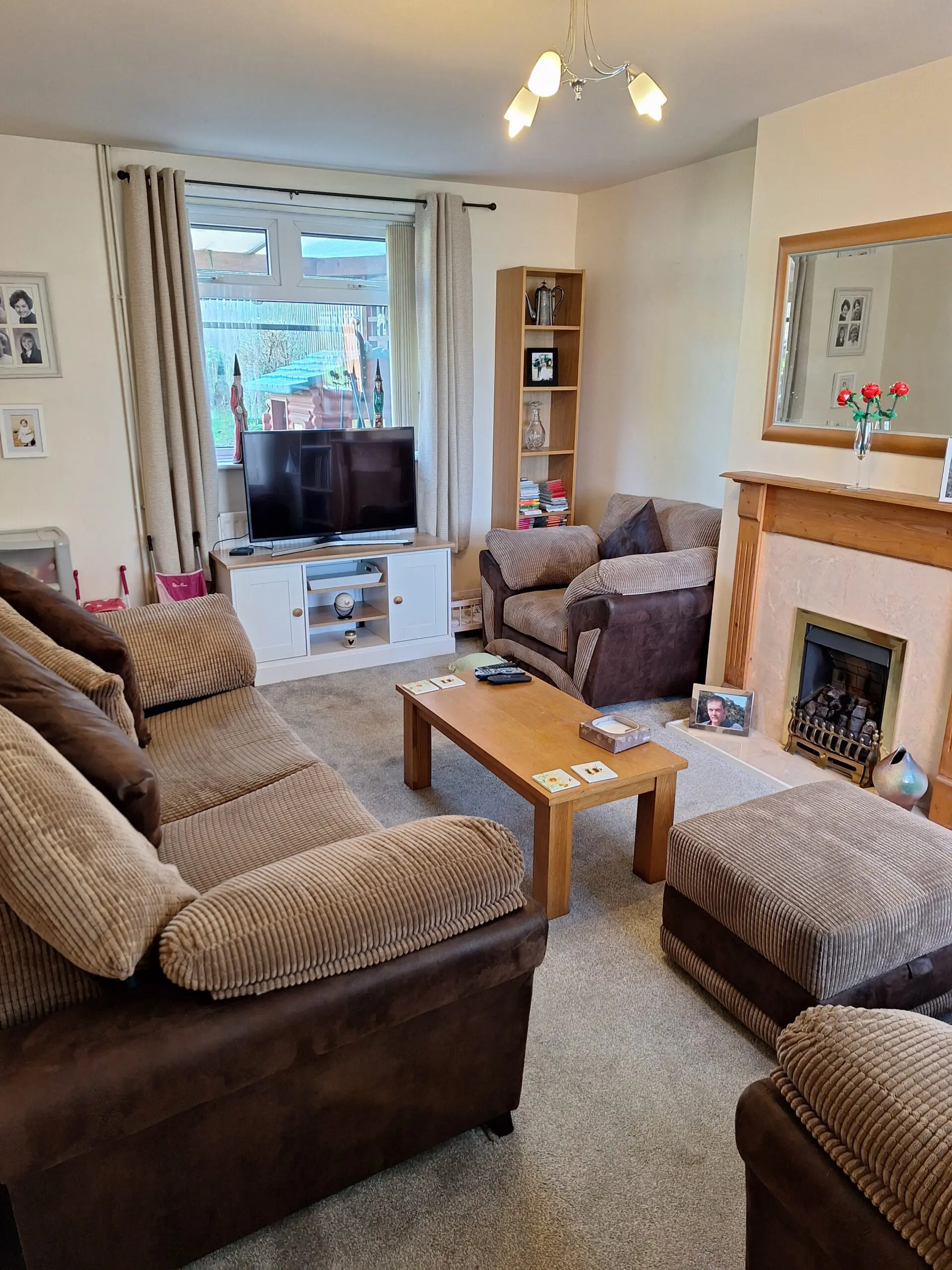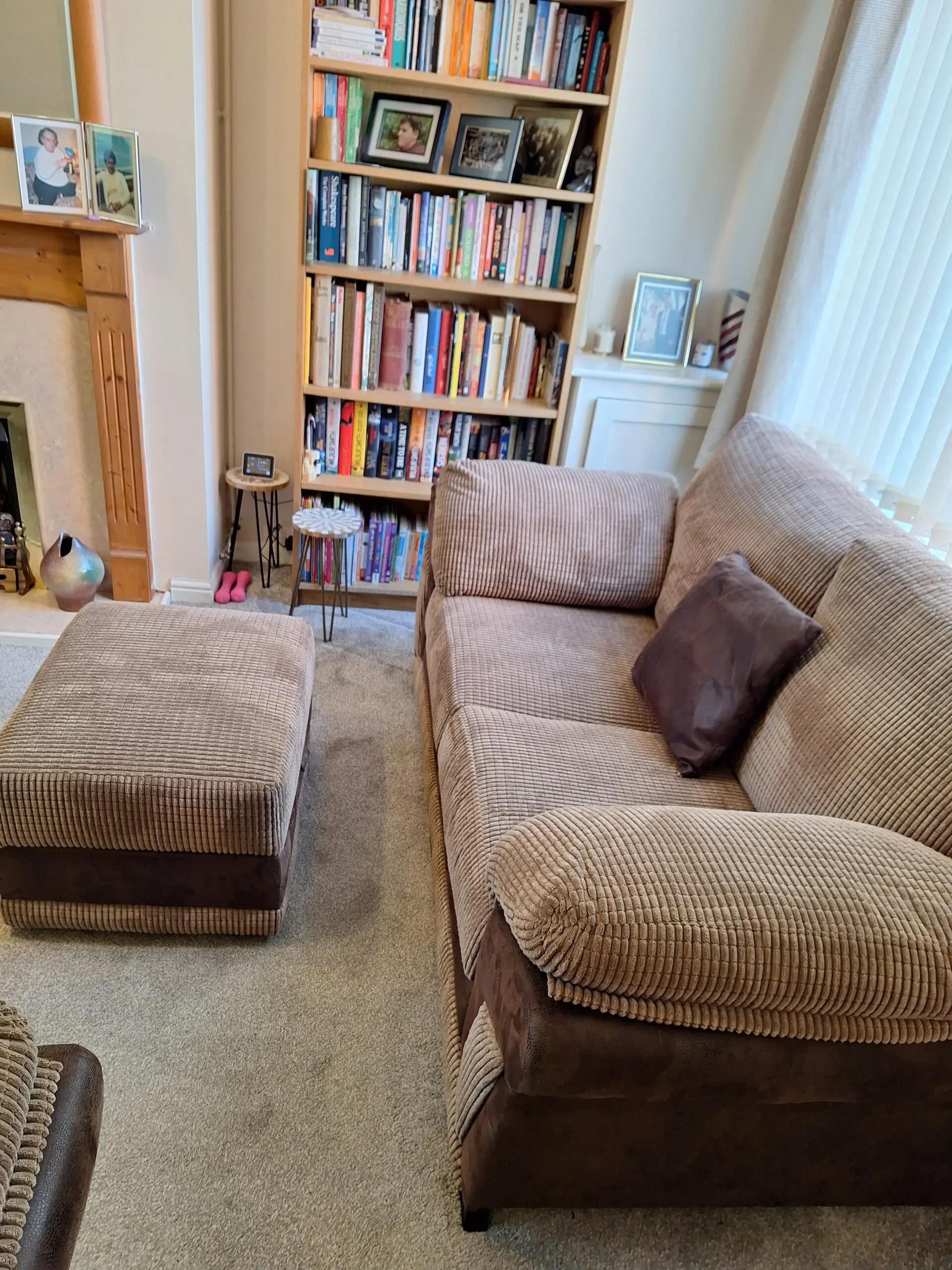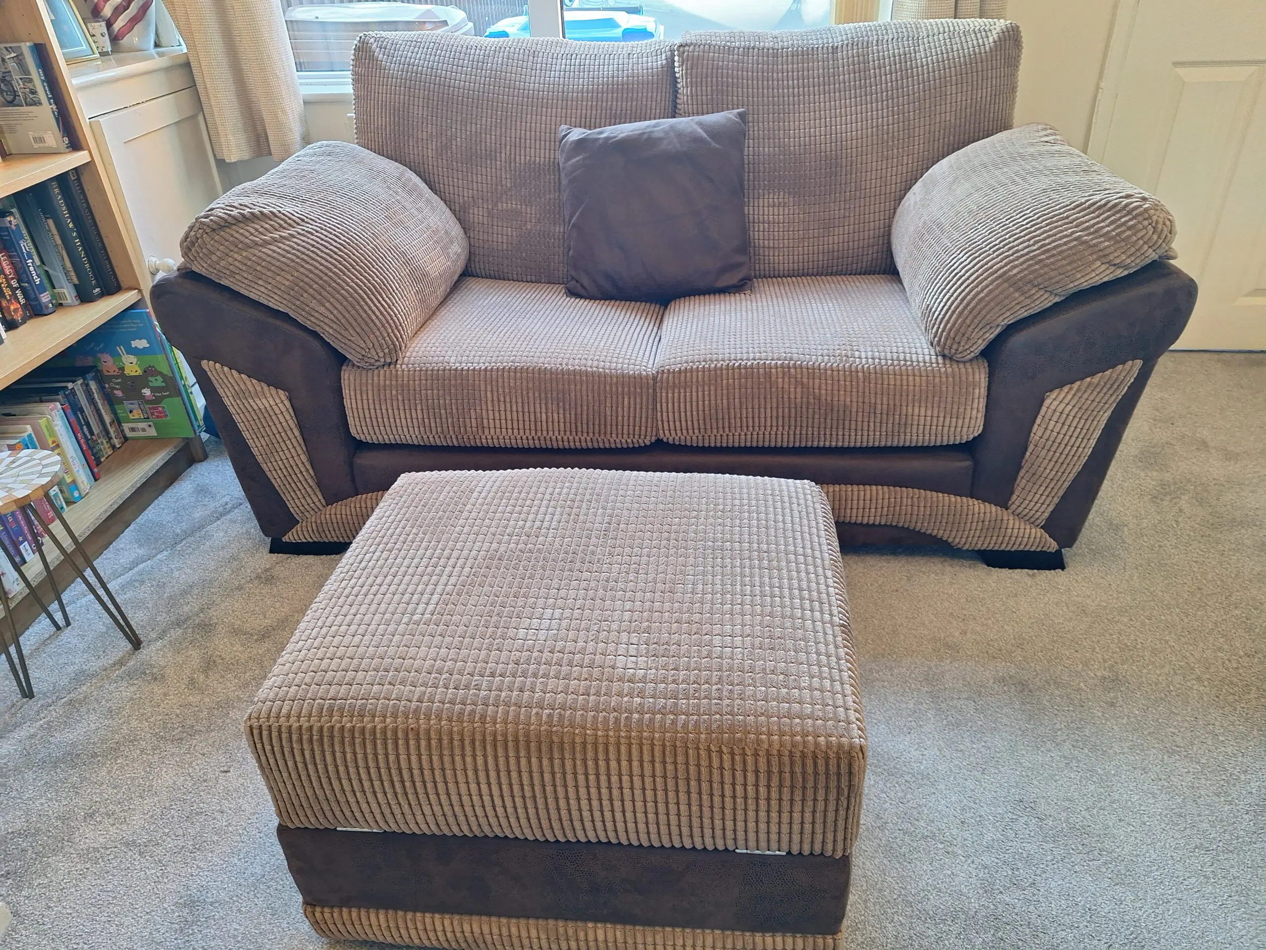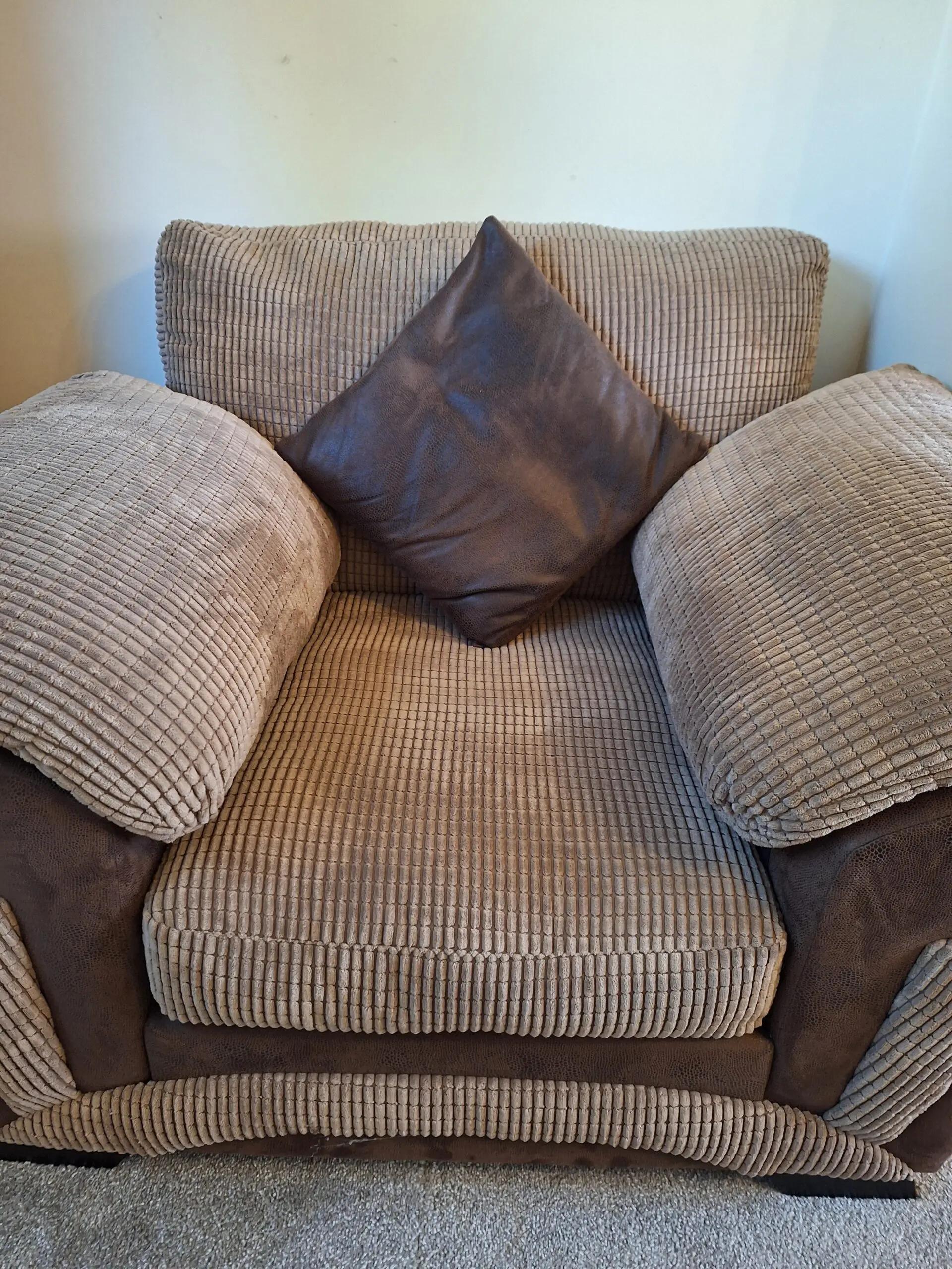 A 3 seater sofa, a 2 seater sofa, a chair and footstool all in brown suede with a brown leather trim. Very good condition.