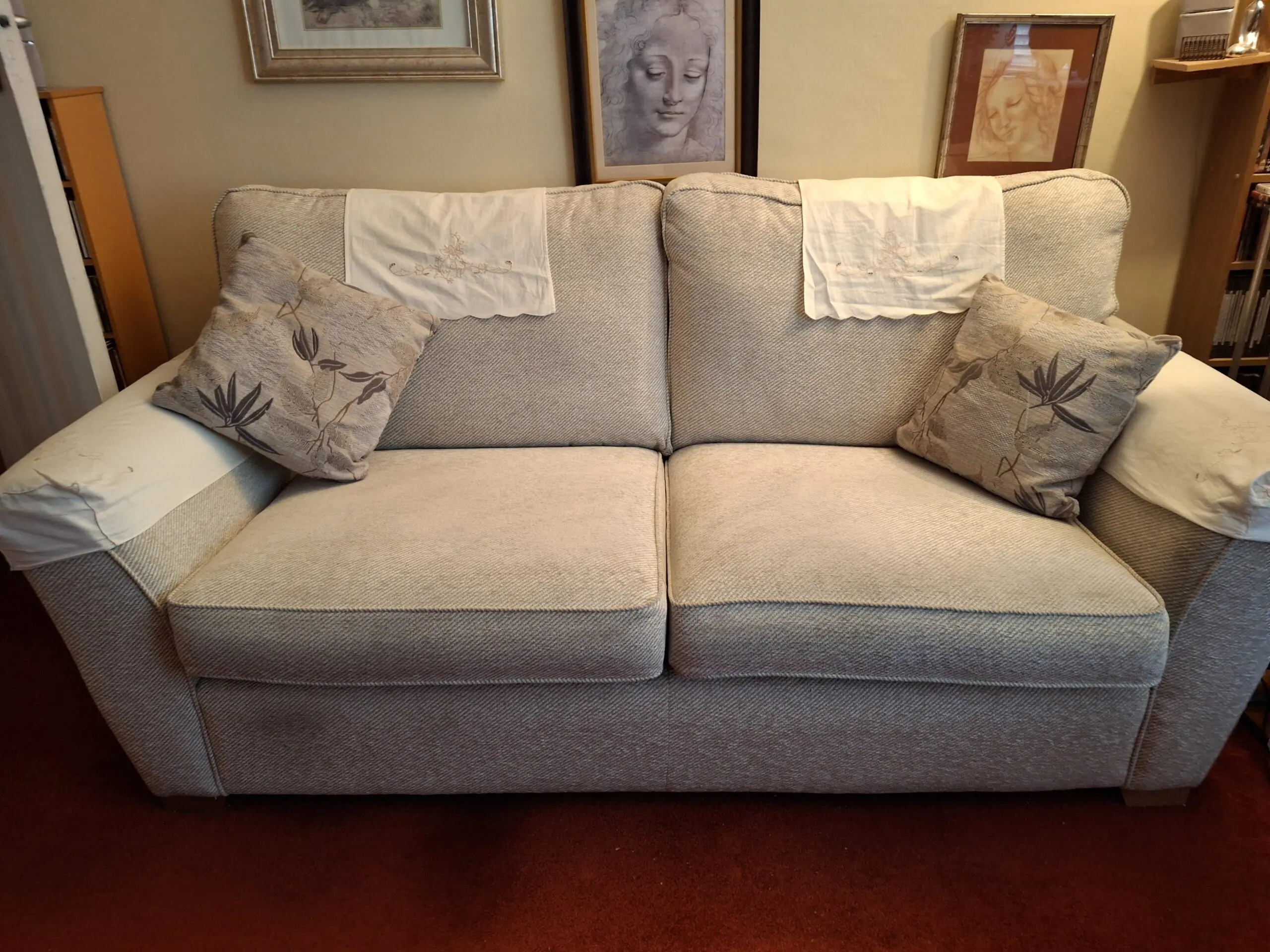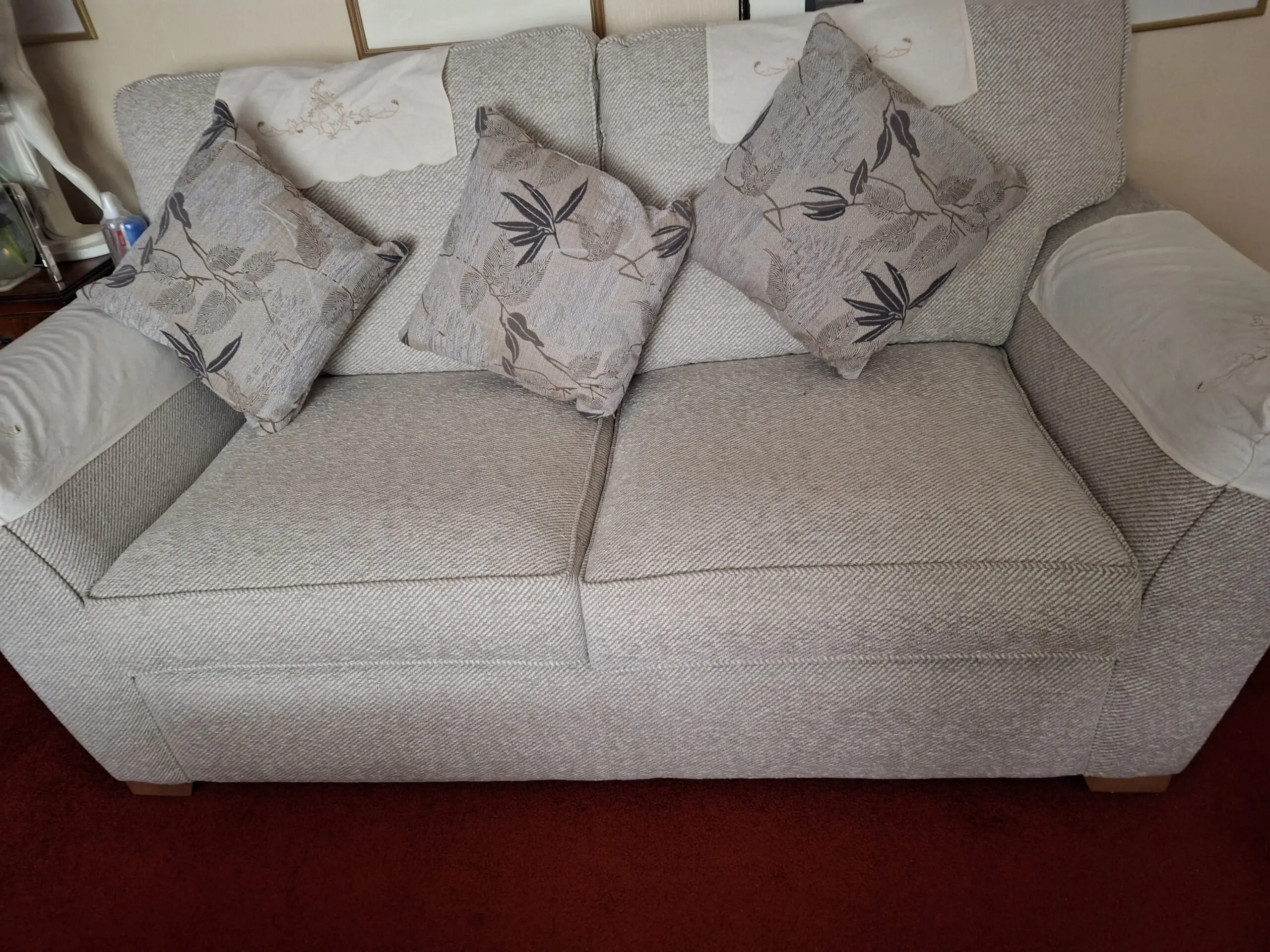 Well made sofas in good condition. 2 seater rarely used. Upholstery is attractive oatmeal heavy weave fabric with toning patterned cushions. Head rest and arm covers used to protect and keep clean. Mobility issues force sale.