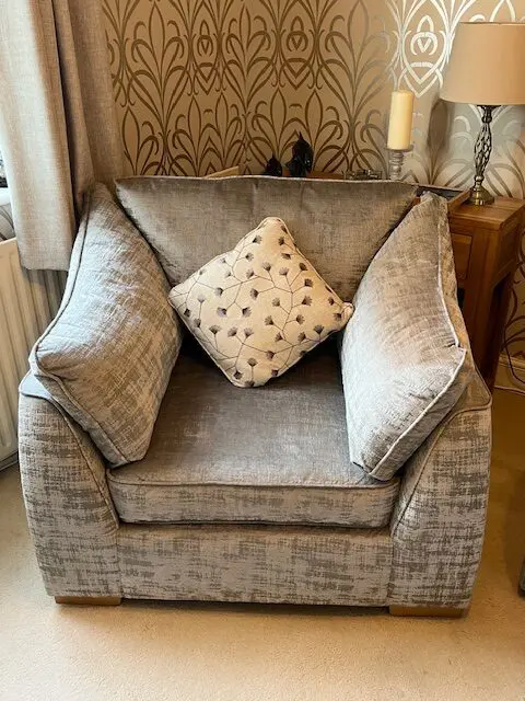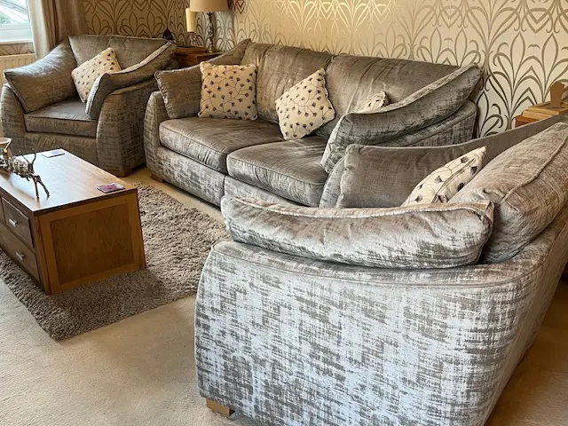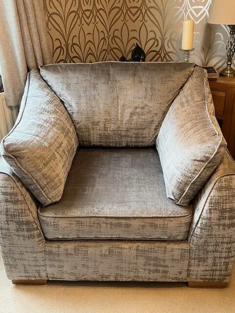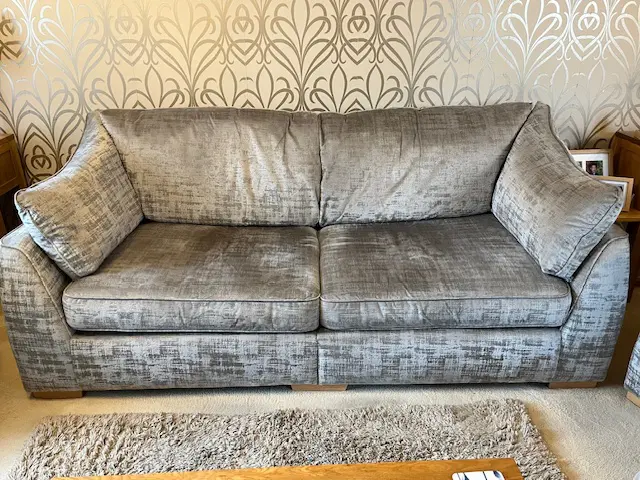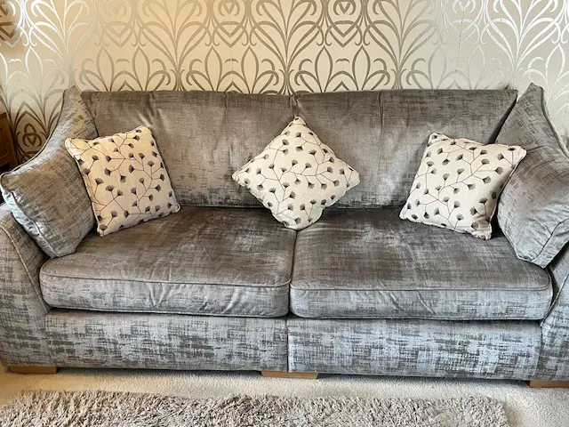 Silver grey 3 seater split sofa and 2 arm chairs 2 years old. Sale due to down sizing. Excellent condition. The split sofa is for ease of transportation and getting into rooms and through doors.