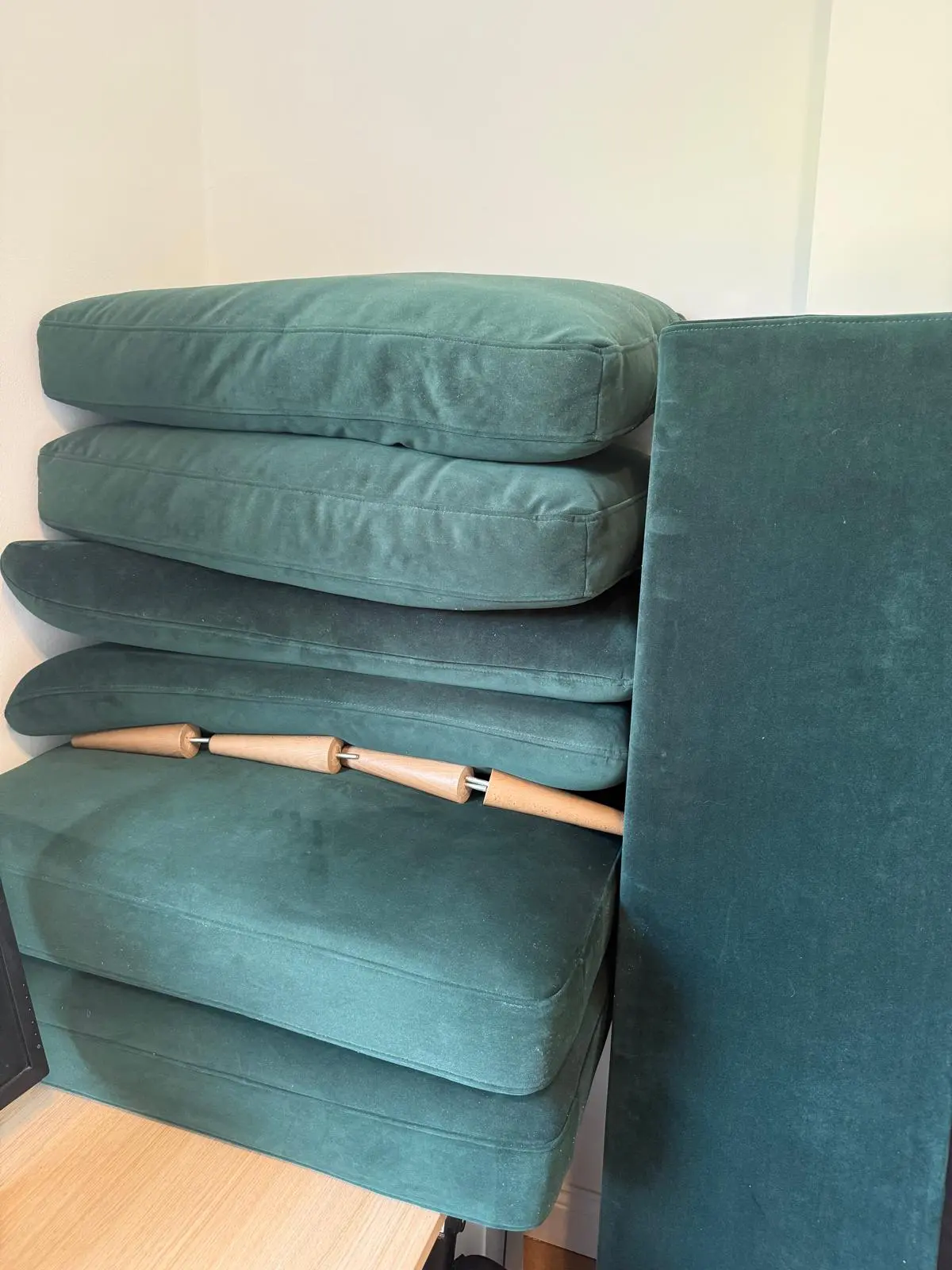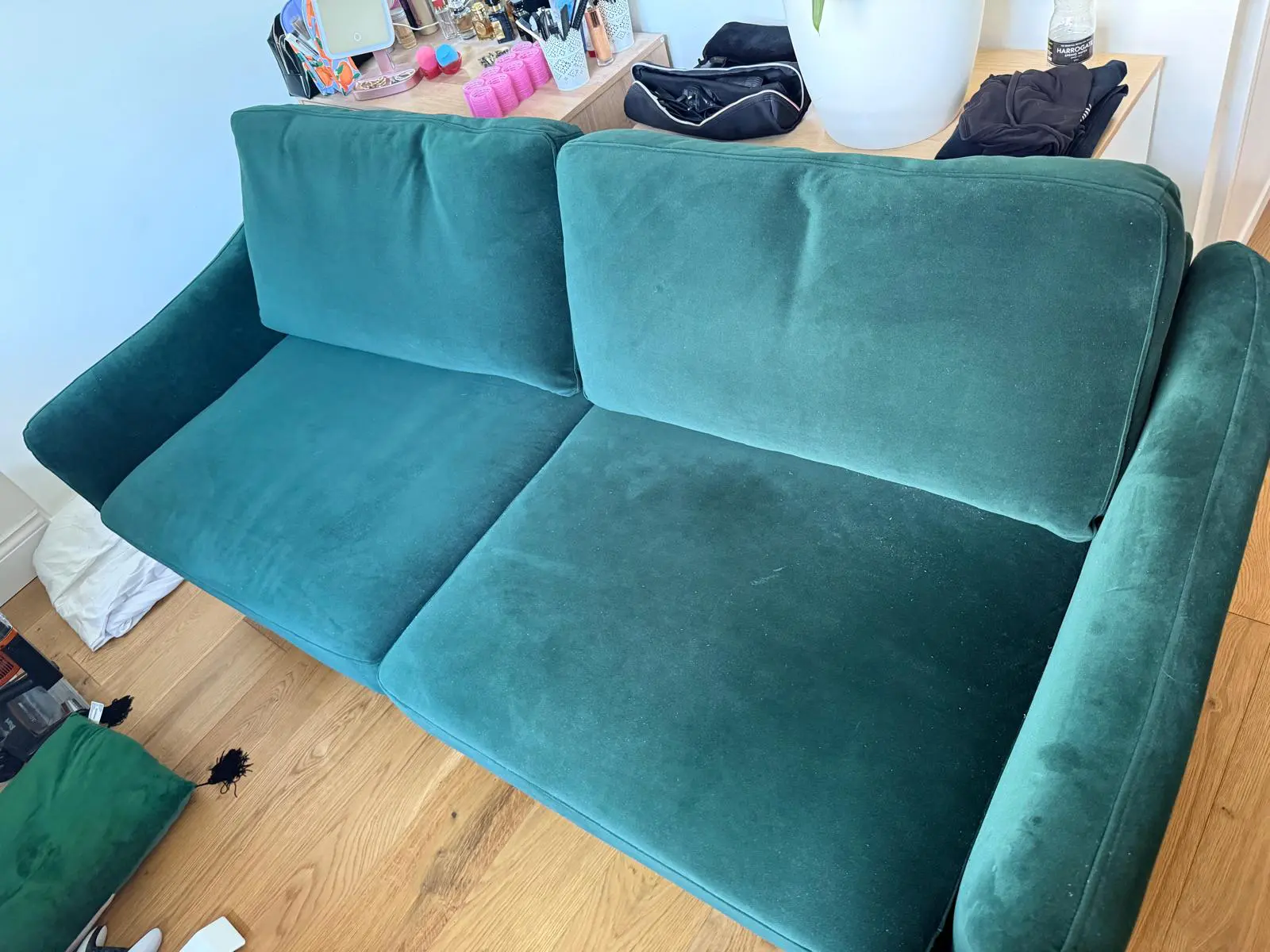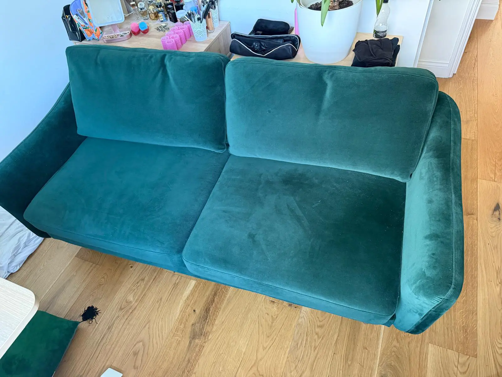 In very good condition. From home with no pets or smokers, bought new in July 2023. No rips or tears. Comes apart easily as shown and very easy to assemble. Slight dents at top of back cushions in photos just due to them being stacked as shown in the 3rd photo when storing recently. Wooden legs as shown in 3rd photo as well (apologies, had to reassemble for the photos in a very cramped spare room!).