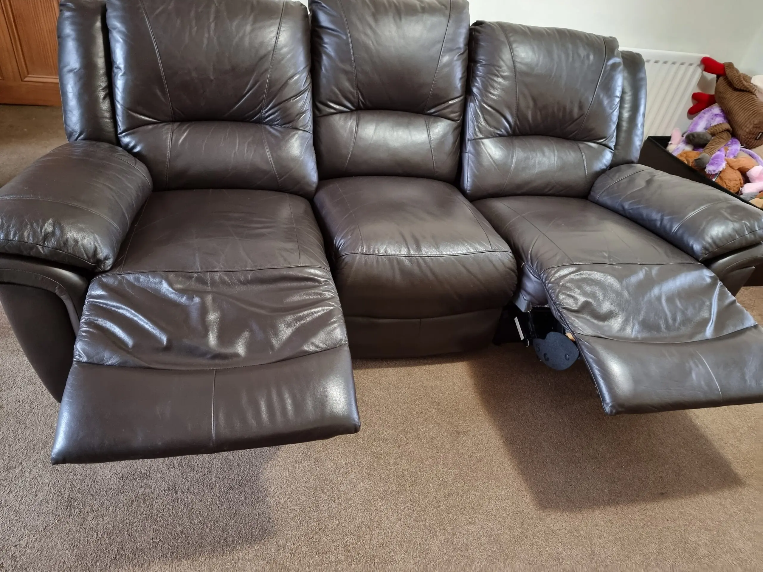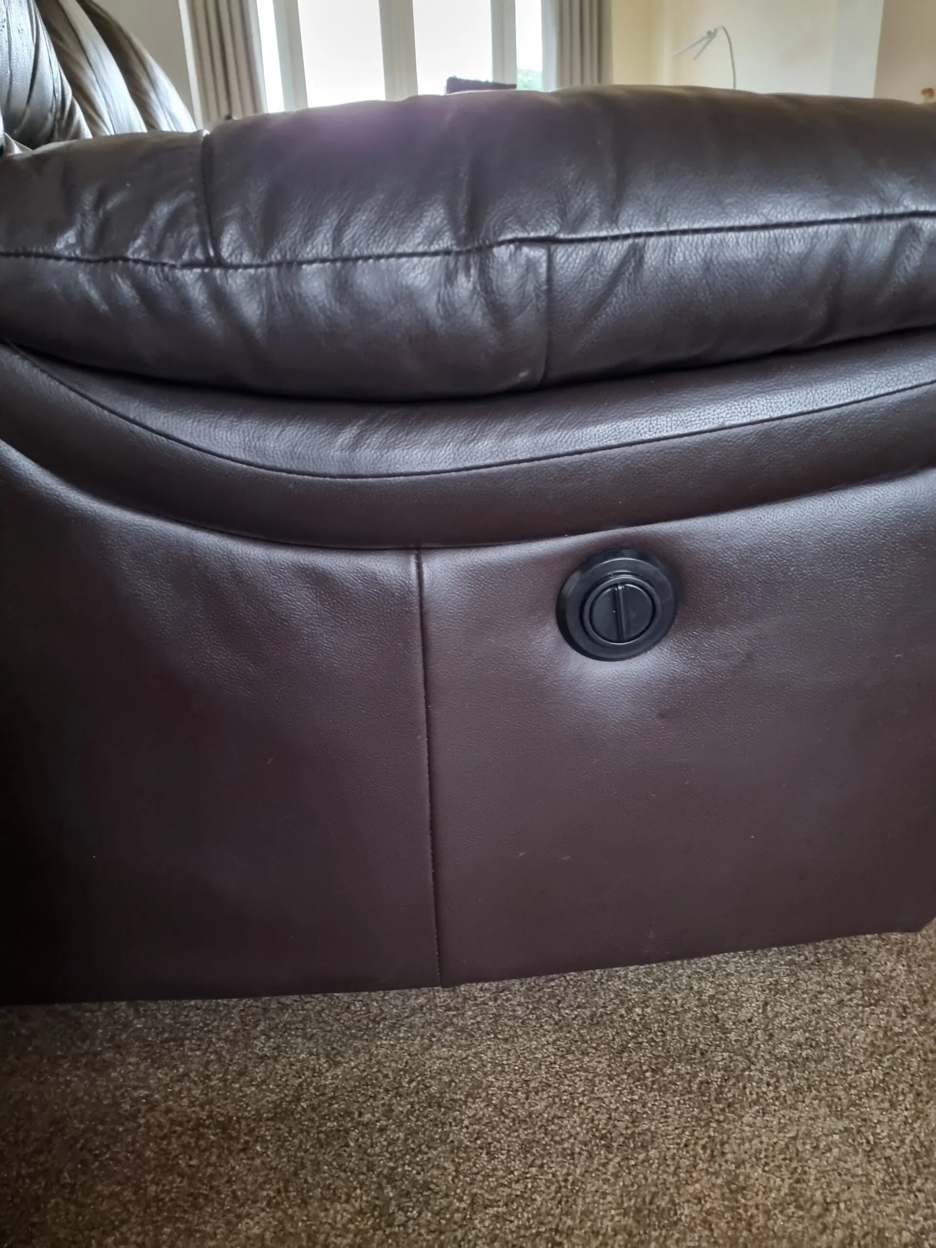 3 seater brown leather electric reclining sofa it does have a few marks on it full working condition it does have come apart for transporting the last picture is underneath the recliner apart doesn’t affect the use £50