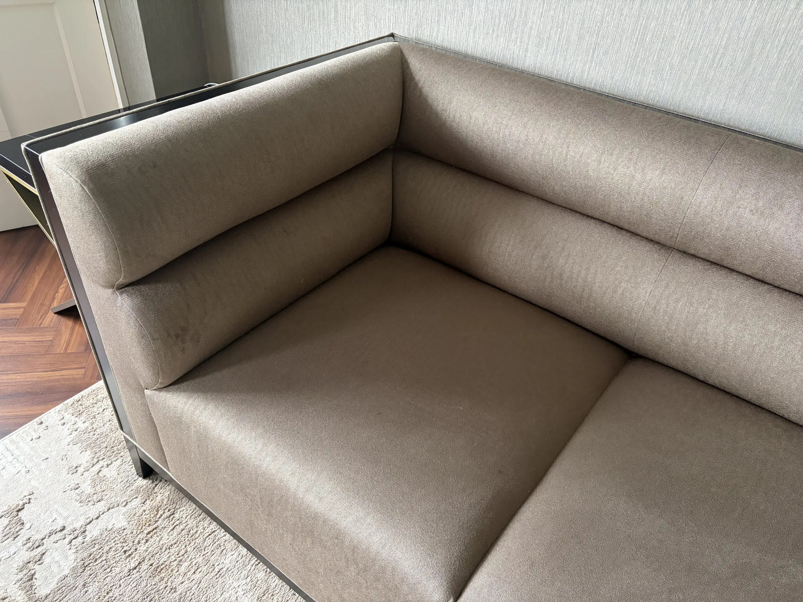 A very contemporary, luxurious sofa in an elegant bronze coloured textured fabric with black wooden legs.