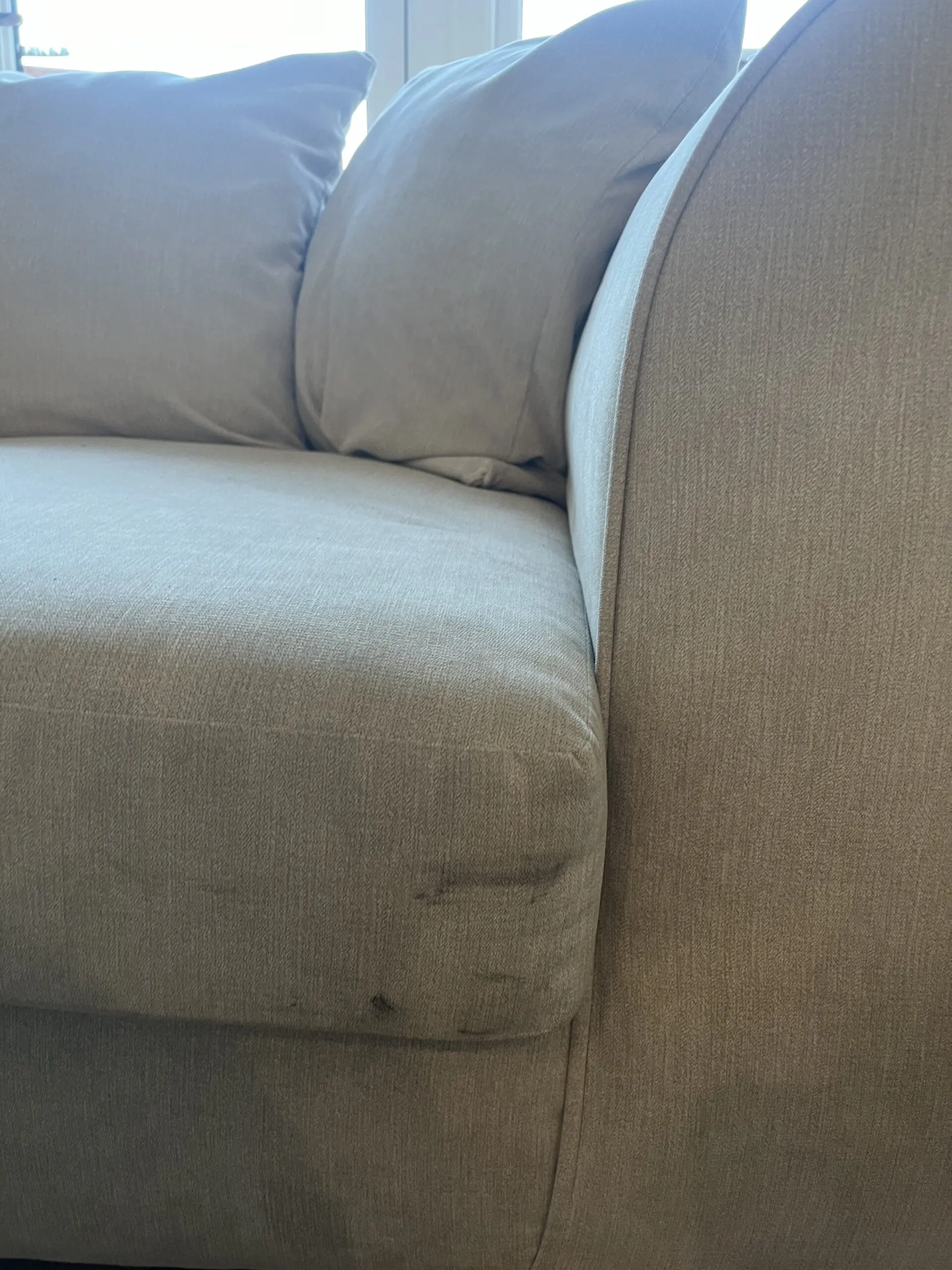 Beige sofas, a 2 and 3 seater from Sofa Club (https://sofaclub.co.uk/products/chelsea-3-2-set-stone-alone-relaxed-linen). They have some marks on them which may be able to be washed out, but they still look really nice in a room. Really comfy and stylish!