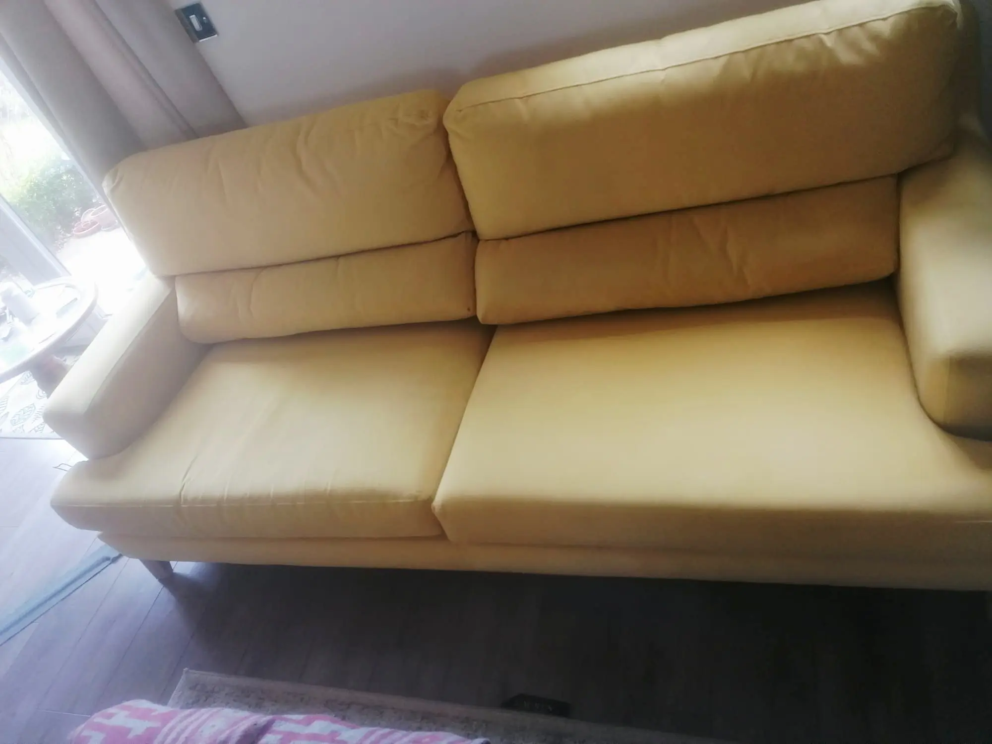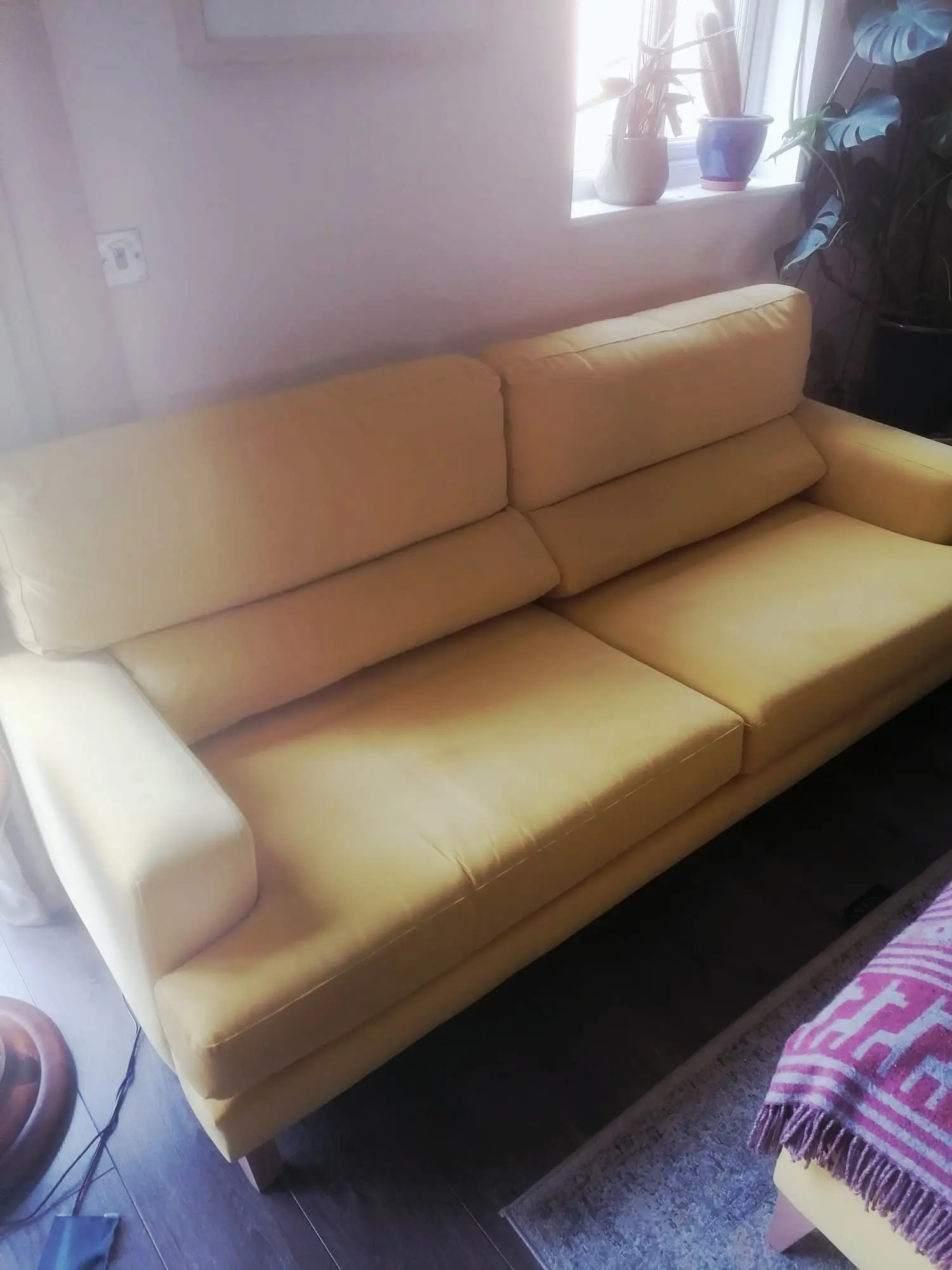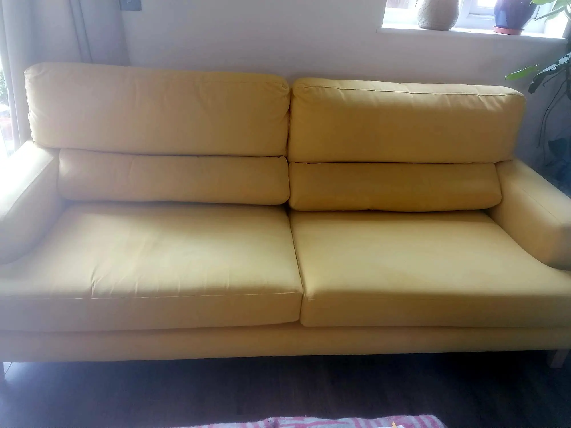 Sofa Suede Three- Seater Yellow From Furniture Village Smoke and Pet-Free Home. Pick up from Lancaster LA1 only. Beautiful sofa. Selling due to redecorating. See image for dumensions.