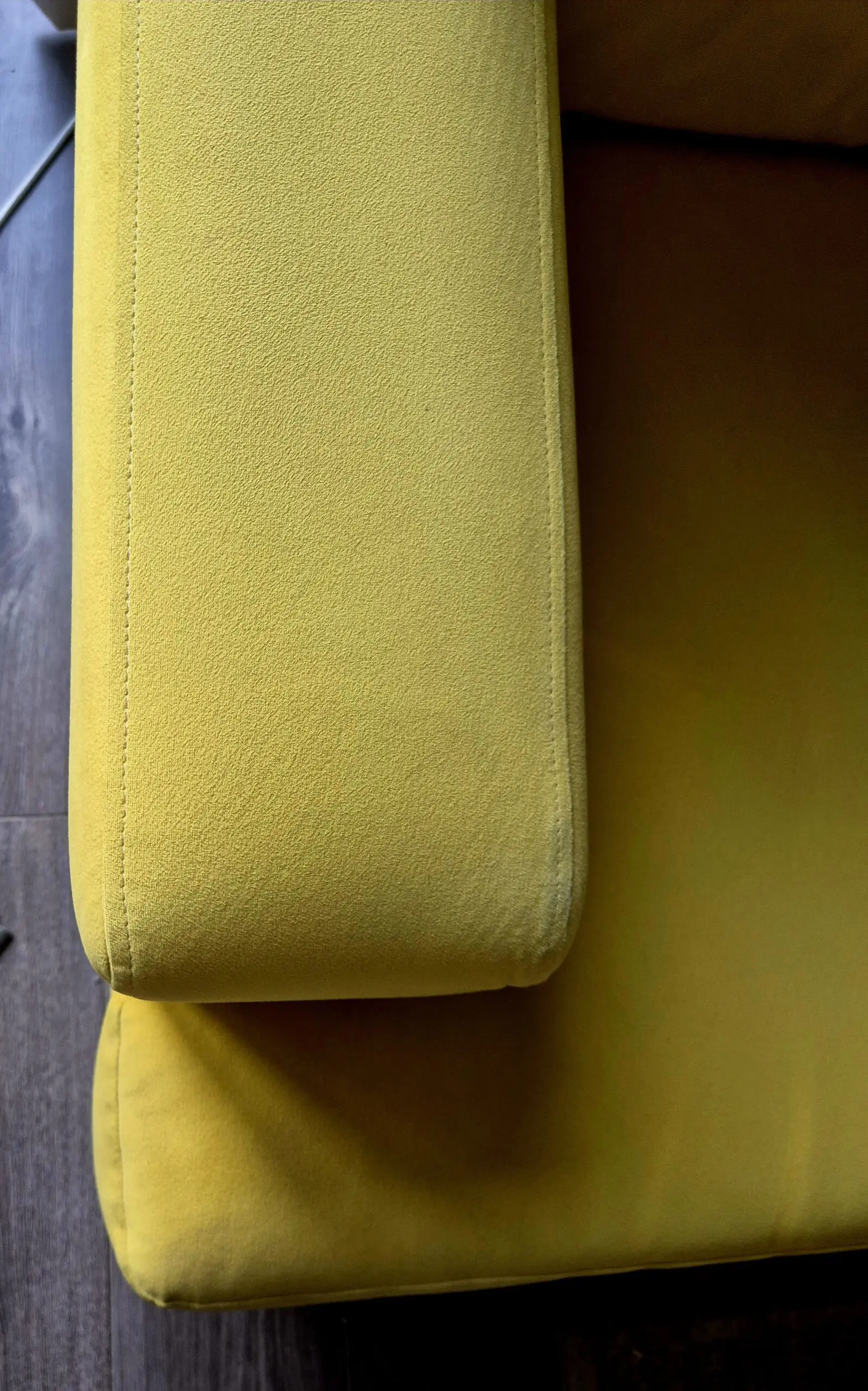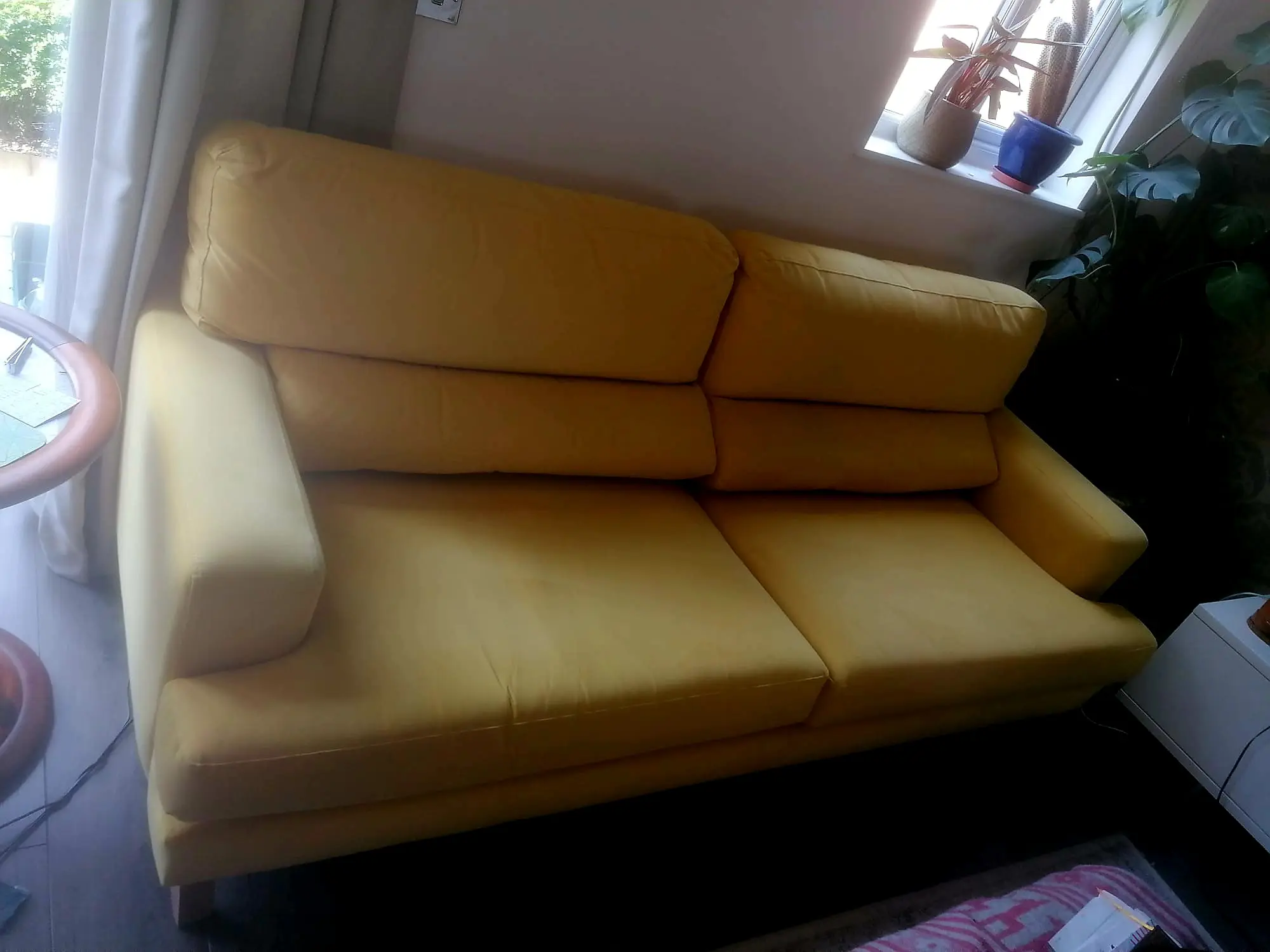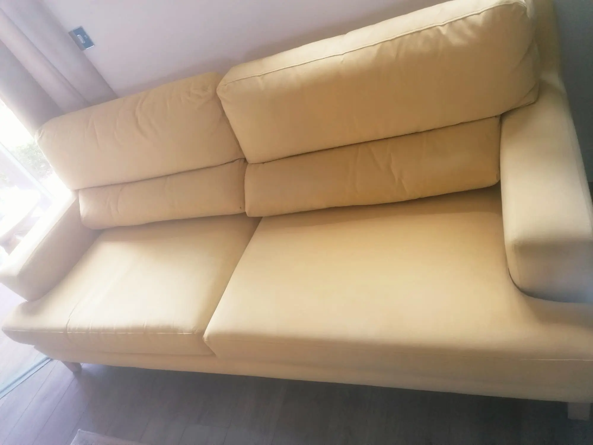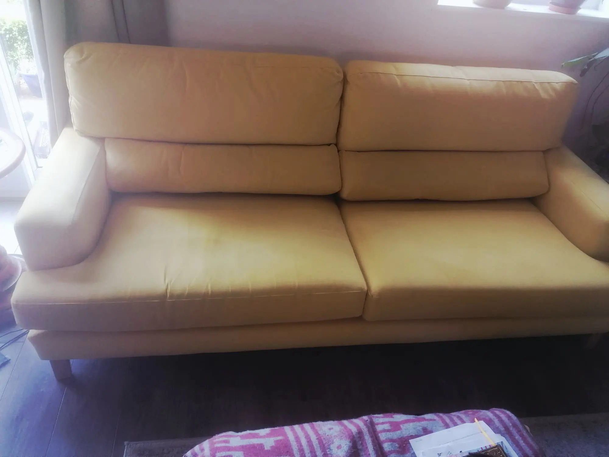 Sofa Suede Three- Seater Yellow From Furniture Village Smoke and Pet-Free Home. Pick up from Lancaster LA1 only. Beautiful sofa. Selling due to redecorating. See image for dumensions.