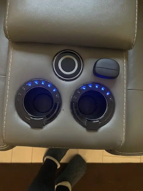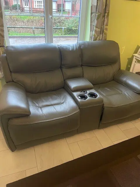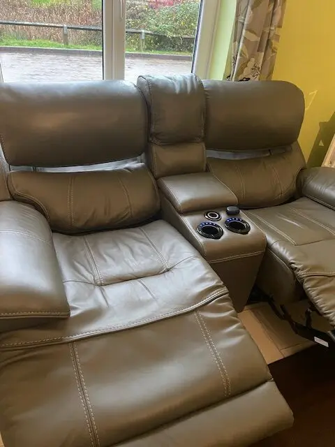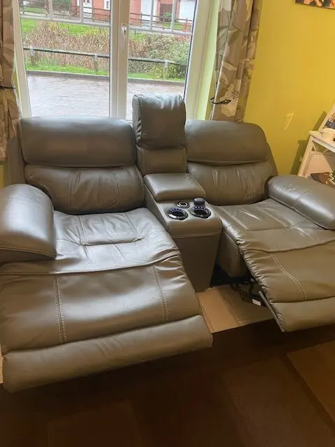 This is a TechSofa Pro Series 7 with 2x 13a plug sockets, console with storage, 2 power recliners, 2 power head rests, a wireless charging pad, 4 USB charging points, bluethooth speakers, cooling cupholders and seat heating in a grey leather. The sofa has very smooth reclining motions and is very comfortable