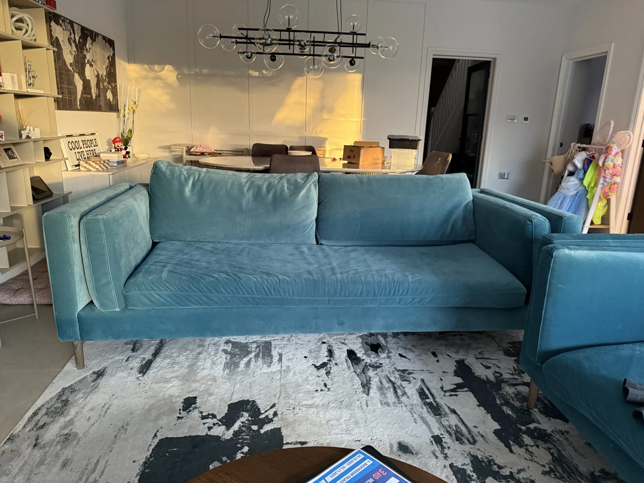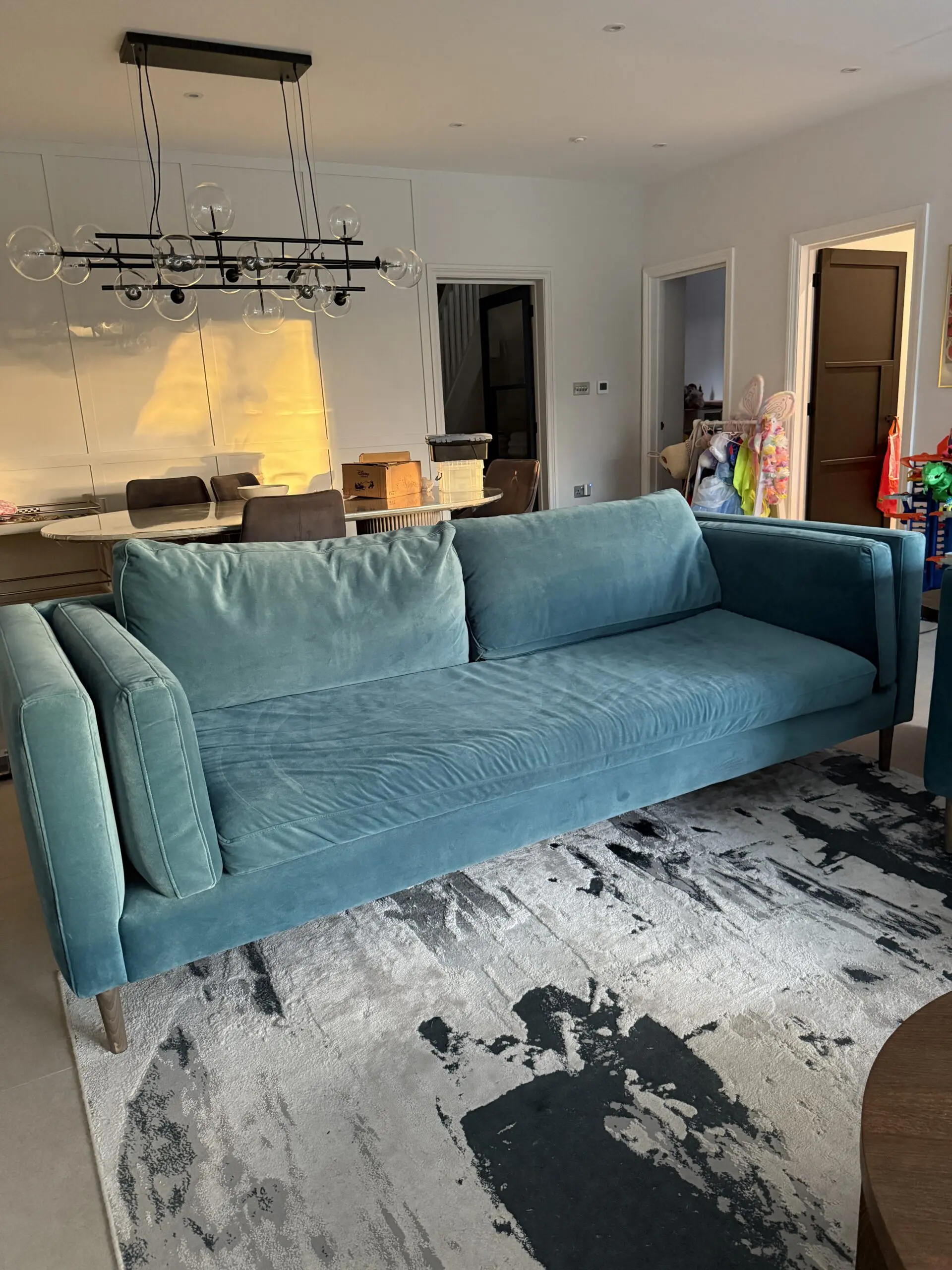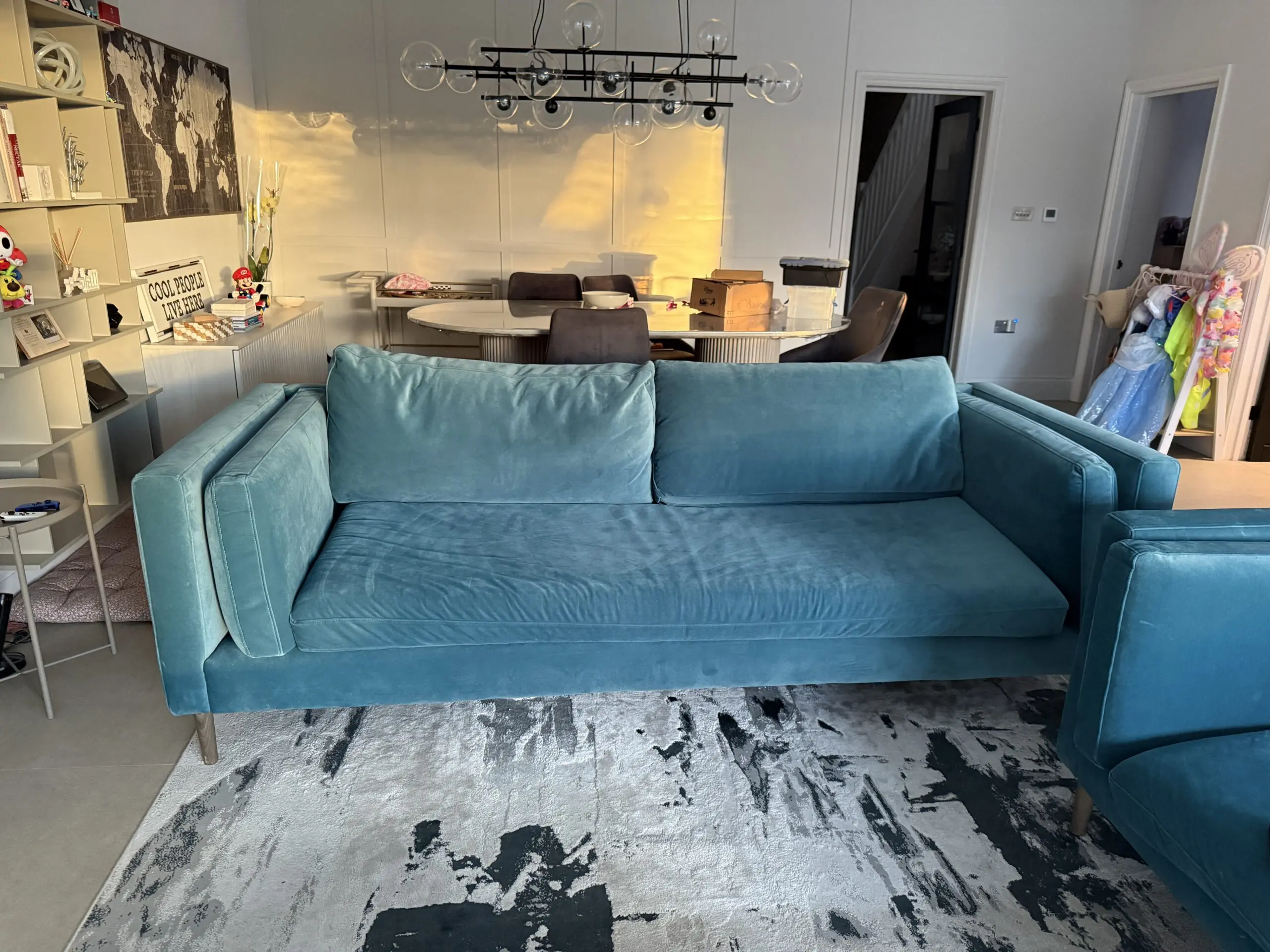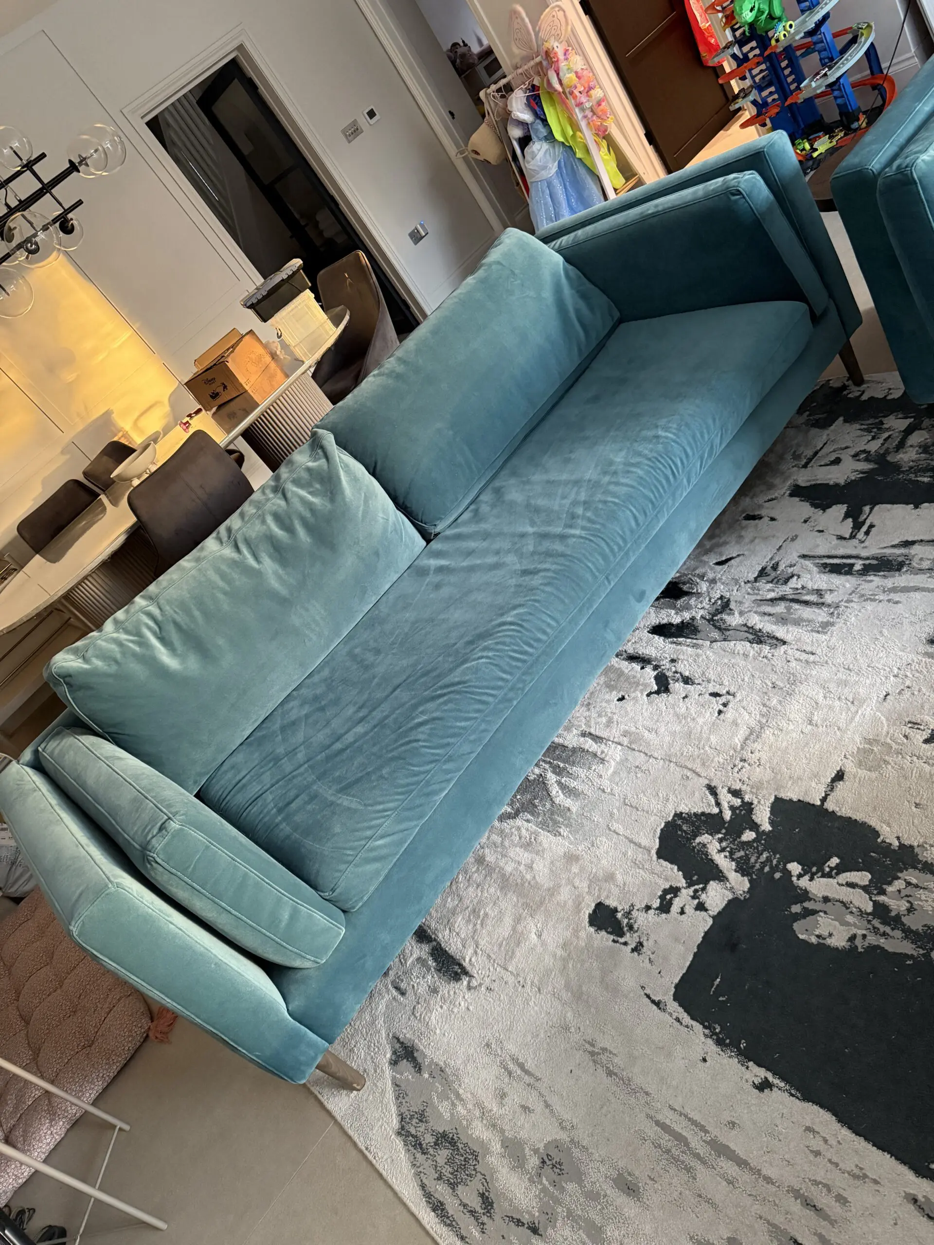 Excellent clean condition. Very comfortable. Medium firm. Bought from sofa workshop in Chiswick. Beautiful teal velvet. Covers are washable.