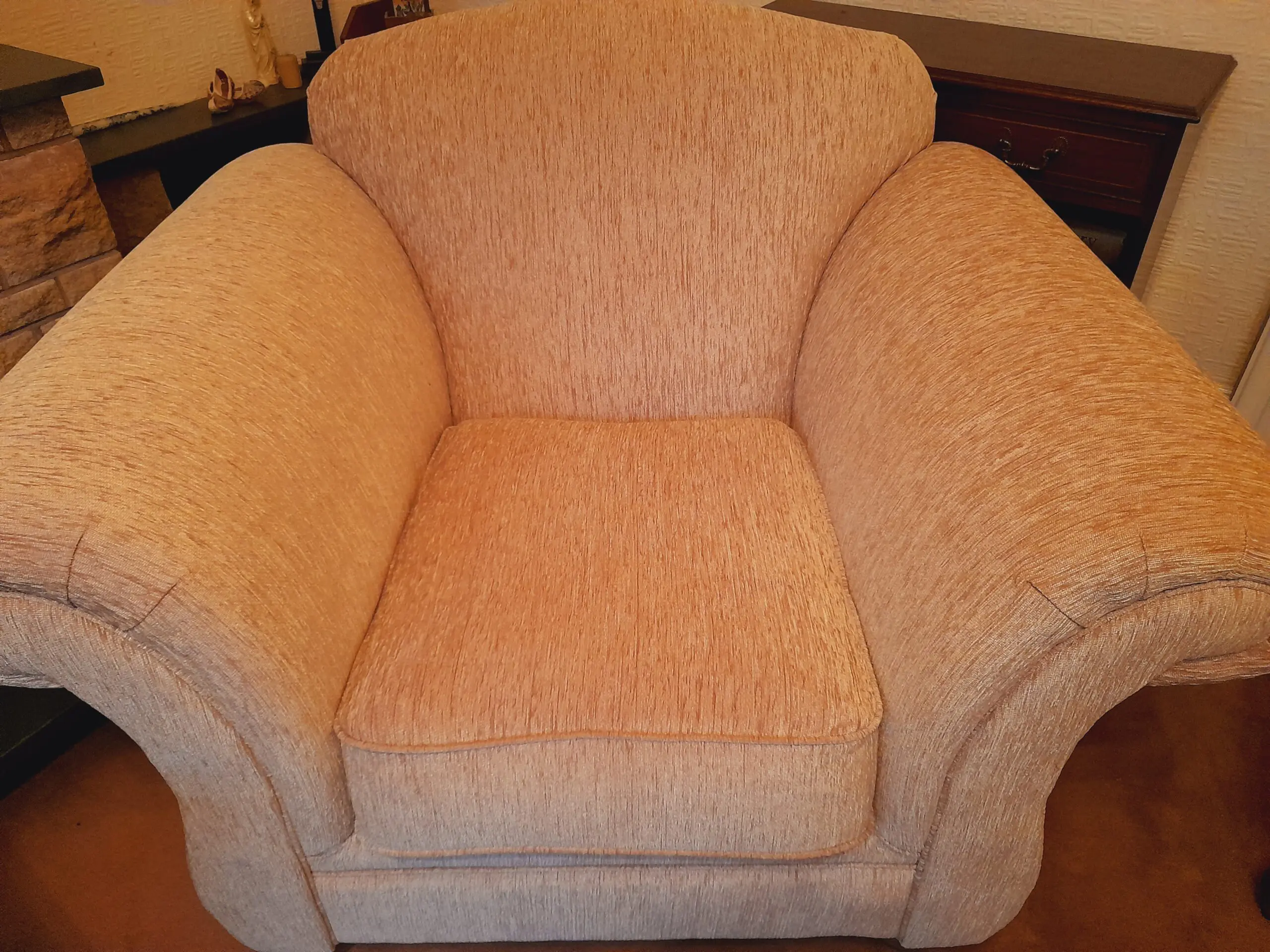 An almost new, perfect condition 3 seater sofa and chair in soft gold colour. The photo doesn’t show the colour “saffron” properly and the brochure is much darker than the soft gold. Genuine reason for sale .No stains, no defects, barely used. My phone photo doesn’t do it justice. The sofa alone is currently in the half price sale brochure at 859 pounds but I am selling 750 for the sofa and chair together!