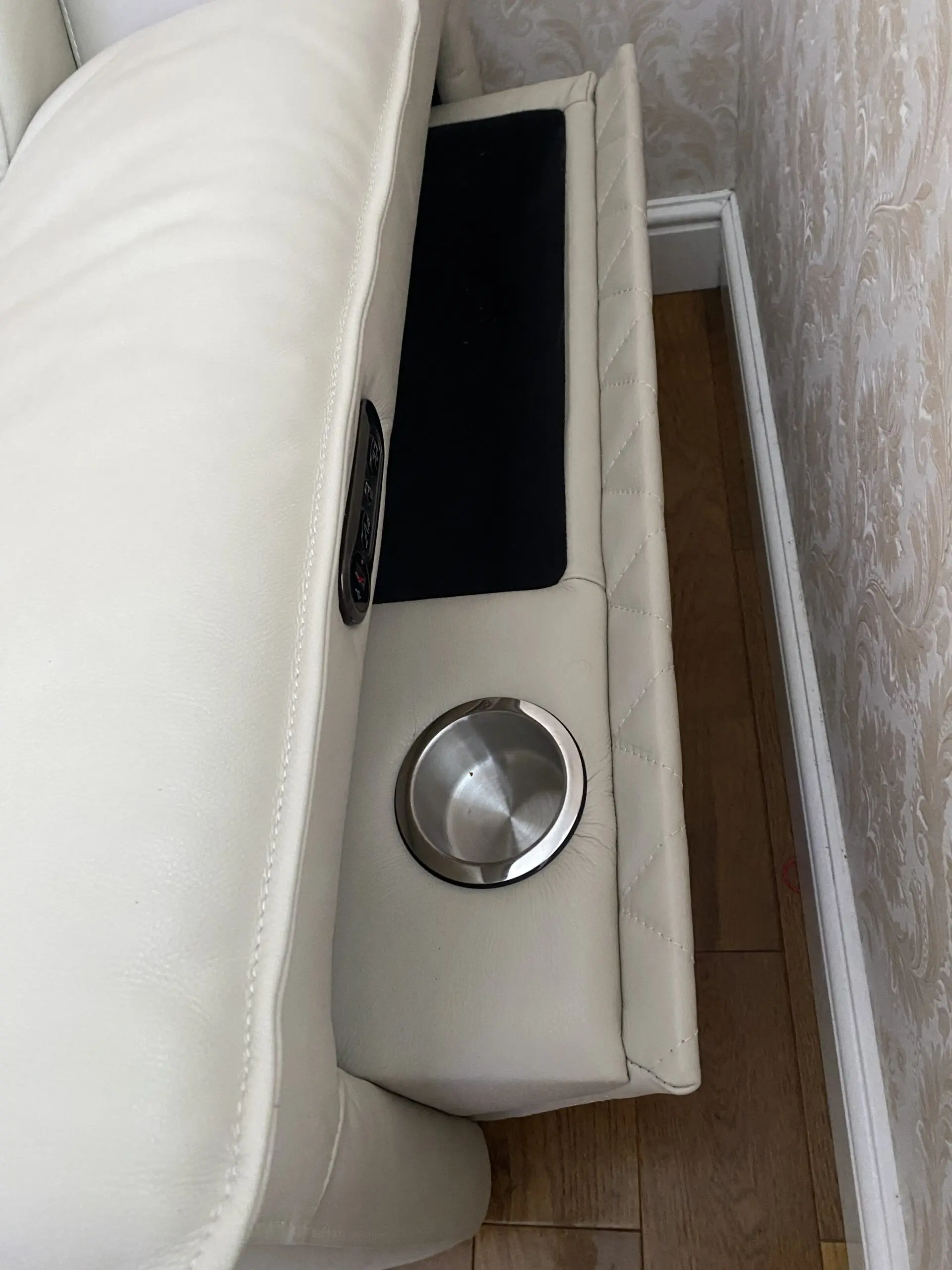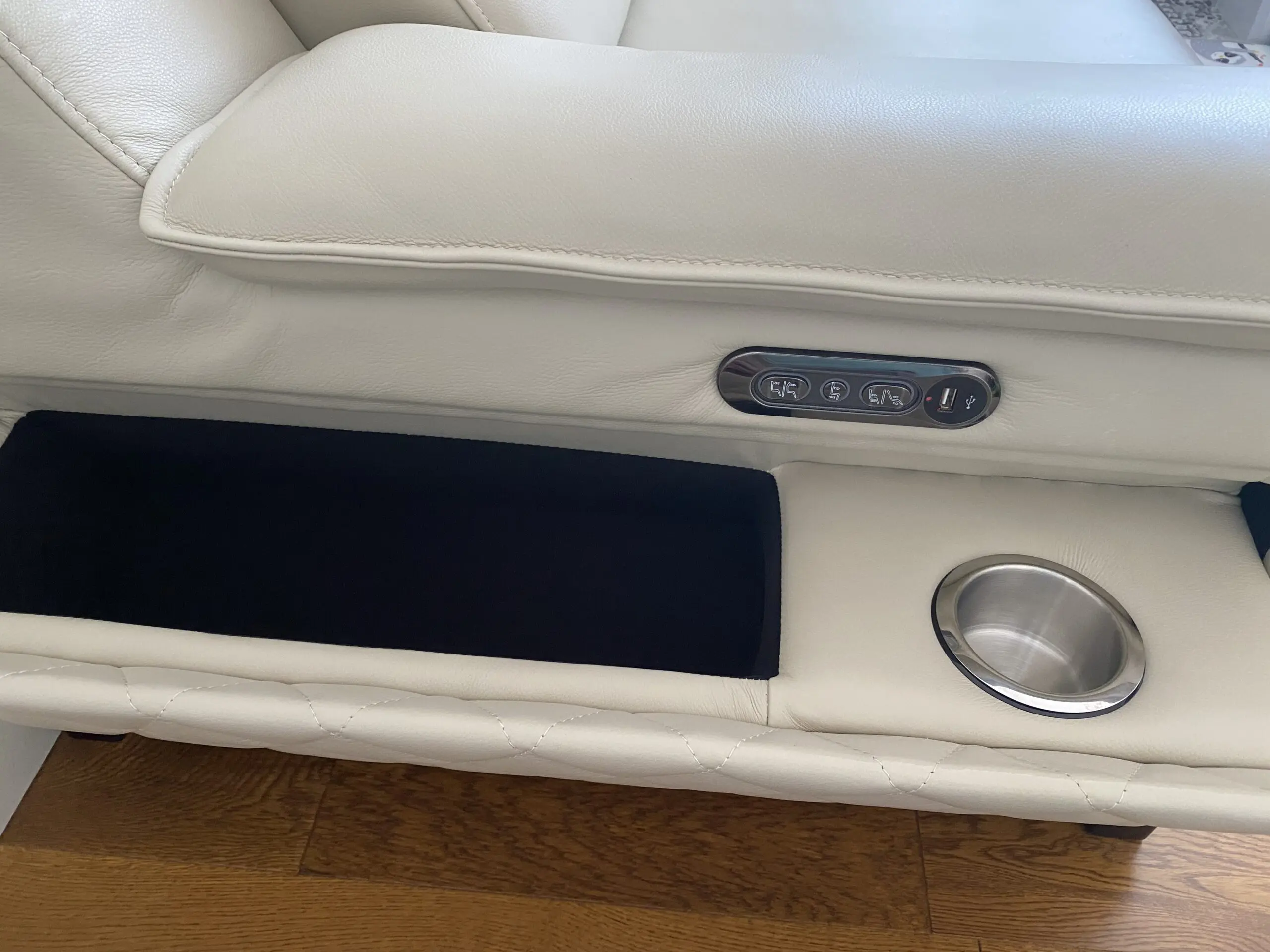Benz 3 seater double power recliner sofa with double power headrest in very good condition. Handcrafted, with handy storage and innovative recliner options, the Benz is made for tech-savvy relaxers who love to spend time on their sofa.