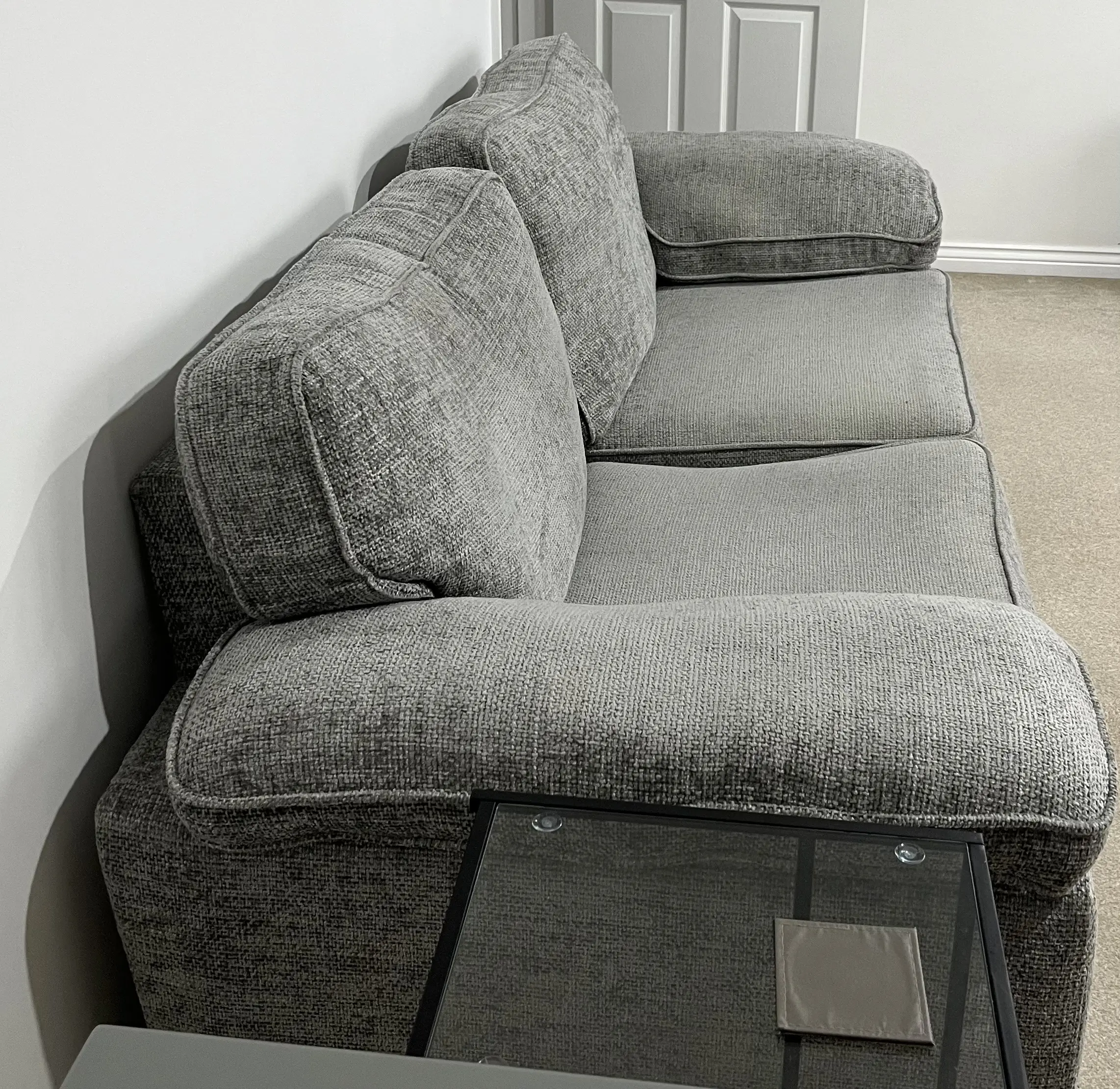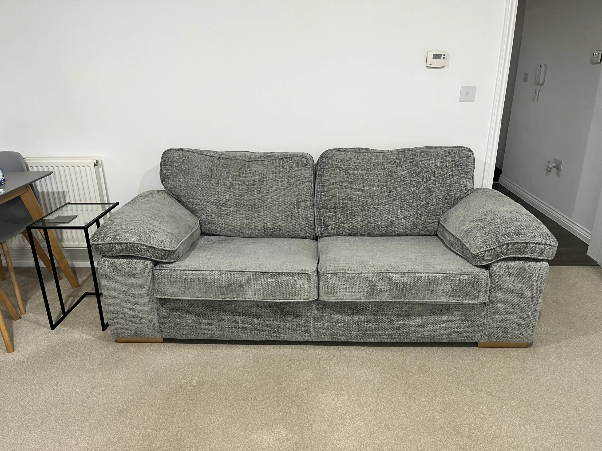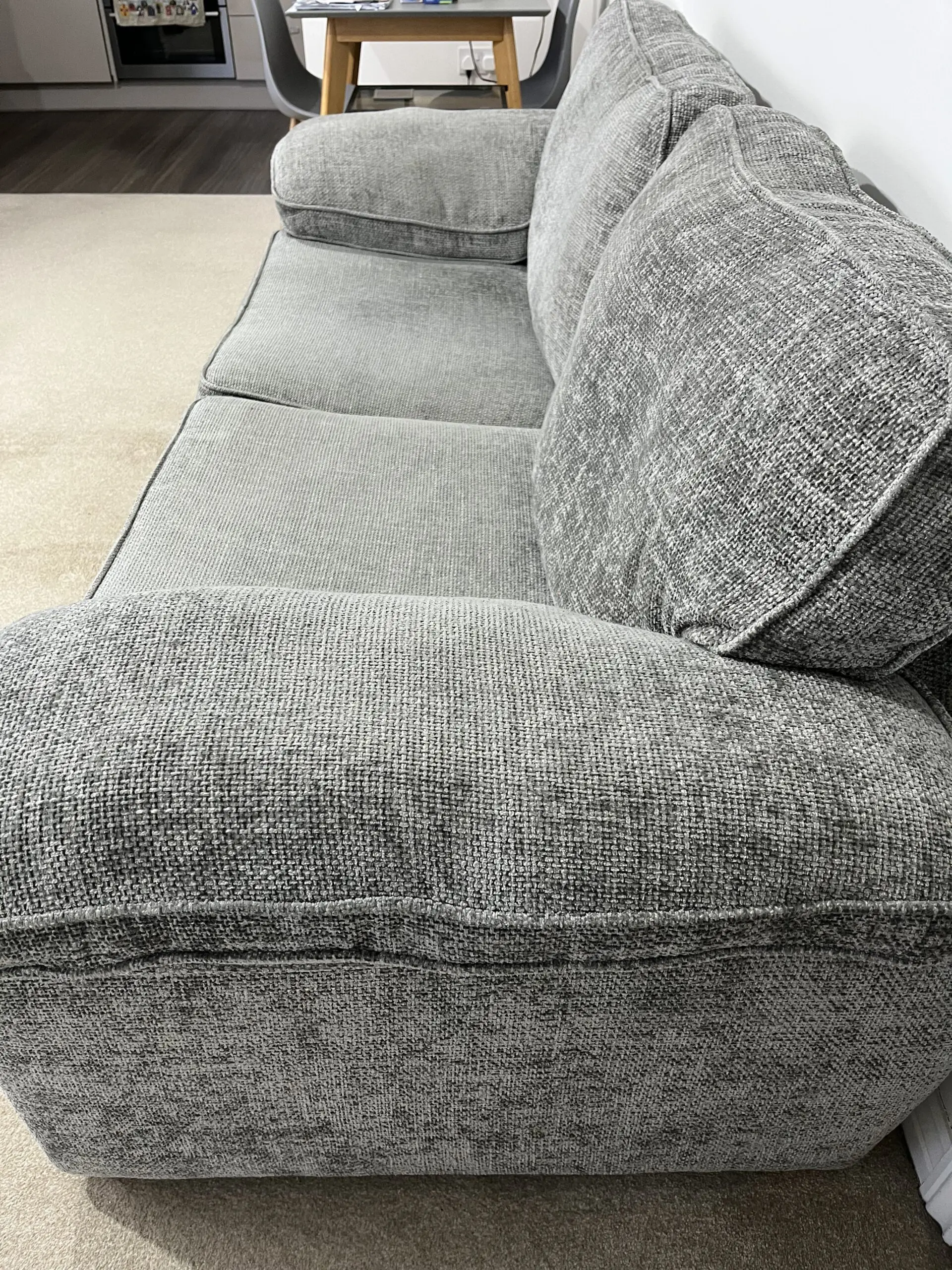 Purchased brand new in June 2023 – looking to sell by Mon 15th December if possible as relocating. Open to viewings and offers if you message me. Comes in the ‘Milo Pewter’ design with Oak feet.