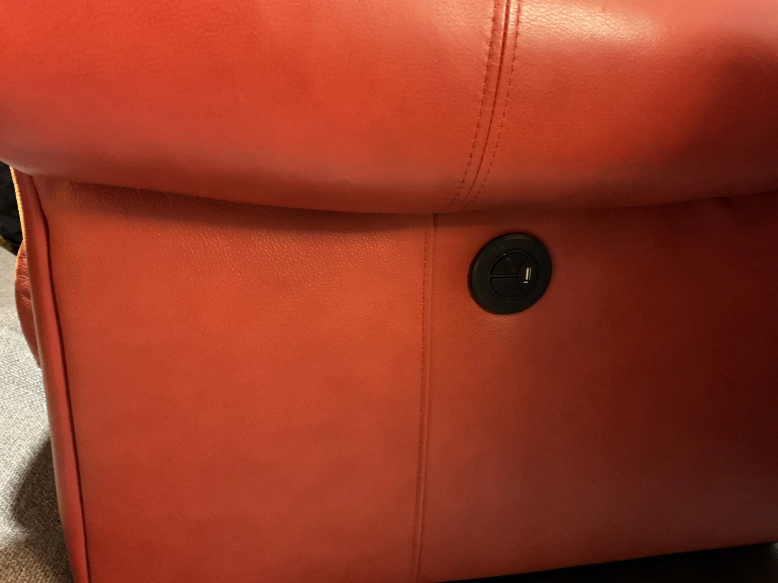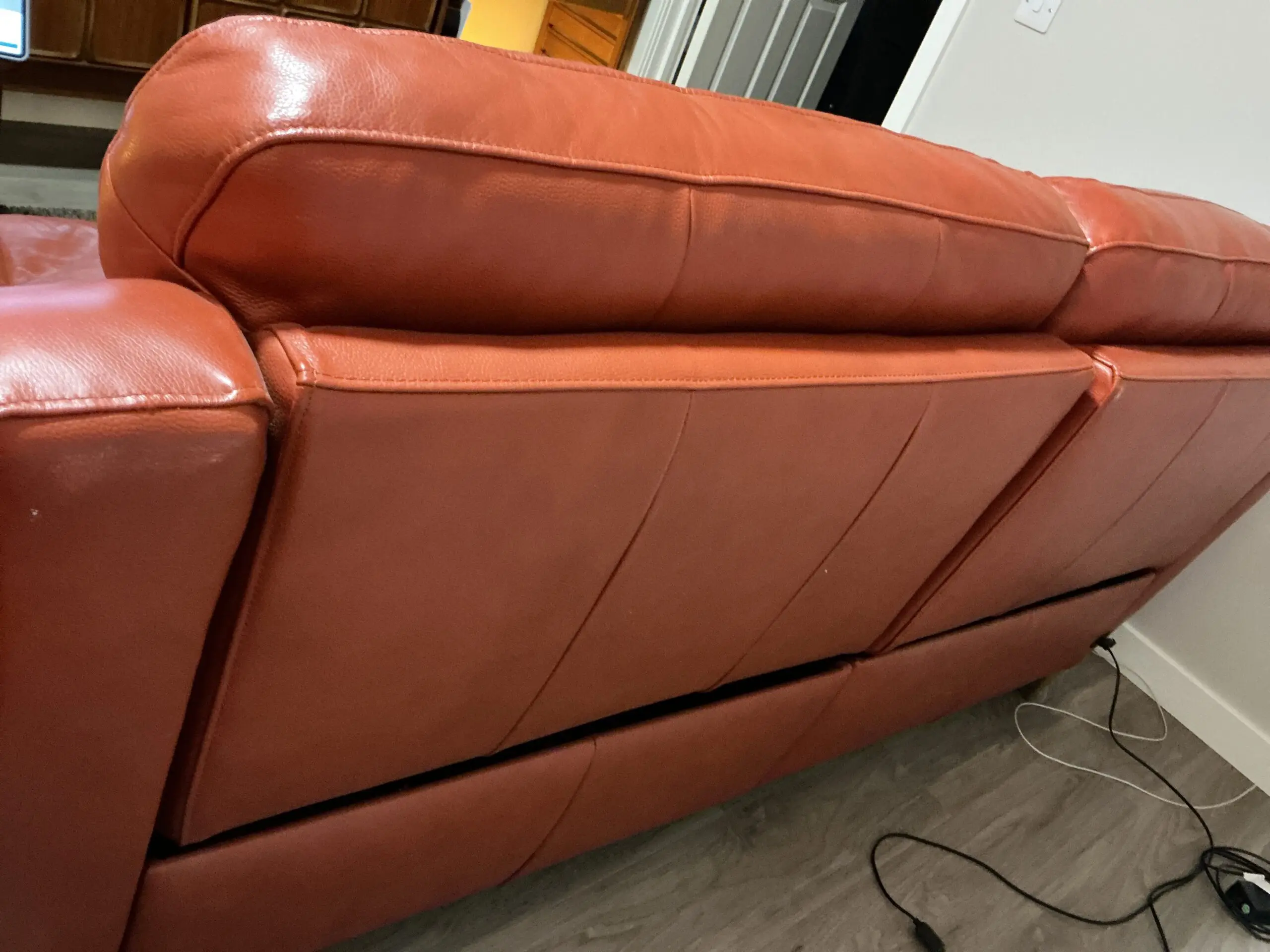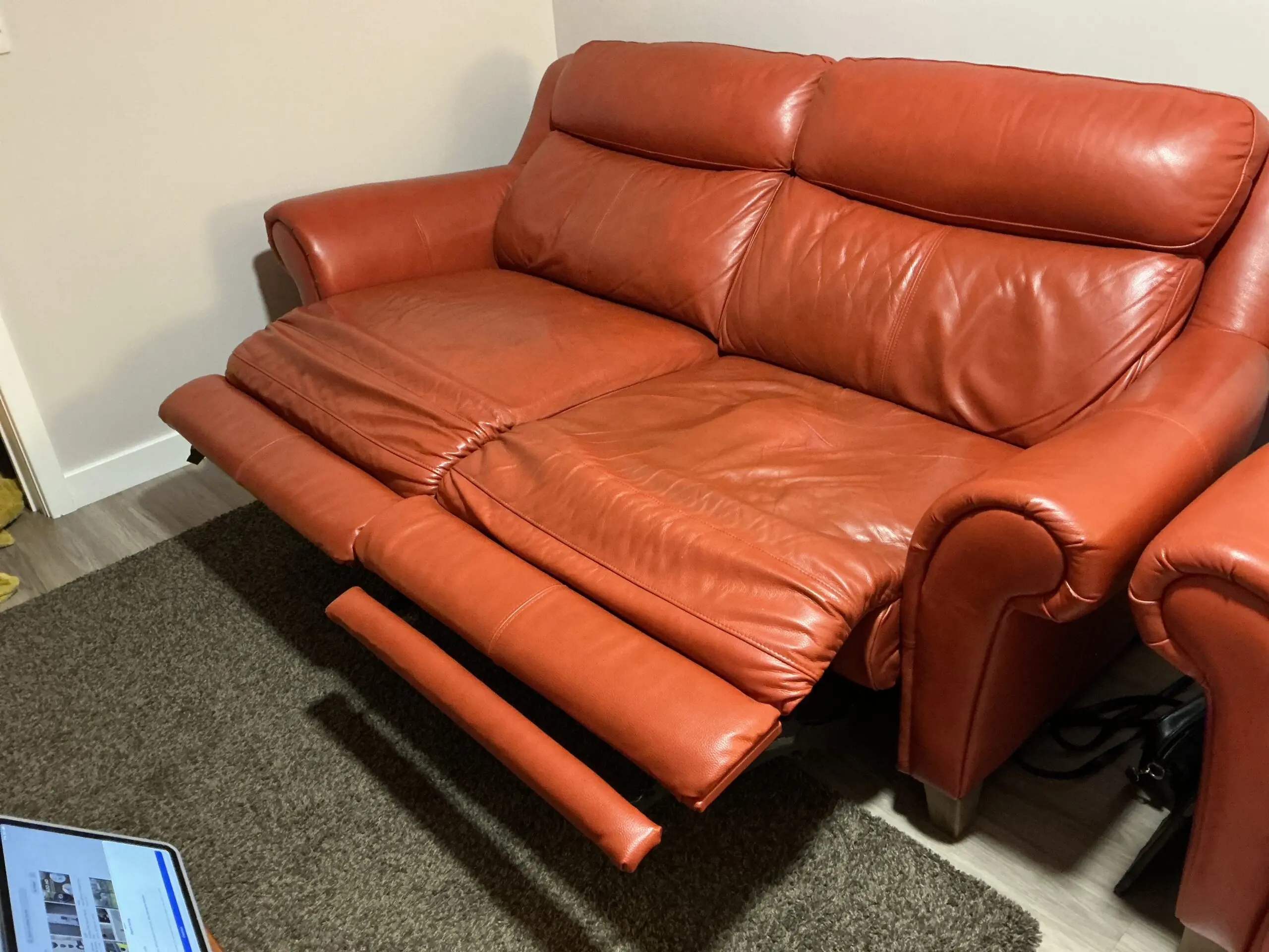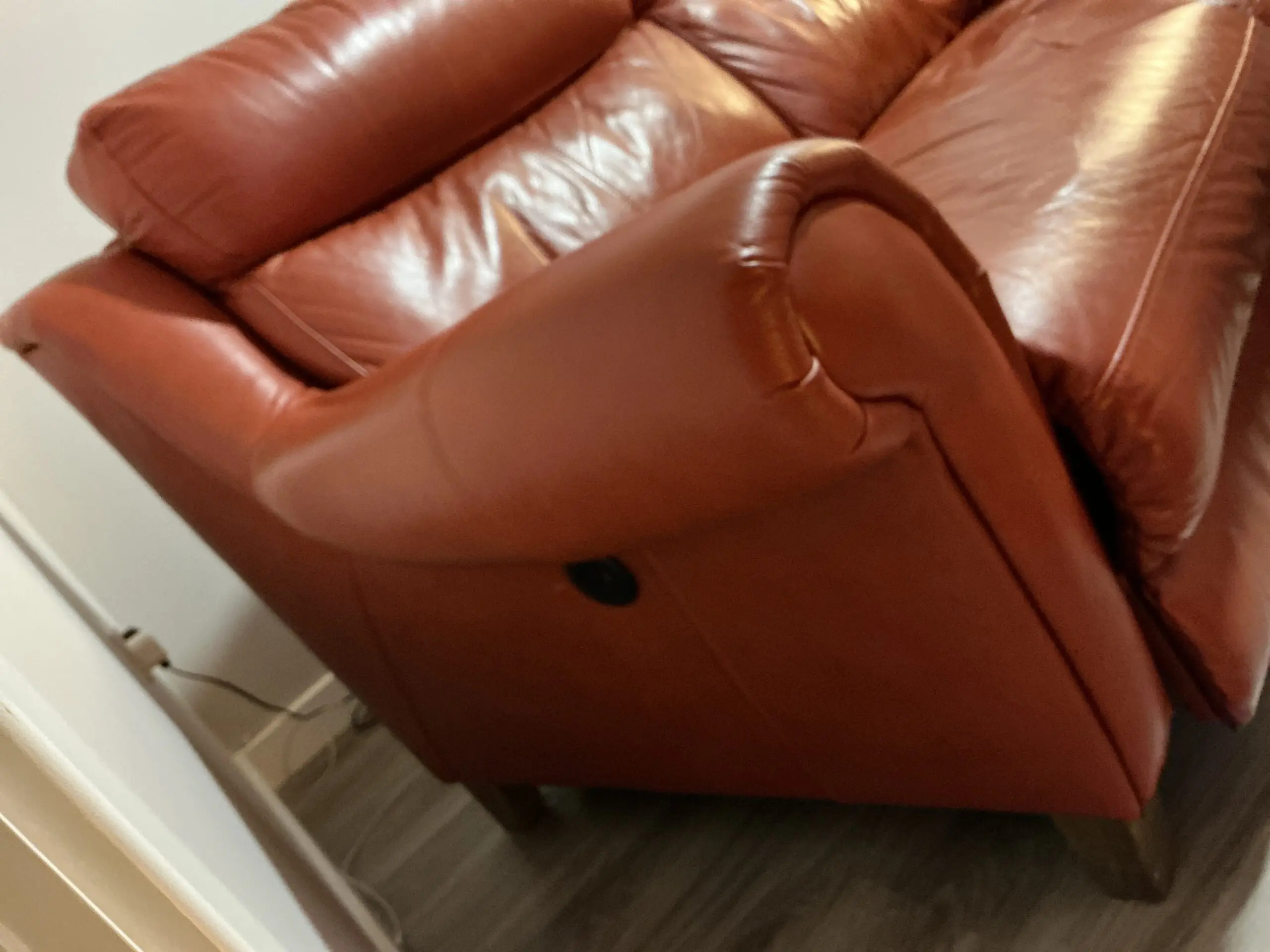 Sofology Holmes 3 seater double leather power recliner (colour flame). The colour is a deep burnt orange leather. Very comfortable seating. The sofa has been well used and therefore has some discolouration on the seats. The power recliner controls are at each outer side of each arm rest, the recliners are in full working order. The right sided seat has a bar missing from the bottom of the recliner which does not impact the function of use of the seat in reclining mode. There is also a USB port in built to the power controls in each arm rest, however these stopped working after 1 year, again do not impact the use of the sofa.the sofa has 4 wooden feet which can be screwed into position.