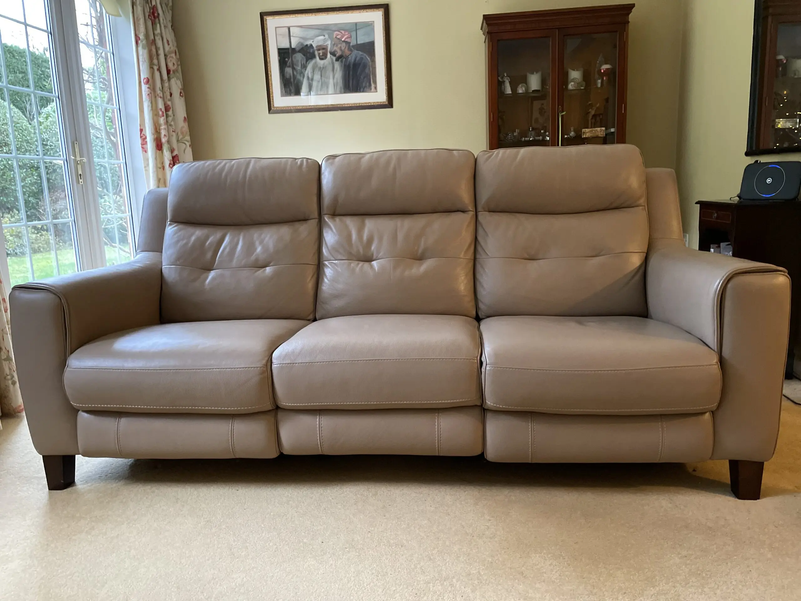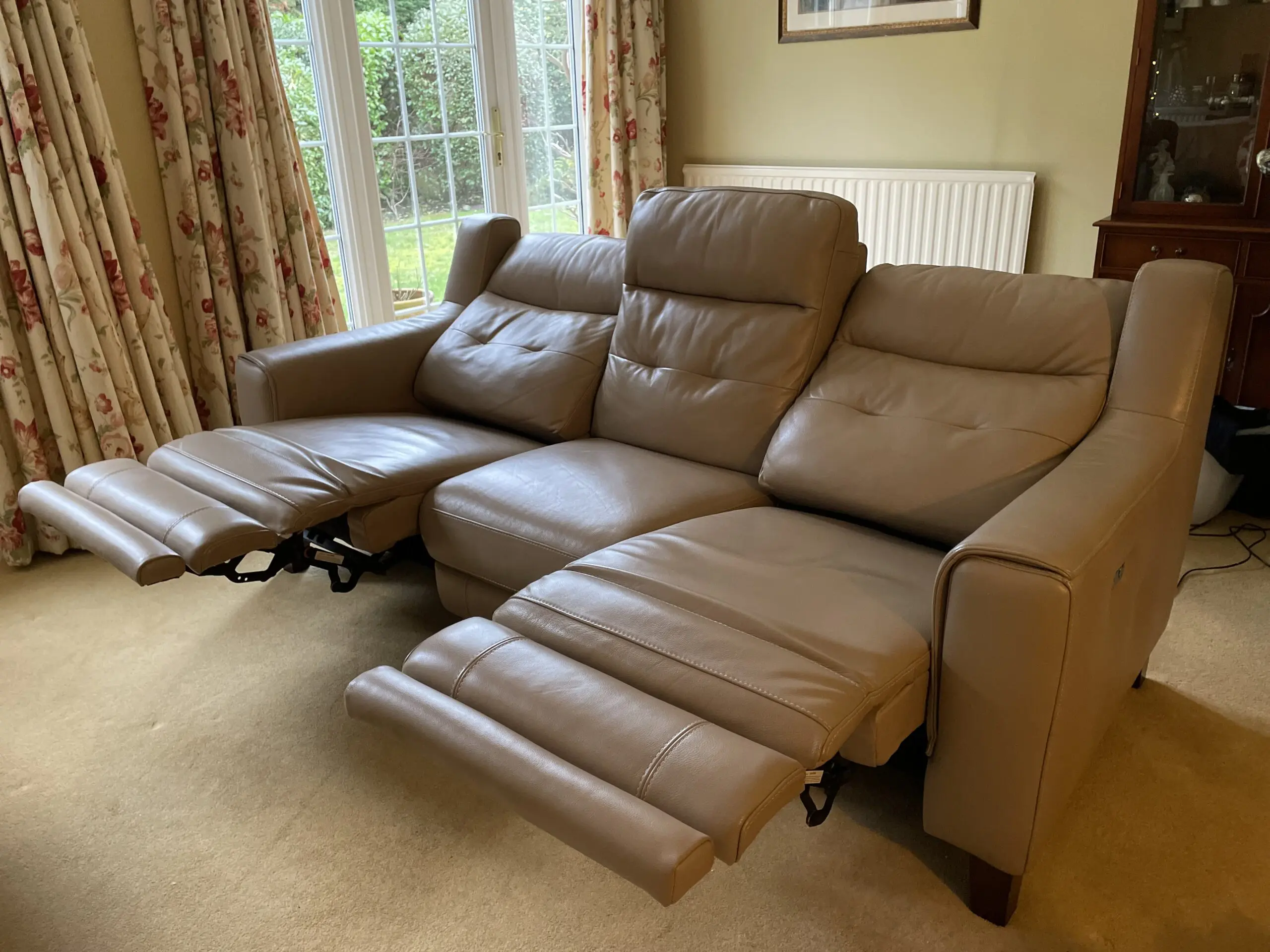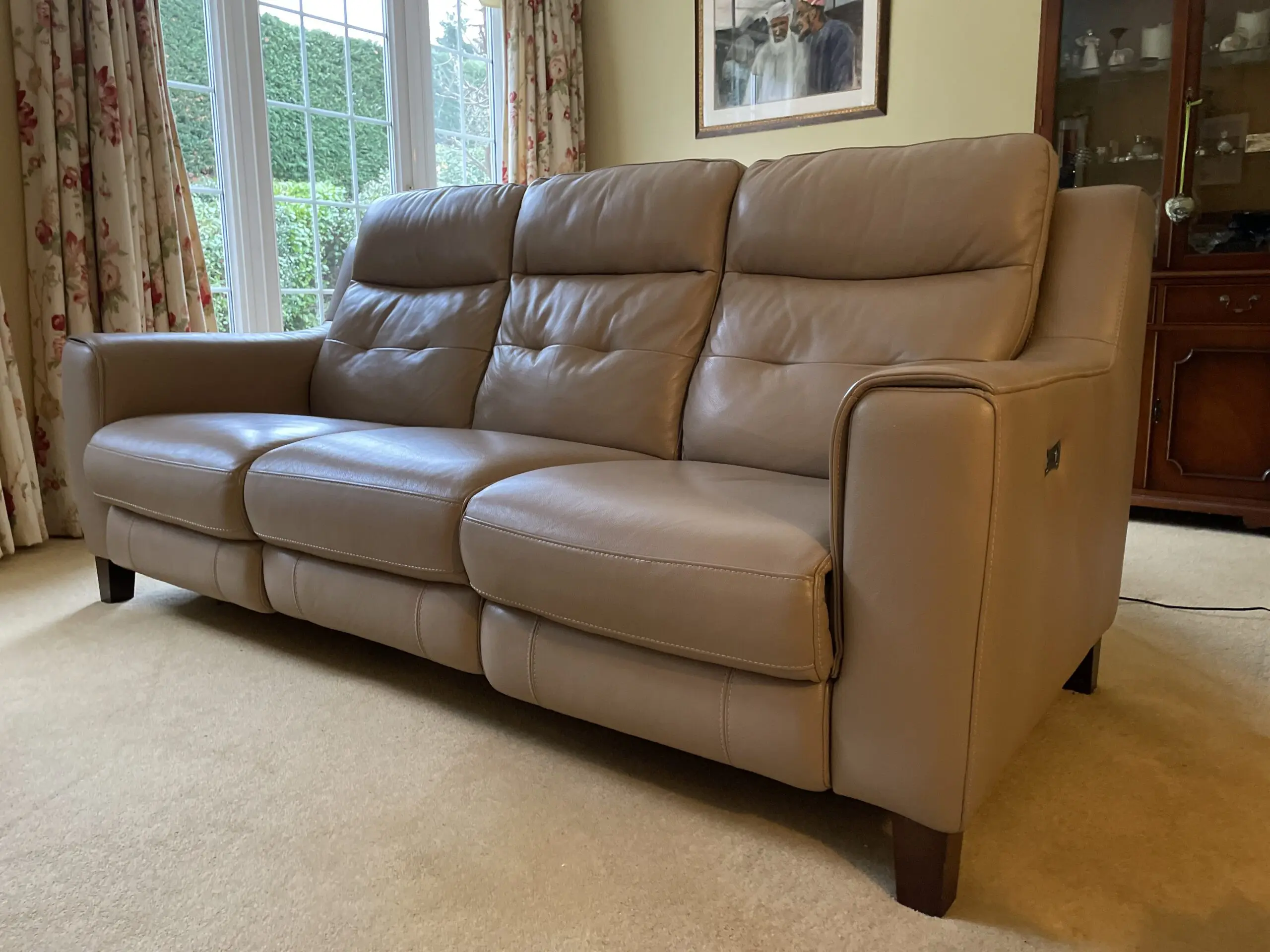 This three seater Italian leather sofa from Sofology is in excellent condition. Two of the seats recline electronically and with ease by simply pressing the buttons on the outside of each arm restfully (see photographs for detail). The sofa comes from a non smoking home and was bought from new. It has been looked after and only shows the slightest wear in accordance with use. It has been in a non smoking home and dissembles into three parts for ease of delivery. I am selling the sofa reluctantly as I am downsizing.