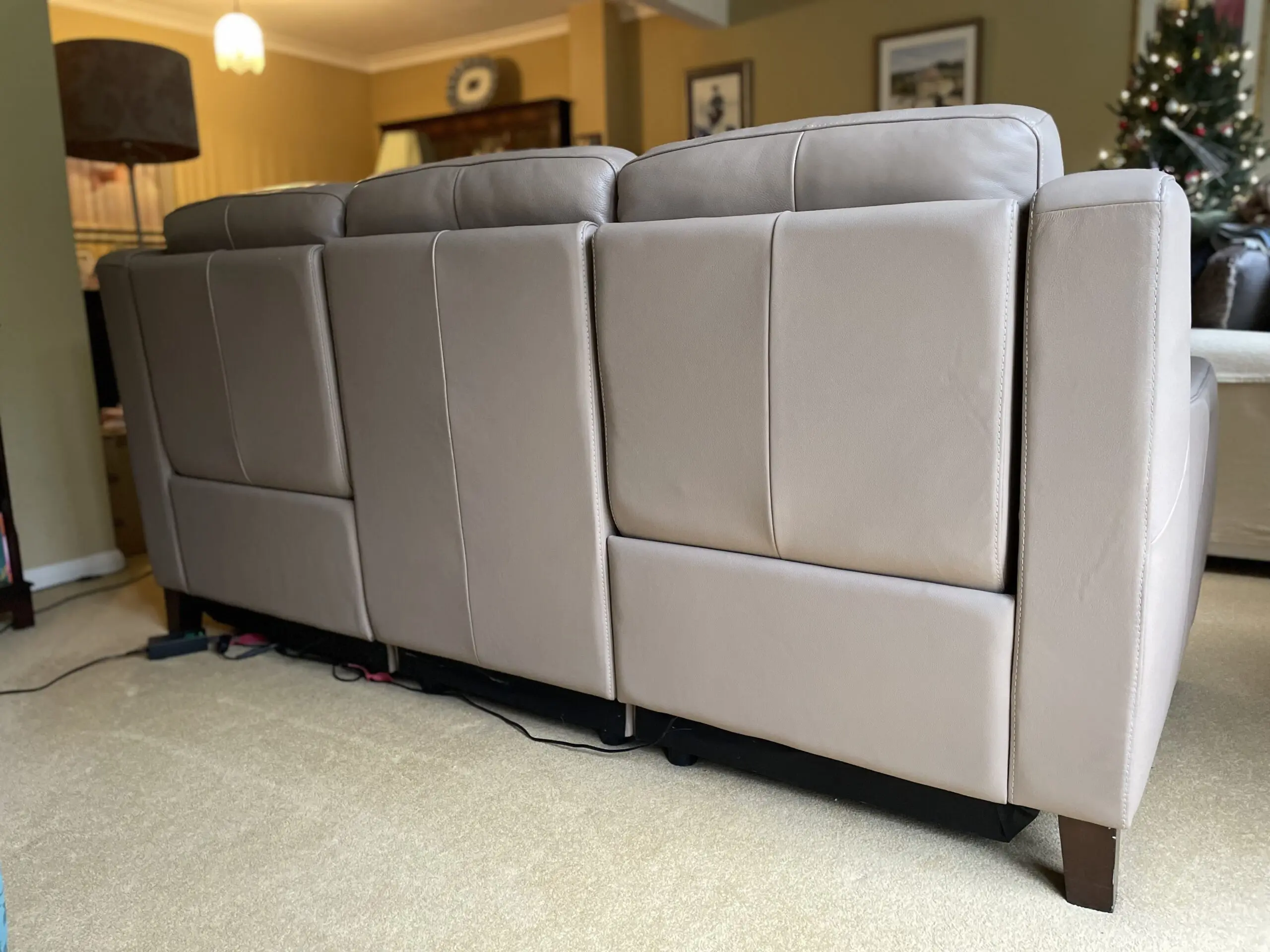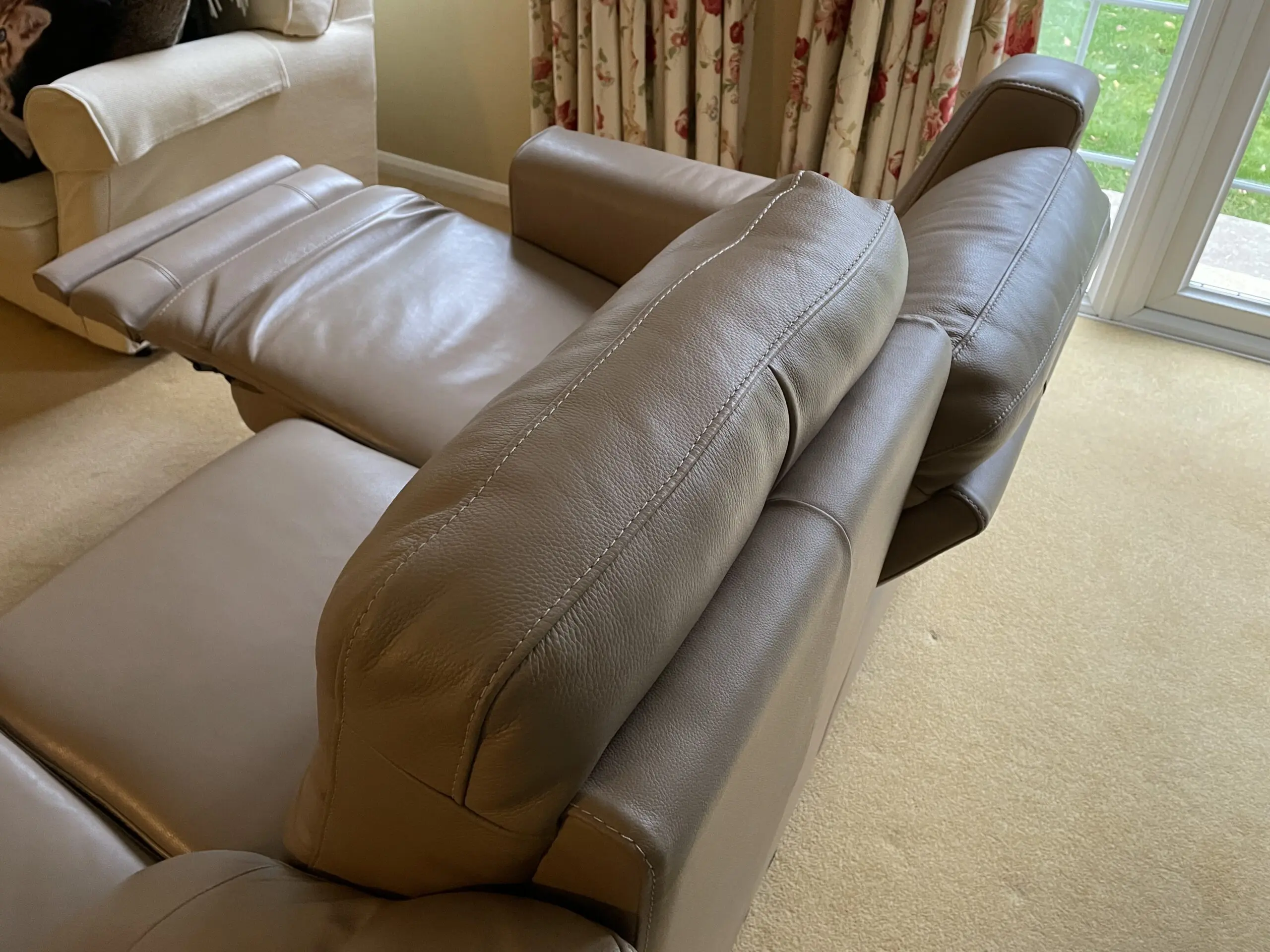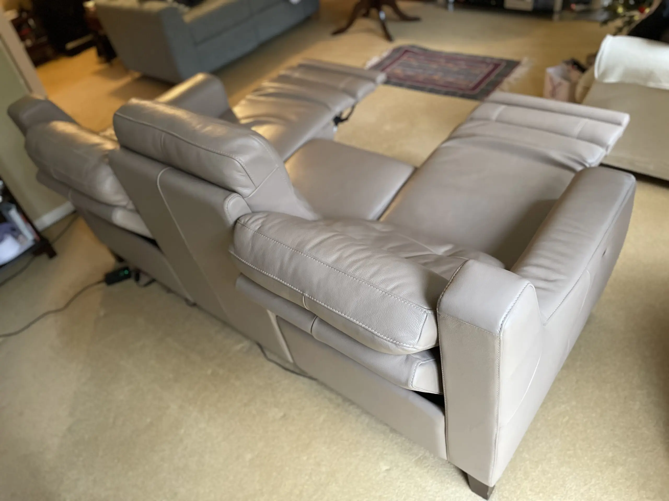 This three seater Italian leather sofa from Sofology is in excellent condition. Two of the seats recline electronically and with ease by simply pressing the buttons on the outside of each arm restfully (see photographs for detail). The sofa comes from a non smoking home and was bought from new. It has been looked after and only shows the slightest wear in accordance with use. It has been in a non smoking home and dissembles into three parts for ease of delivery. I am selling the sofa reluctantly as I am downsizing.