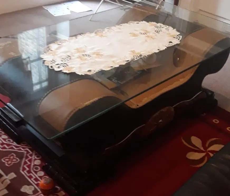The coffee table is solid wood with a thick glass top and carved detailing, matching the sofa set’s elegant design. Originally cost around £1,200 new — solid craftsmanship and a luxury, classic look.