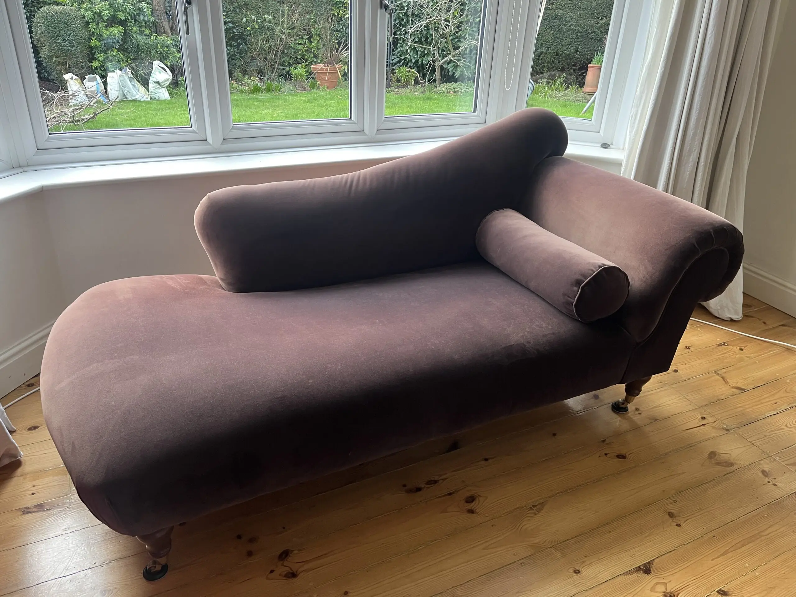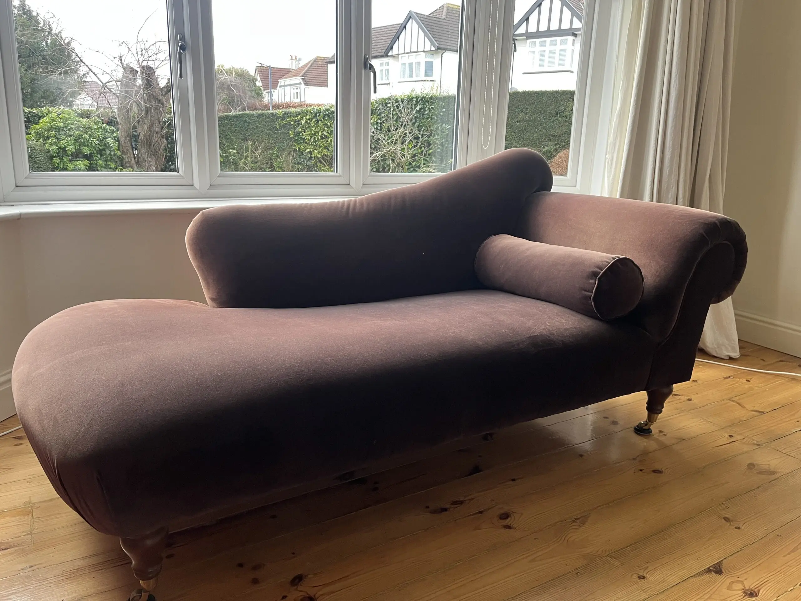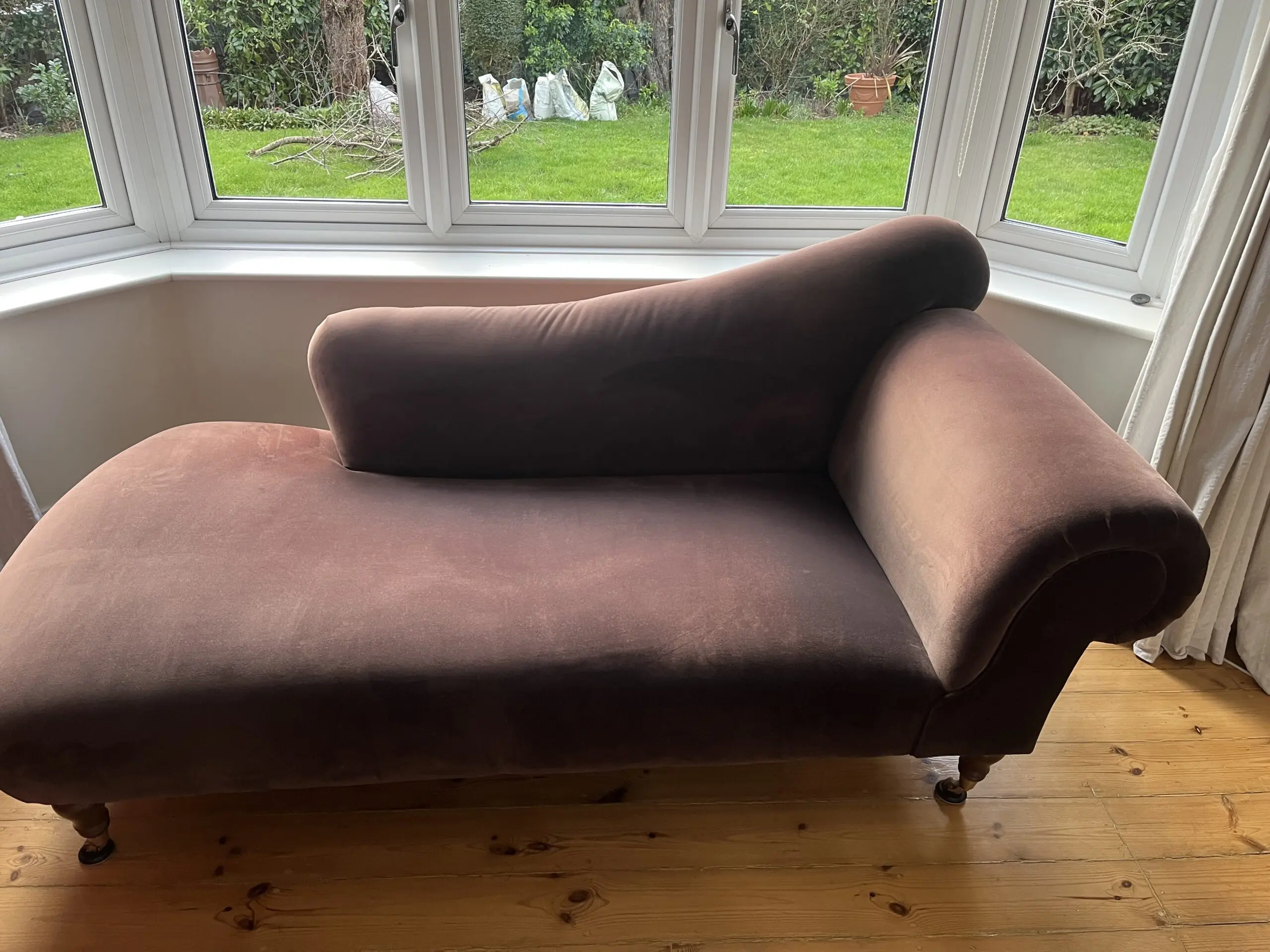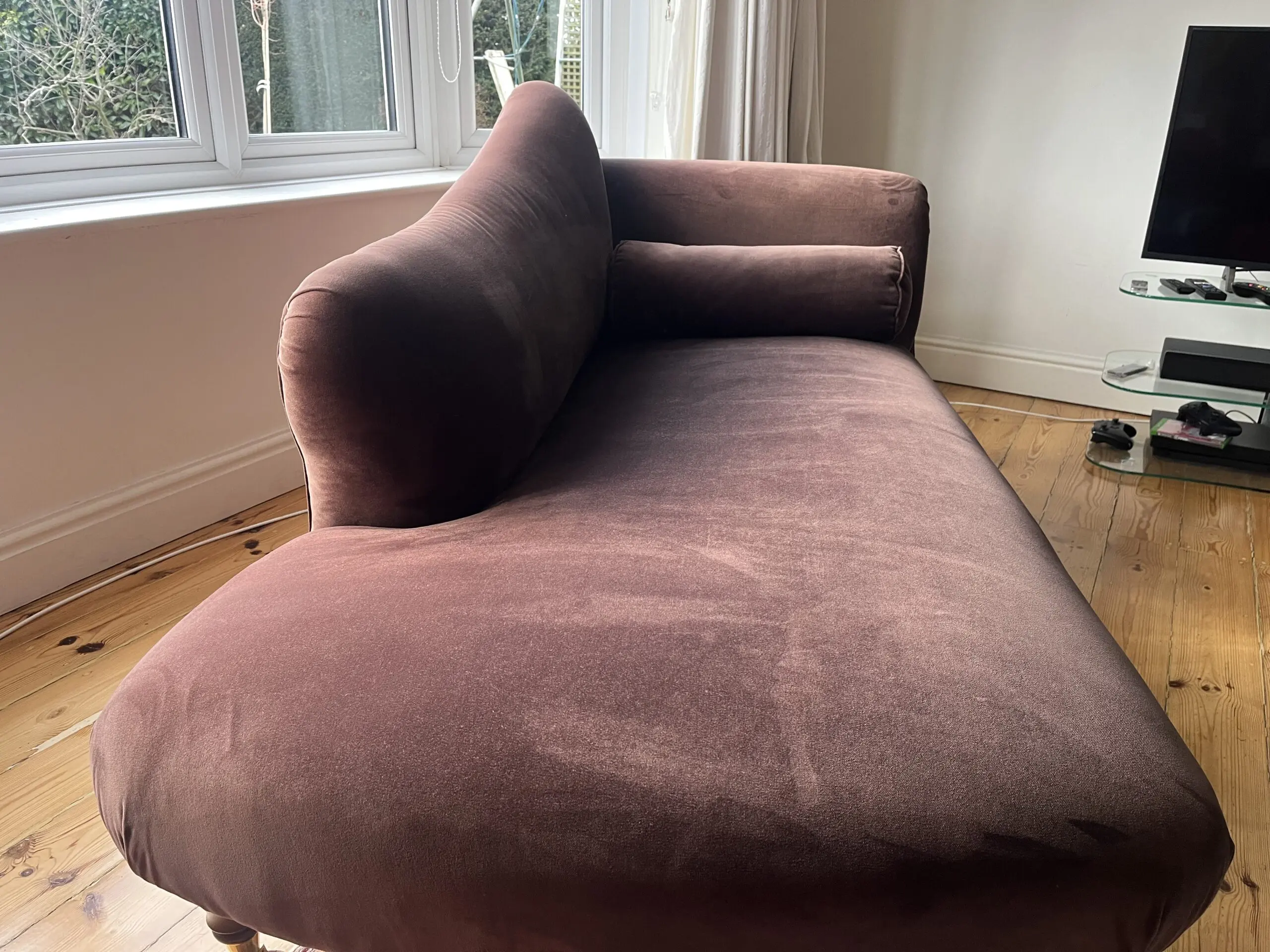 Beautiful modern chaise longue with matching feather bolster cushion. This was reupholstered 5 years in jbrown velvet fabric and has had very little use since then. There is a very slight sun bleaching on the back and foot end but this is not very noticeable. We mainly have this covered to protect it from sunlight and dust. The underside fabric was replaced at the same time it was reupholstered. Springs and foam padding in excellent condition and still firm with no signs of sagging. We have a dog ( miniature poodle with non shedding hair) but he is not allowed in the room where this sofa is situated – the room is pet free. This really is a stunning statement piece of furniture. Very comfortable to lounge on and will easily accomodate 3 people sitting. Front and rear legs turned with brass wheels . Detachable front and rear legs. Professionally cleaned.