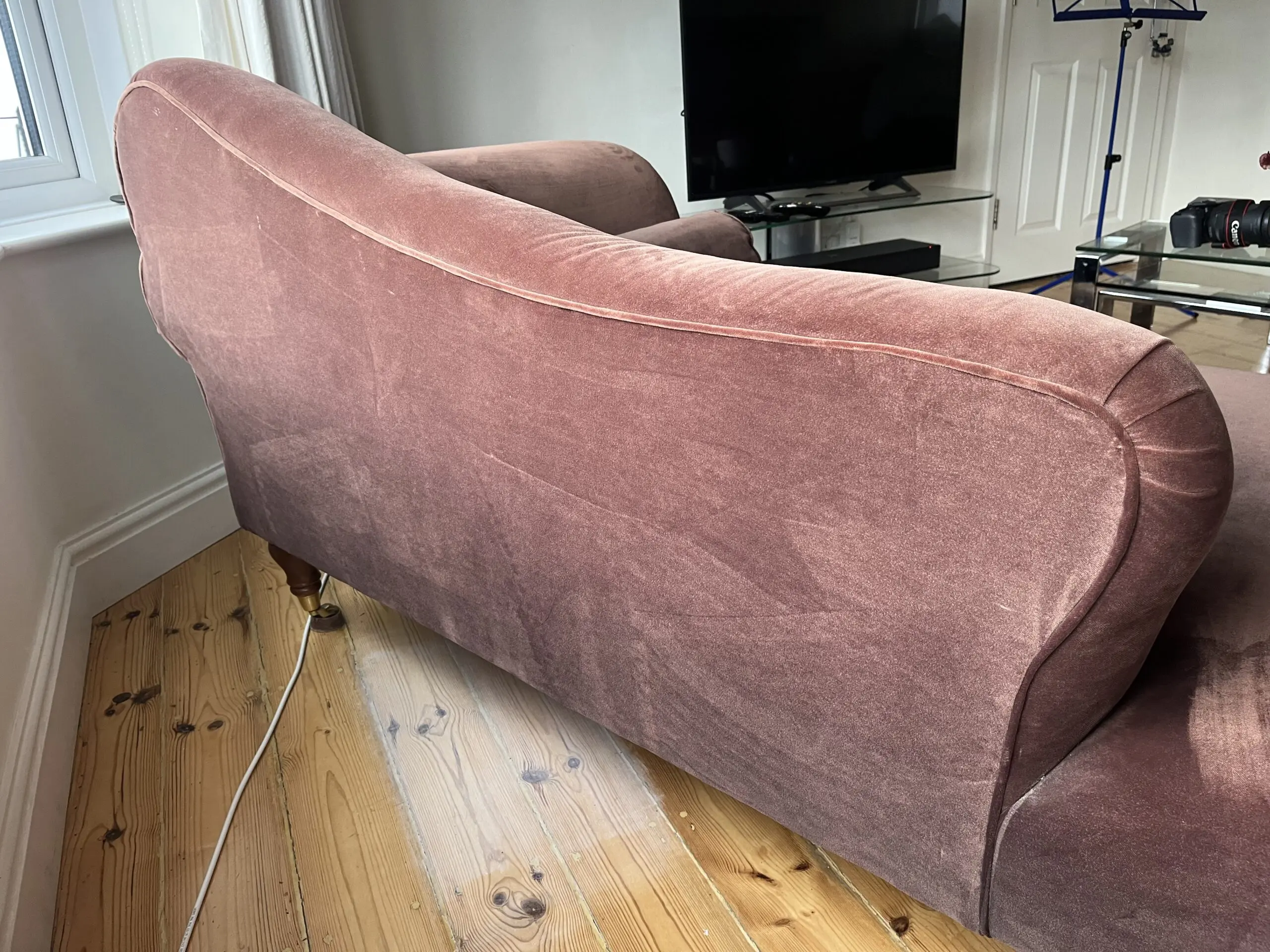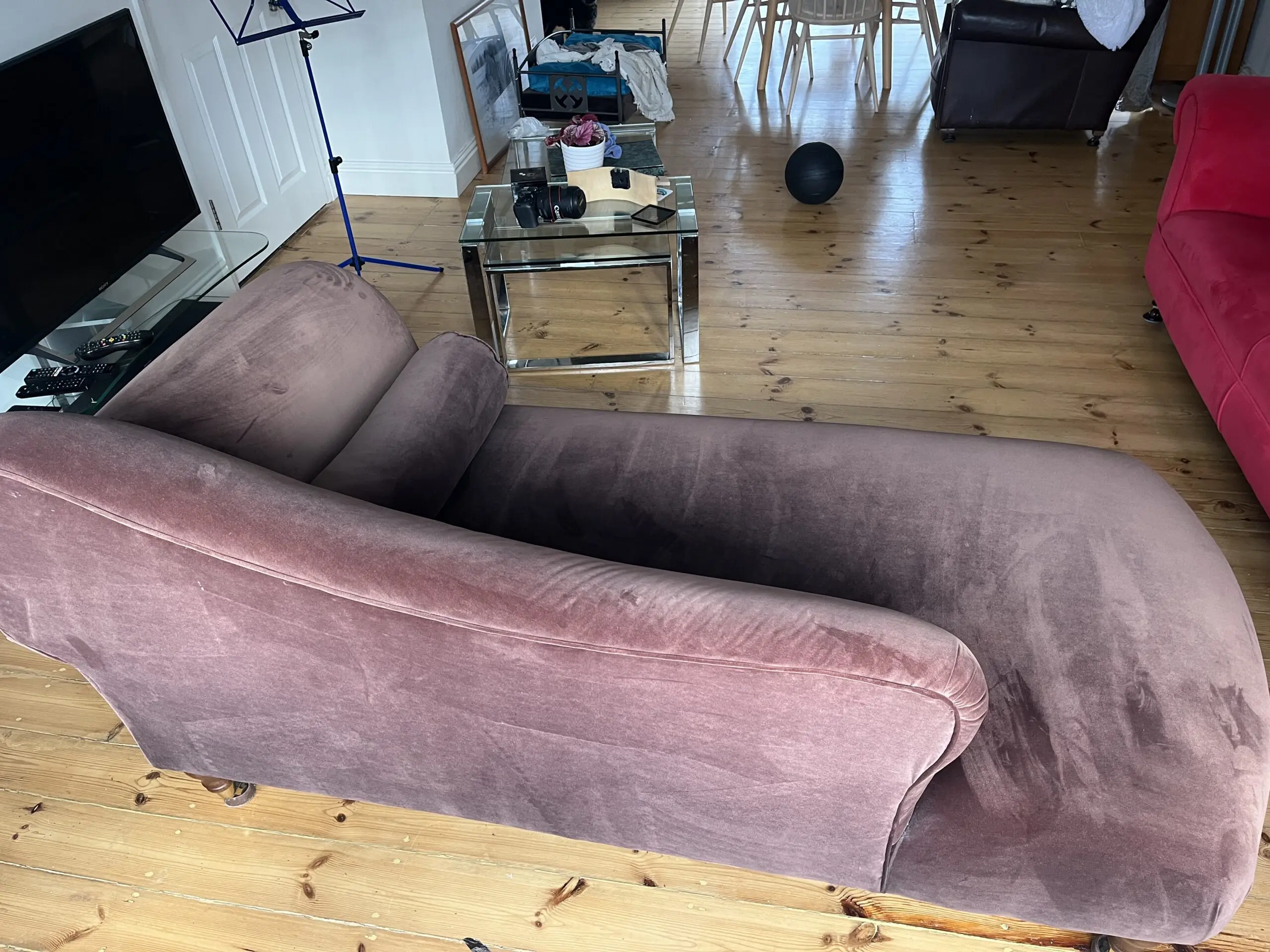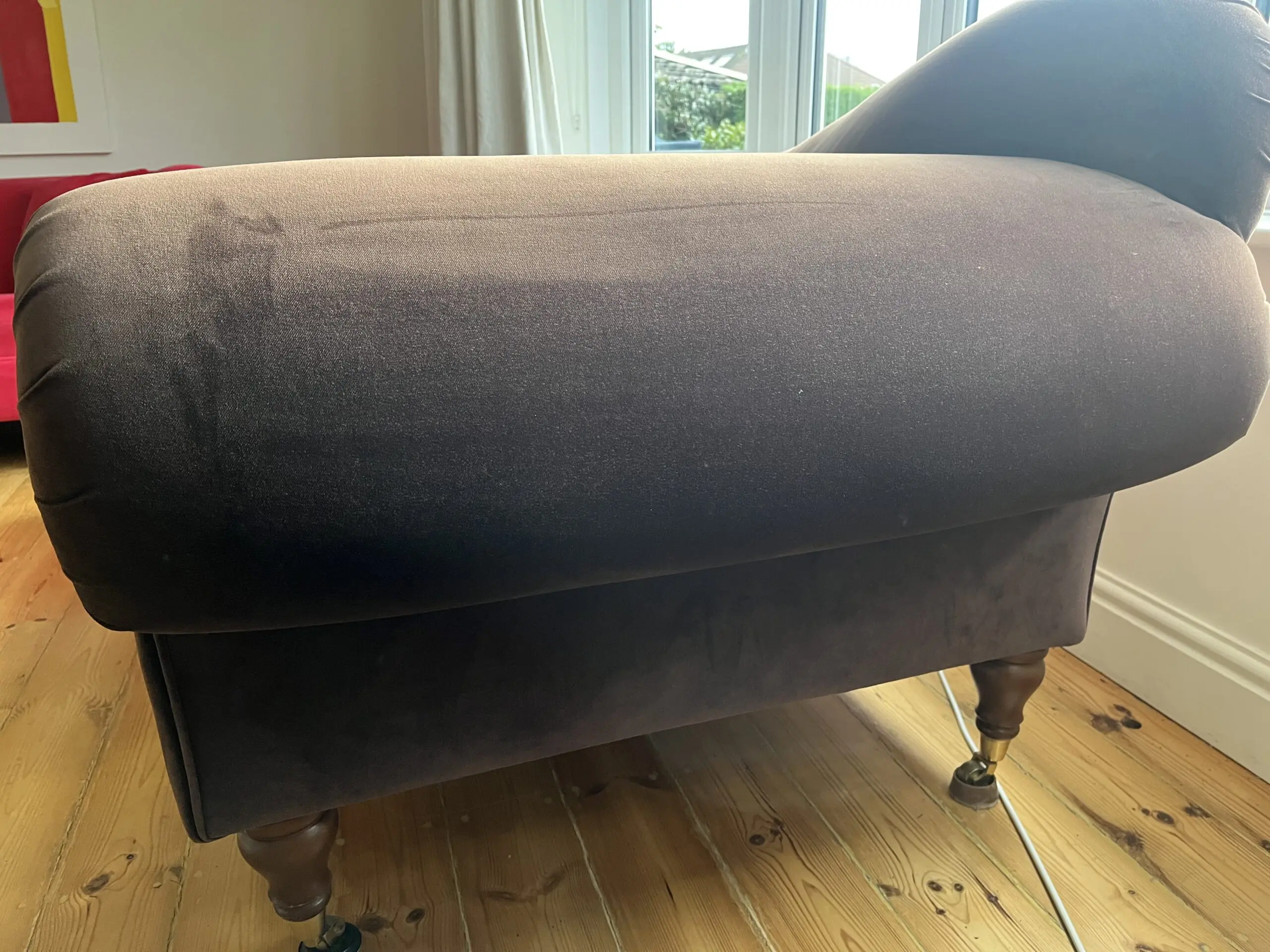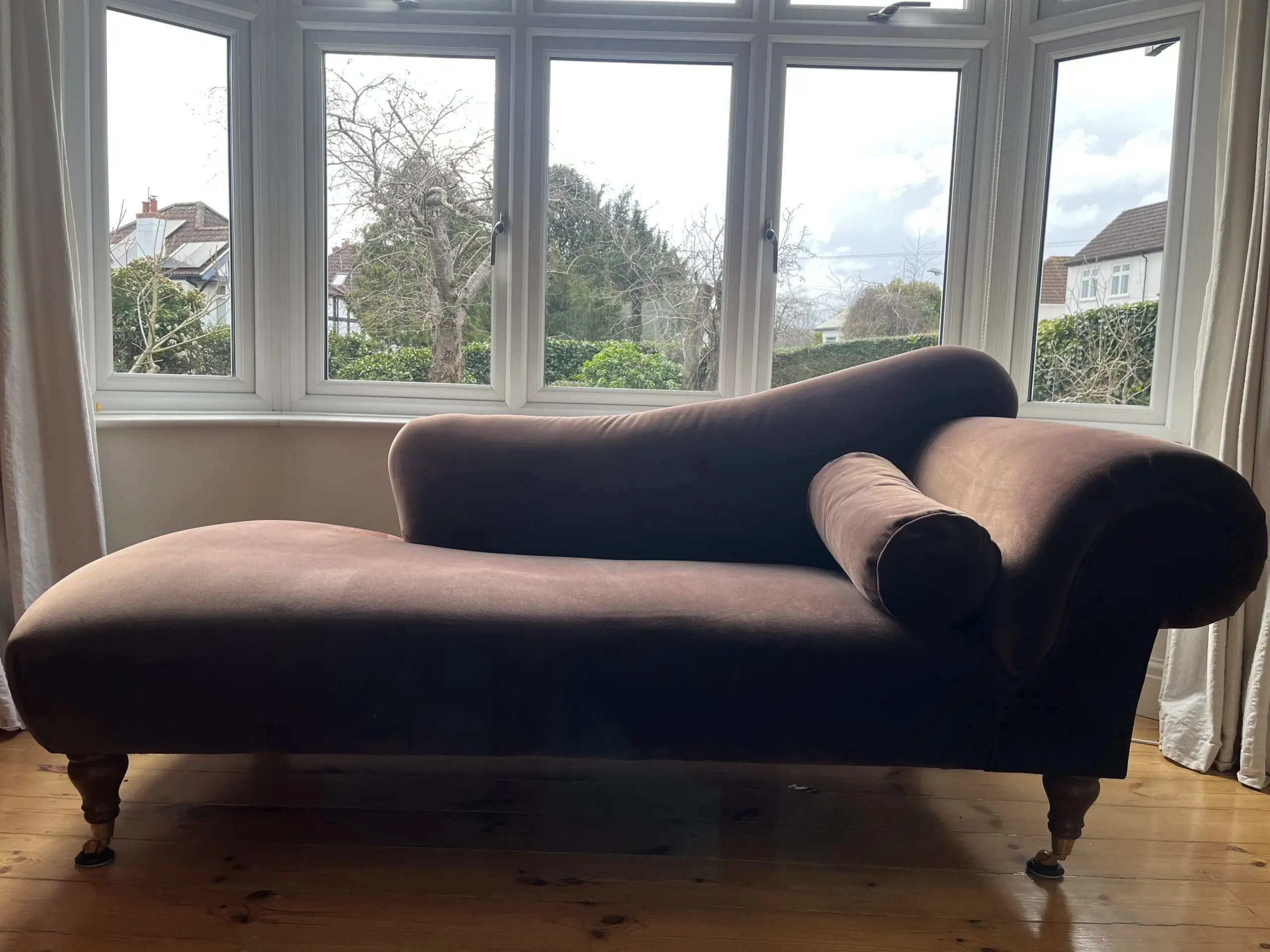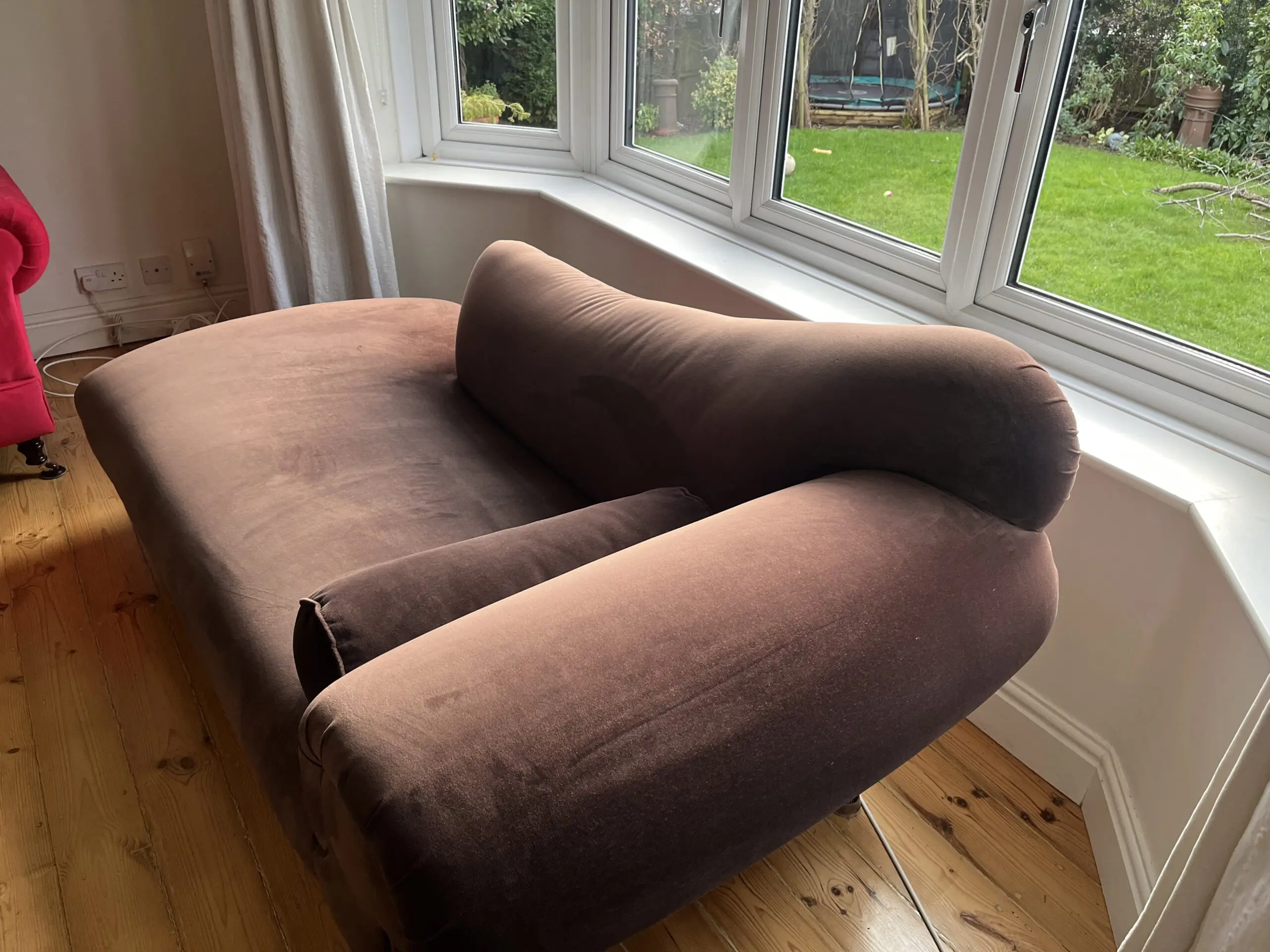 Beautiful modern chaise longue with matching feather bolster cushion. This was reupholstered 5 years in jbrown velvet fabric and has had very little use since then. There is a very slight sun bleaching on the back and foot end but this is not very noticeable. We mainly have this covered to protect it from sunlight and dust. The underside fabric was replaced at the same time it was reupholstered. Springs and foam padding in excellent condition and still firm with no signs of sagging. We have a dog ( miniature poodle with non shedding hair) but he is not allowed in the room where this sofa is situated – the room is pet free. This really is a stunning statement piece of furniture. Very comfortable to lounge on and will easily accomodate 3 people sitting. Front and rear legs turned with brass wheels . Detachable front and rear legs. Professionally cleaned.
