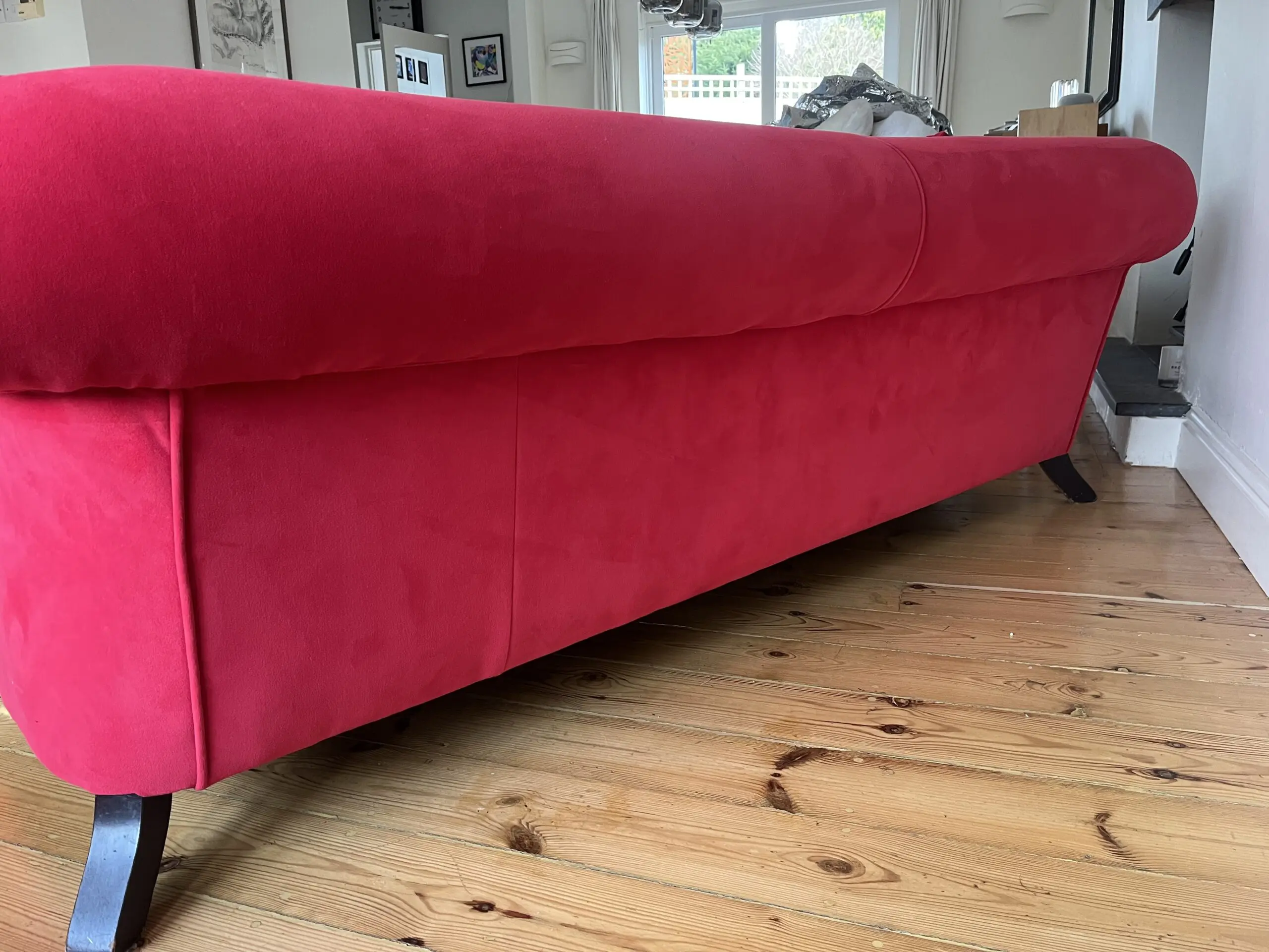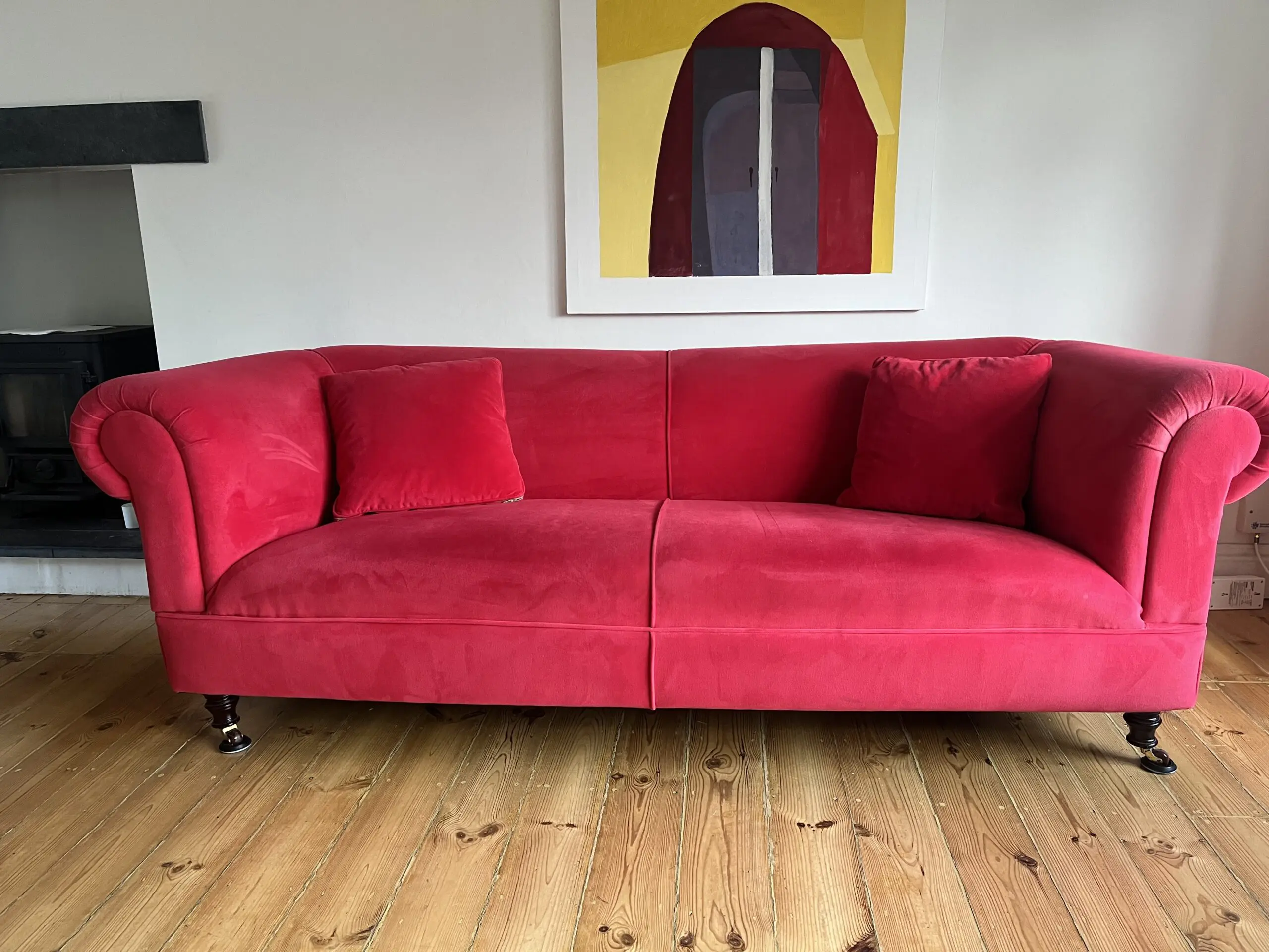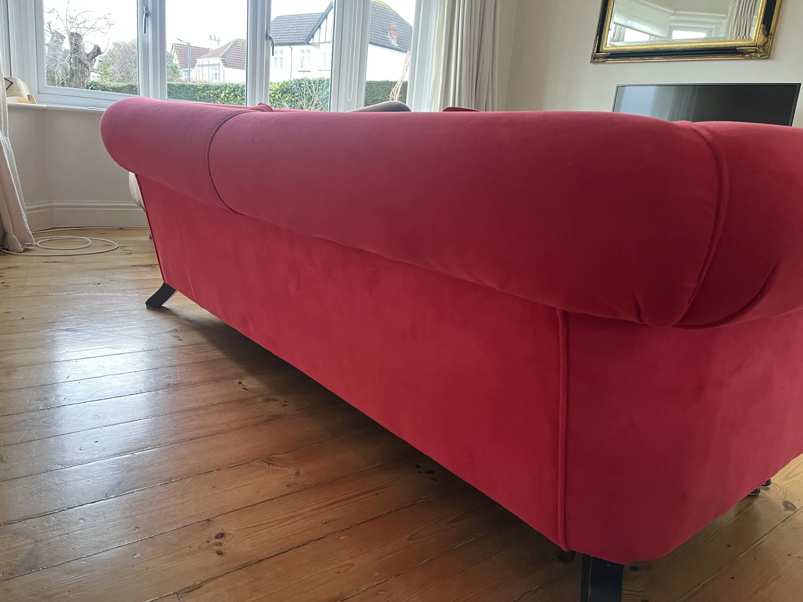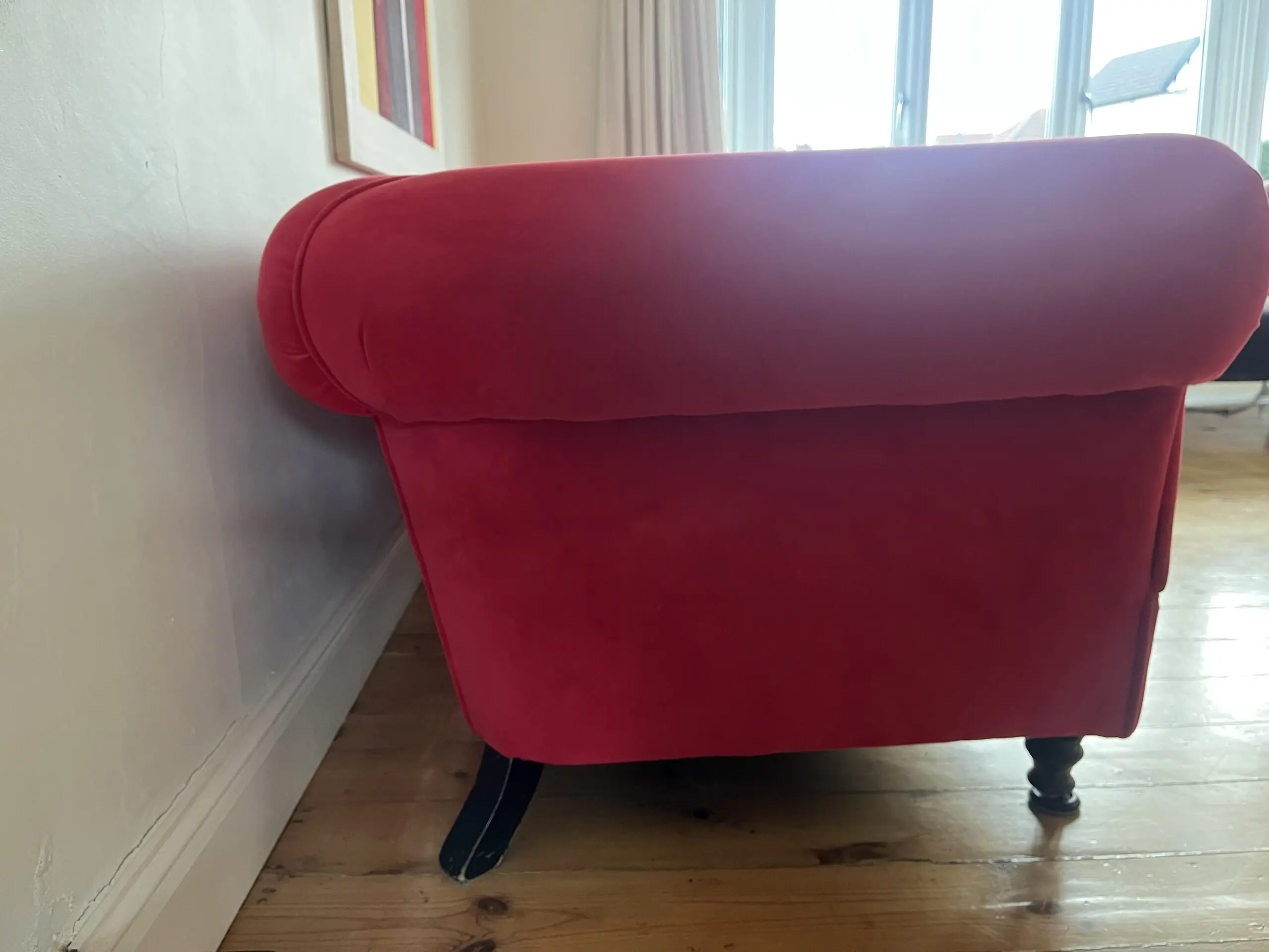 This is a truly stunning modern chesterfield that it is excellent condition It has been recovered in jbrown velvet fabric and has 2 matching feather filled scatter cushions. Springs and foam filling are all in excellent firm condition. Underside fabric was replaced at the time of reupholstery. turned legs at front, straight at rear. Front legs are detachable. Professional cleaned with no marks or stains. We do have a dog ( non shedding miniature poodle ) but he is not allowed in the room with the sofas- the room it is in is pet free.