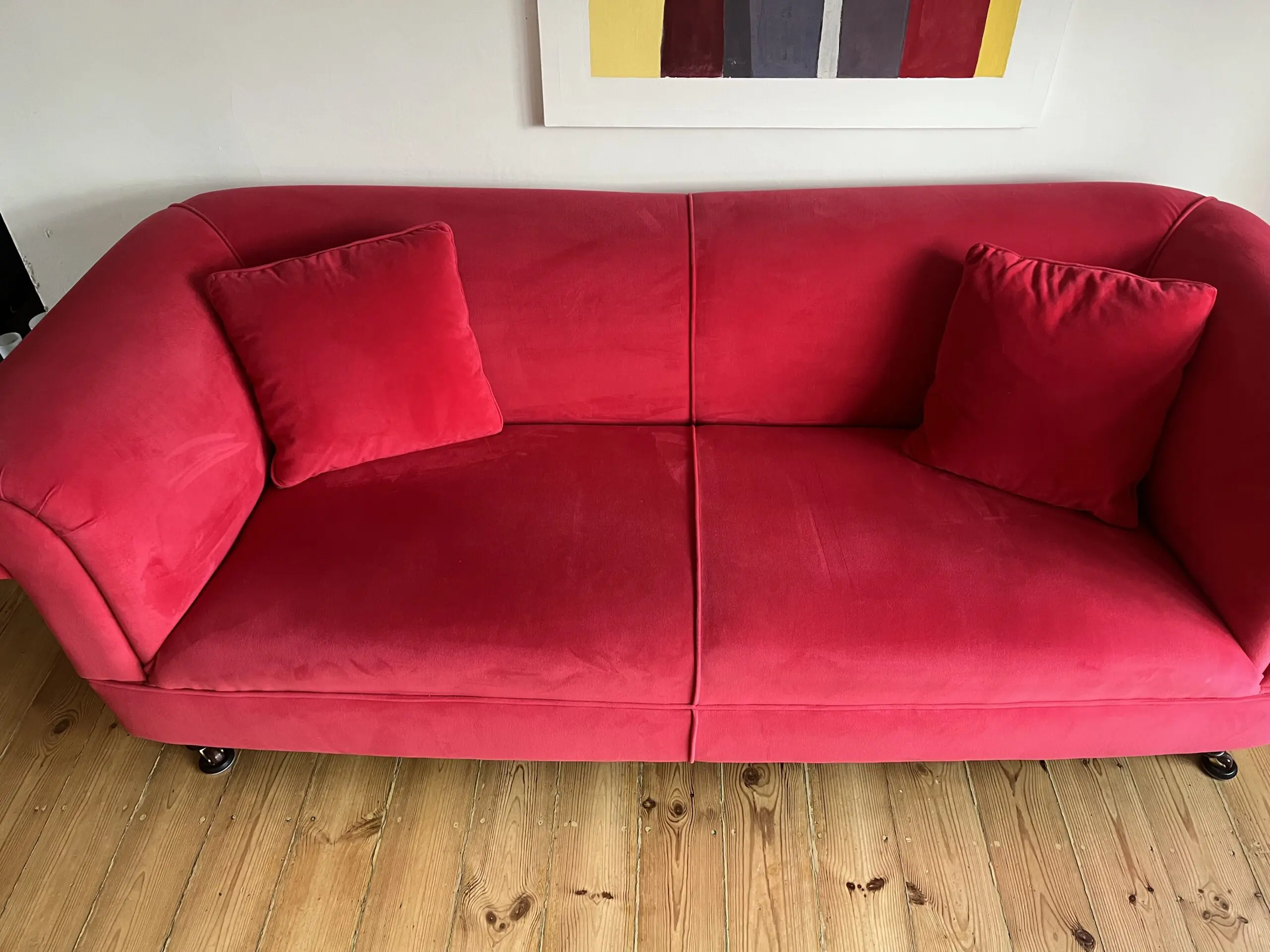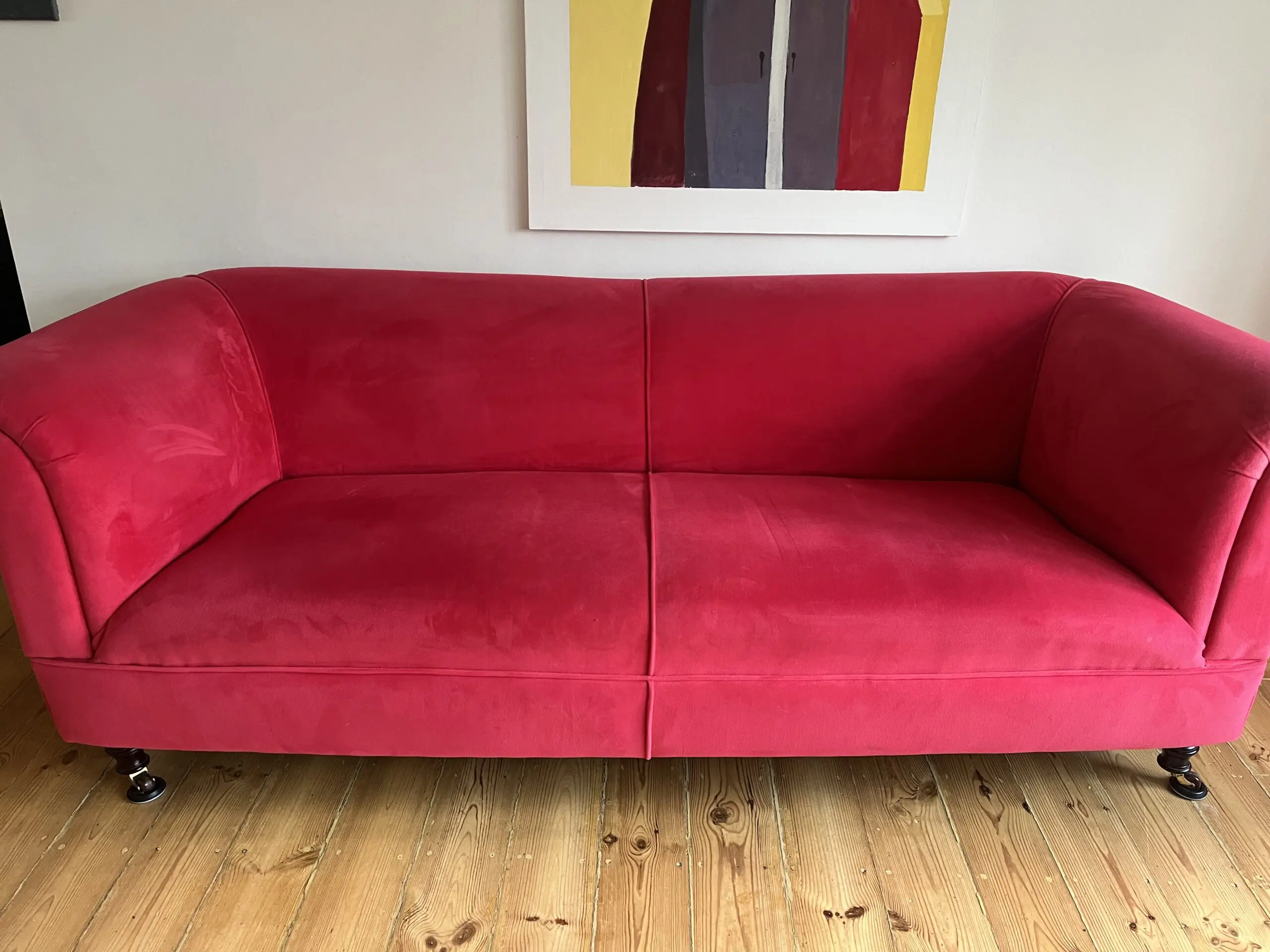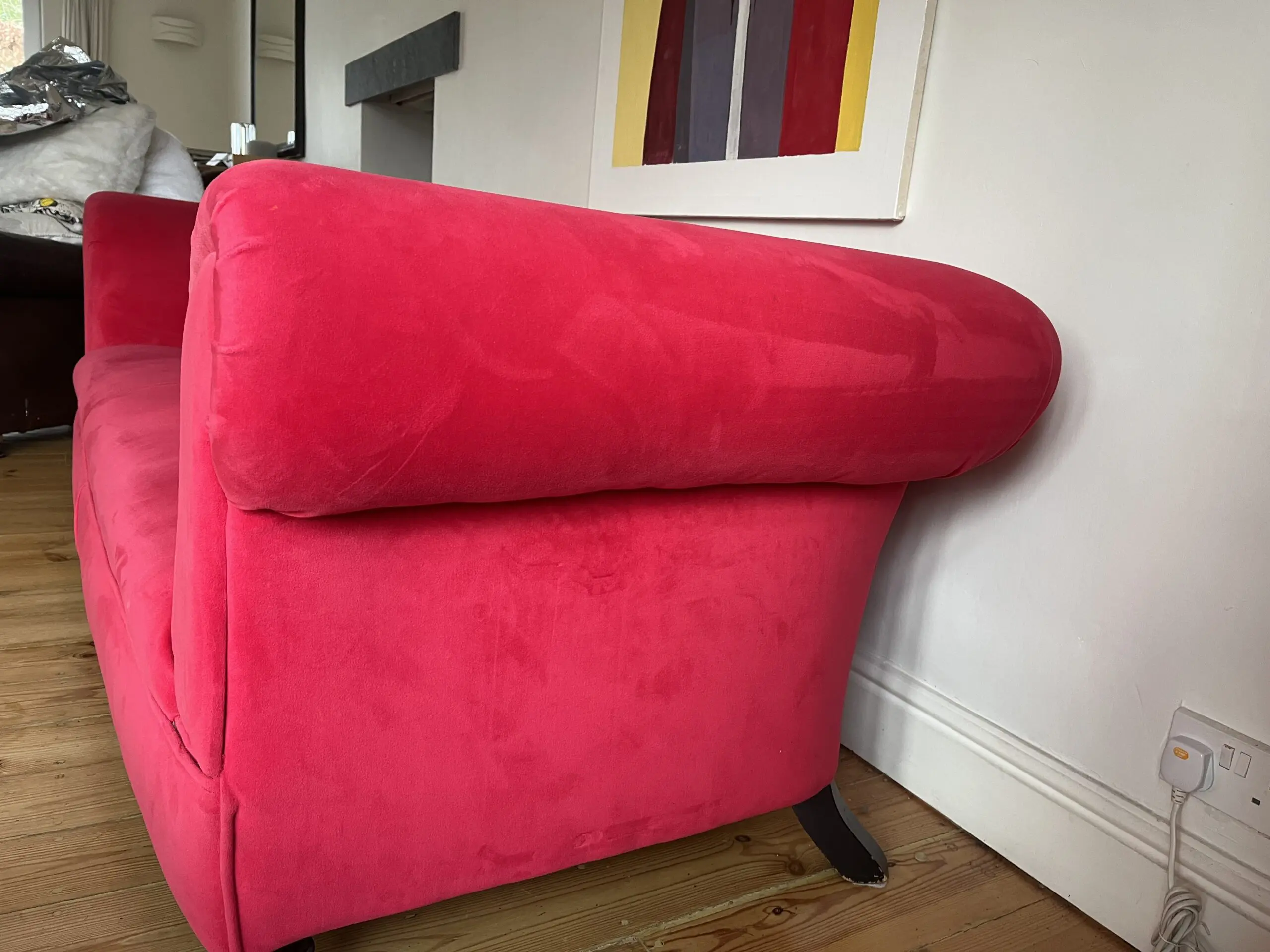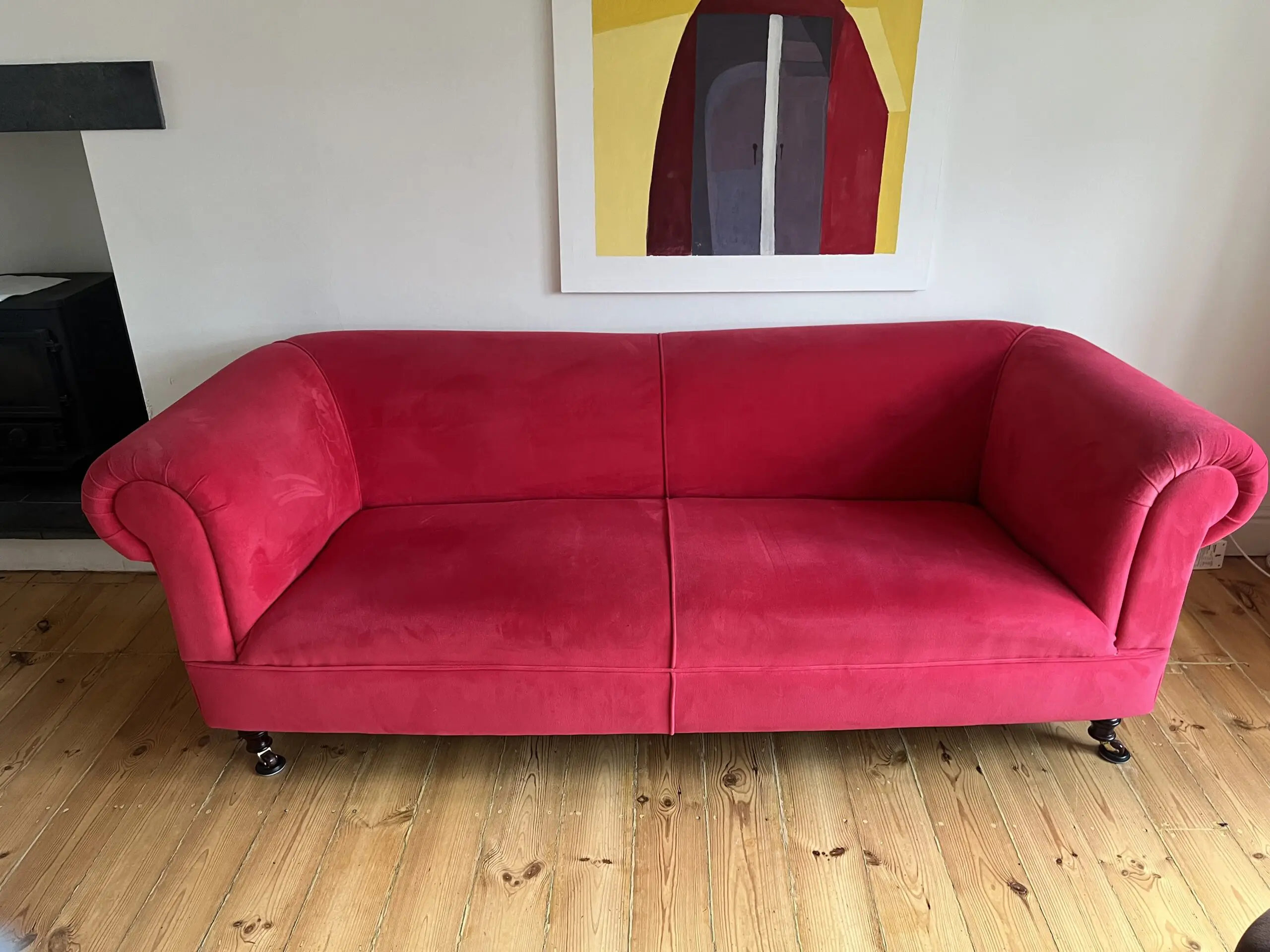 This is a truly stunning modern chesterfield that it is excellent condition It has been recovered in jbrown velvet fabric and has 2 matching feather filled scatter cushions. Springs and foam filling are all in excellent firm condition. Underside fabric was replaced at the time of reupholstery. turned legs at front, straight at rear. Front legs are detachable. Professional cleaned with no marks or stains. We do have a dog ( non shedding miniature poodle ) but he is not allowed in the room with the sofas- the room it is in is pet free.