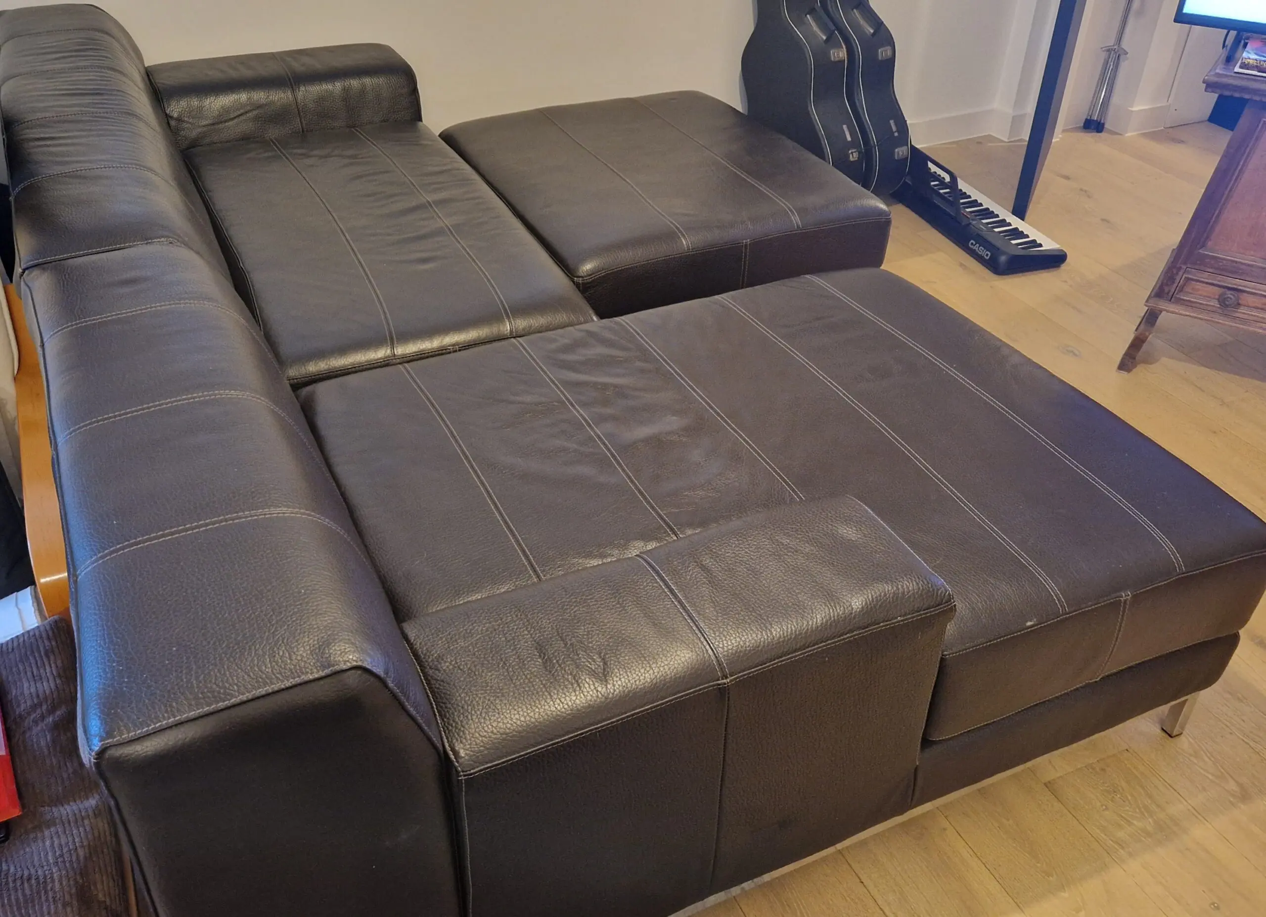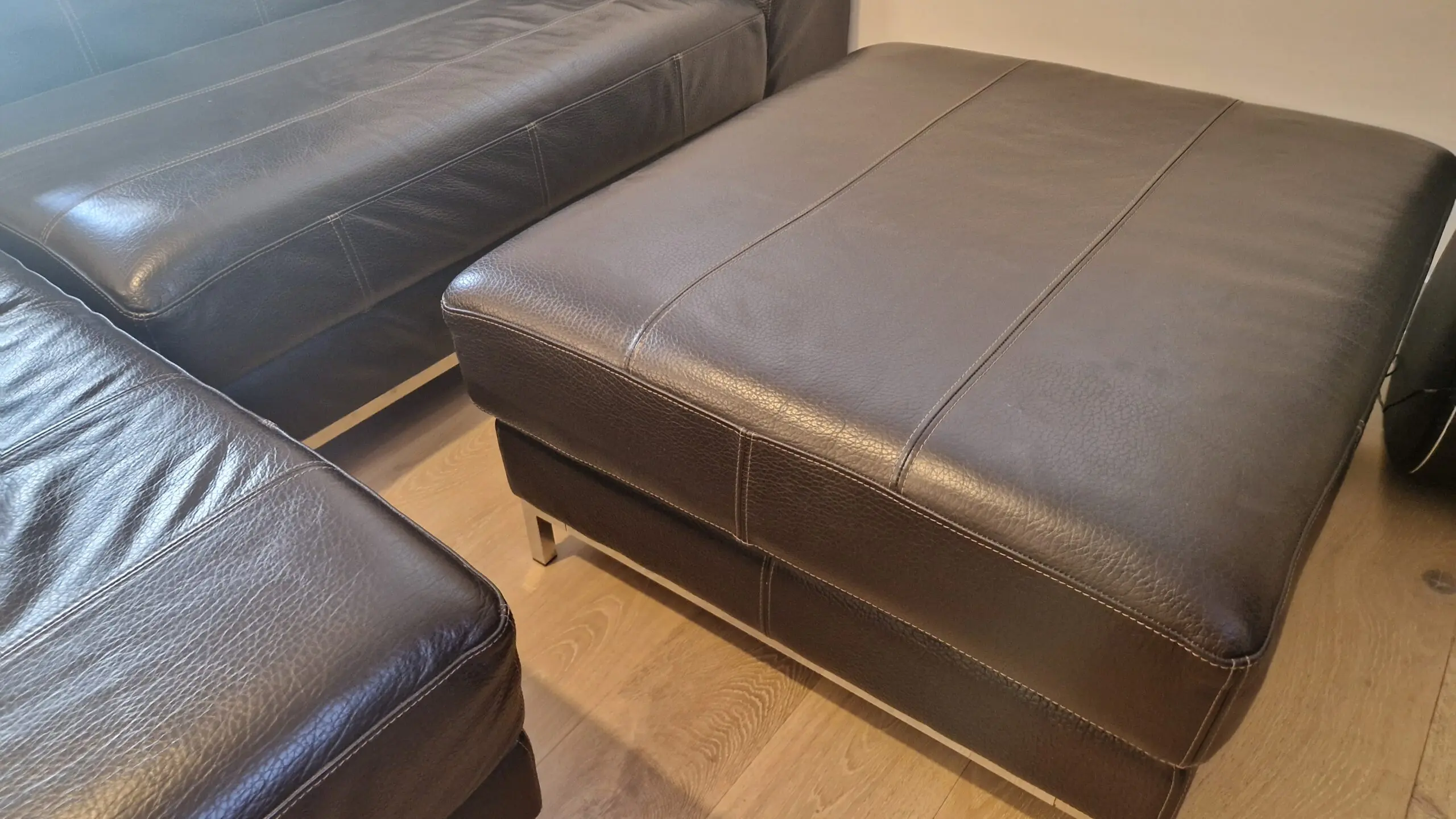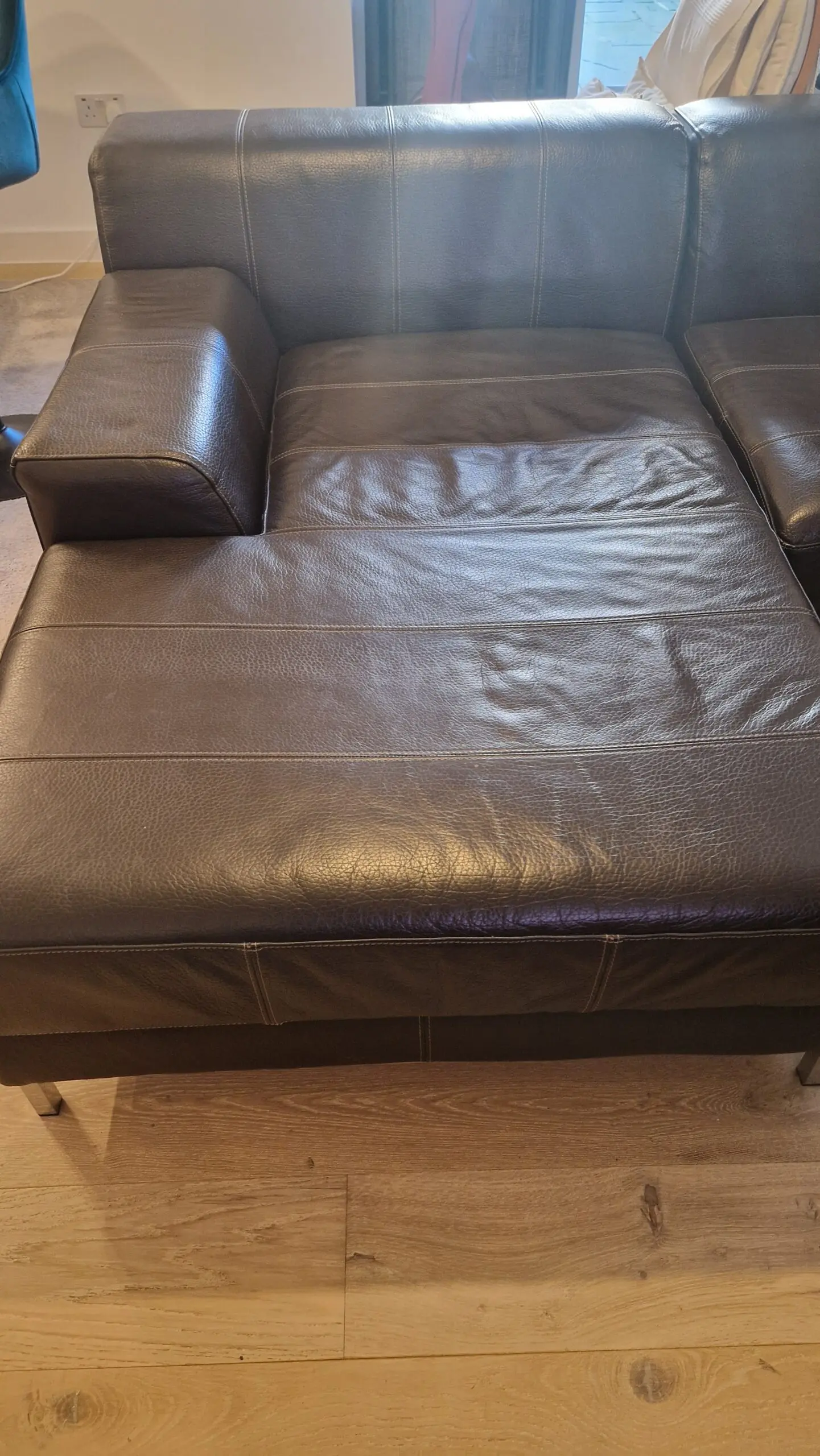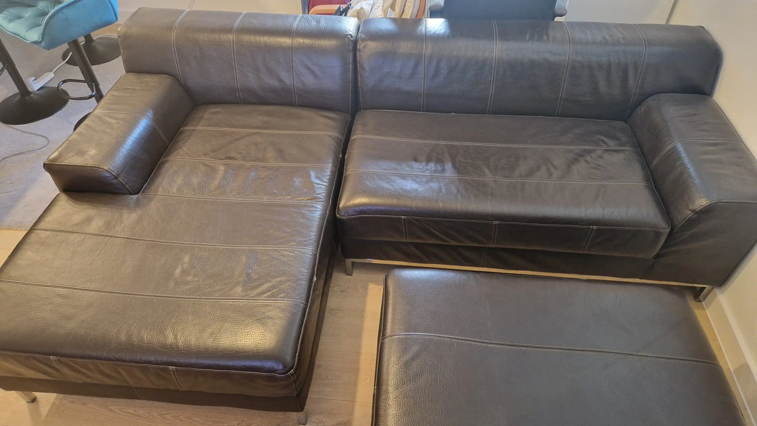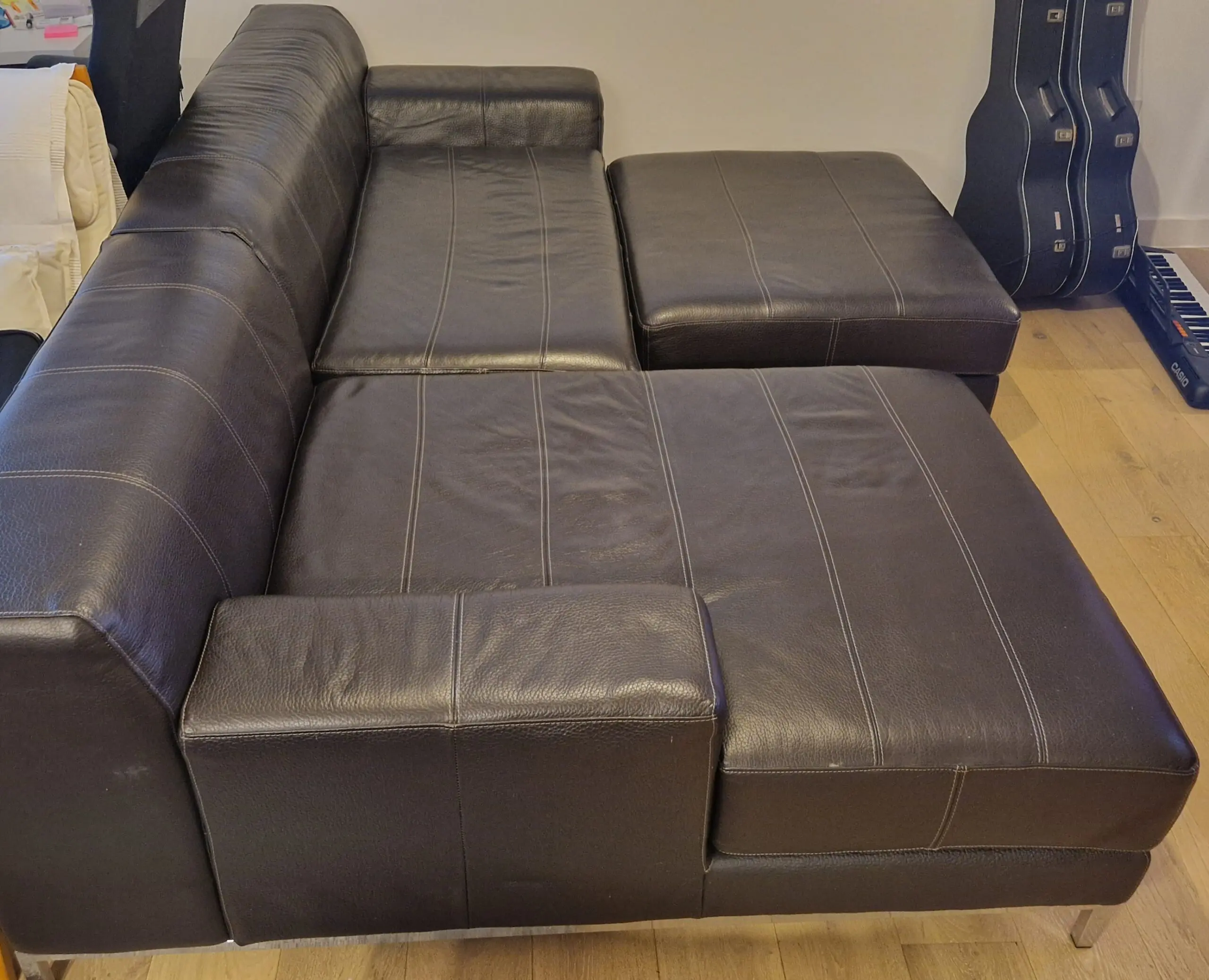 Stylish IKEA dark brown leather 2 piece sofa plus foot rest. 255cm (8ft 4′) wide when joined together. 160cm (5ft 4′) long for large seat. 100cm (3ft 4′) long for smaller seat. 75cm (2ft 4′) high from back rest to floor. Seat is 45cm (18′) from floor. Foot rest is 97cm (38′) by 88cm (34′) and 45cm (18′) high.