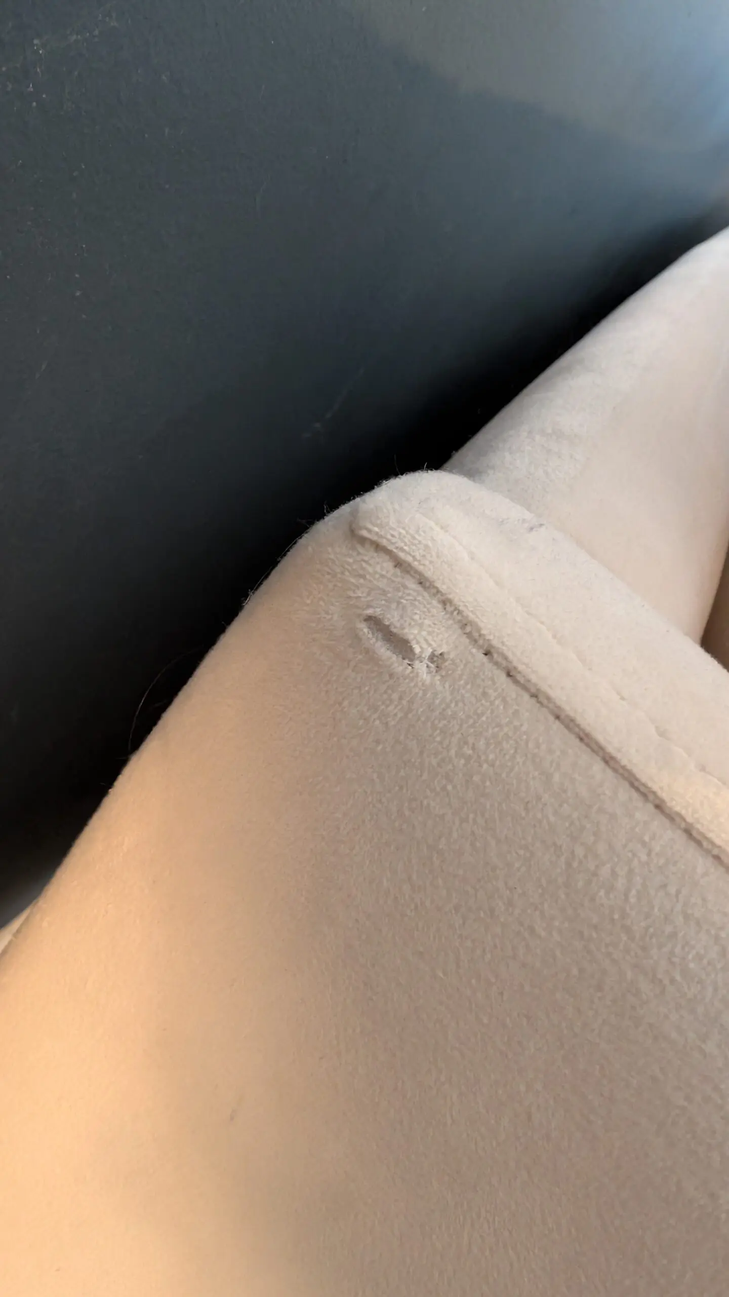 One very small rip in the back left corner (as you look at the sofa), see photos. It’s so small that my partner didn’t even know it was there, and anyone handy with a needle and thread could probably repair it themselves.
