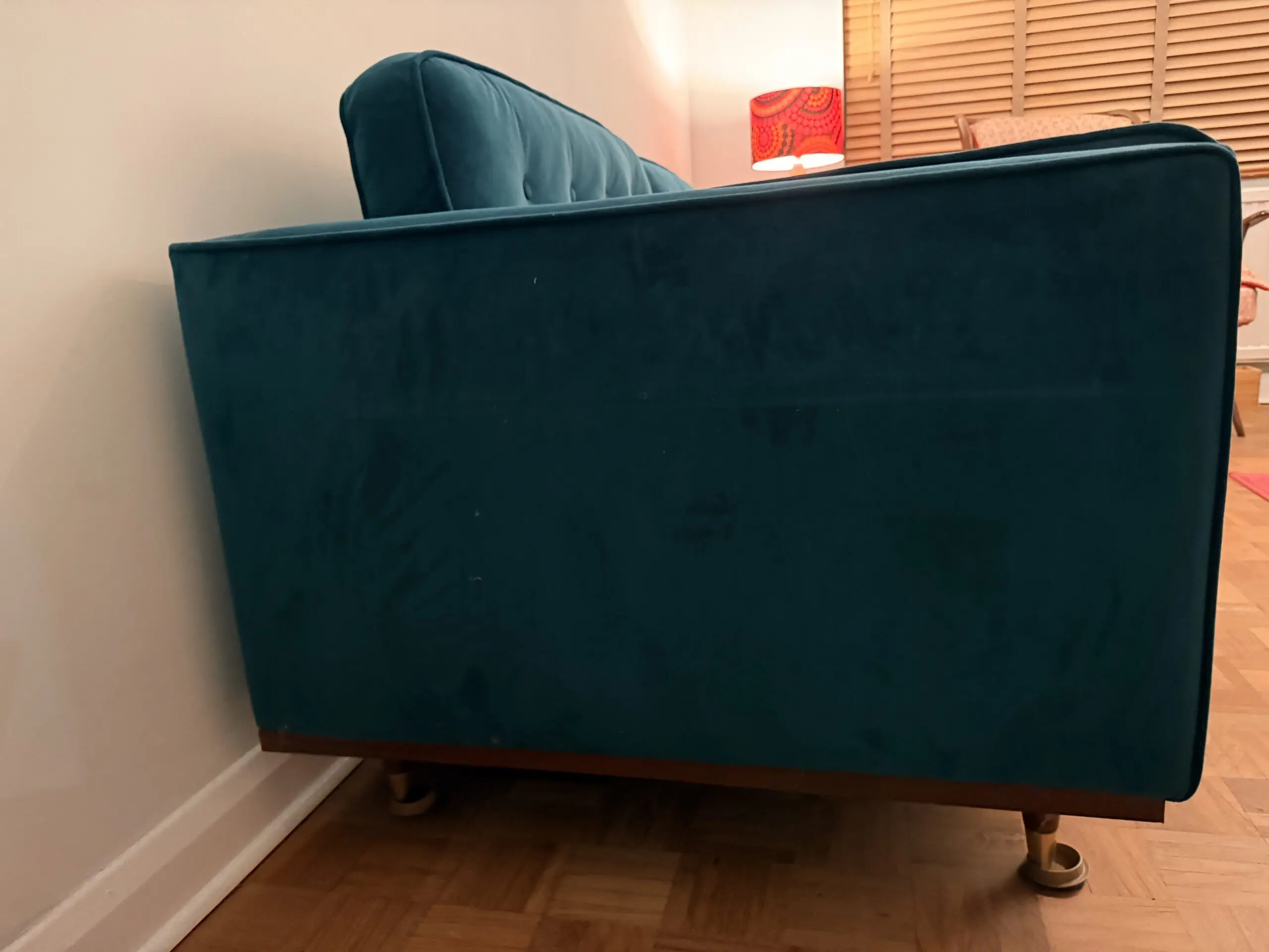 Eye-catching teal velvet sofa in excellent condition. Features a timeless, mid-century inspired design with clean lines, button-tufted back cushions, and elegant slim legs. The velvet upholstery is soft, rich in colour, and adds a warm, stylish statement to any living space.