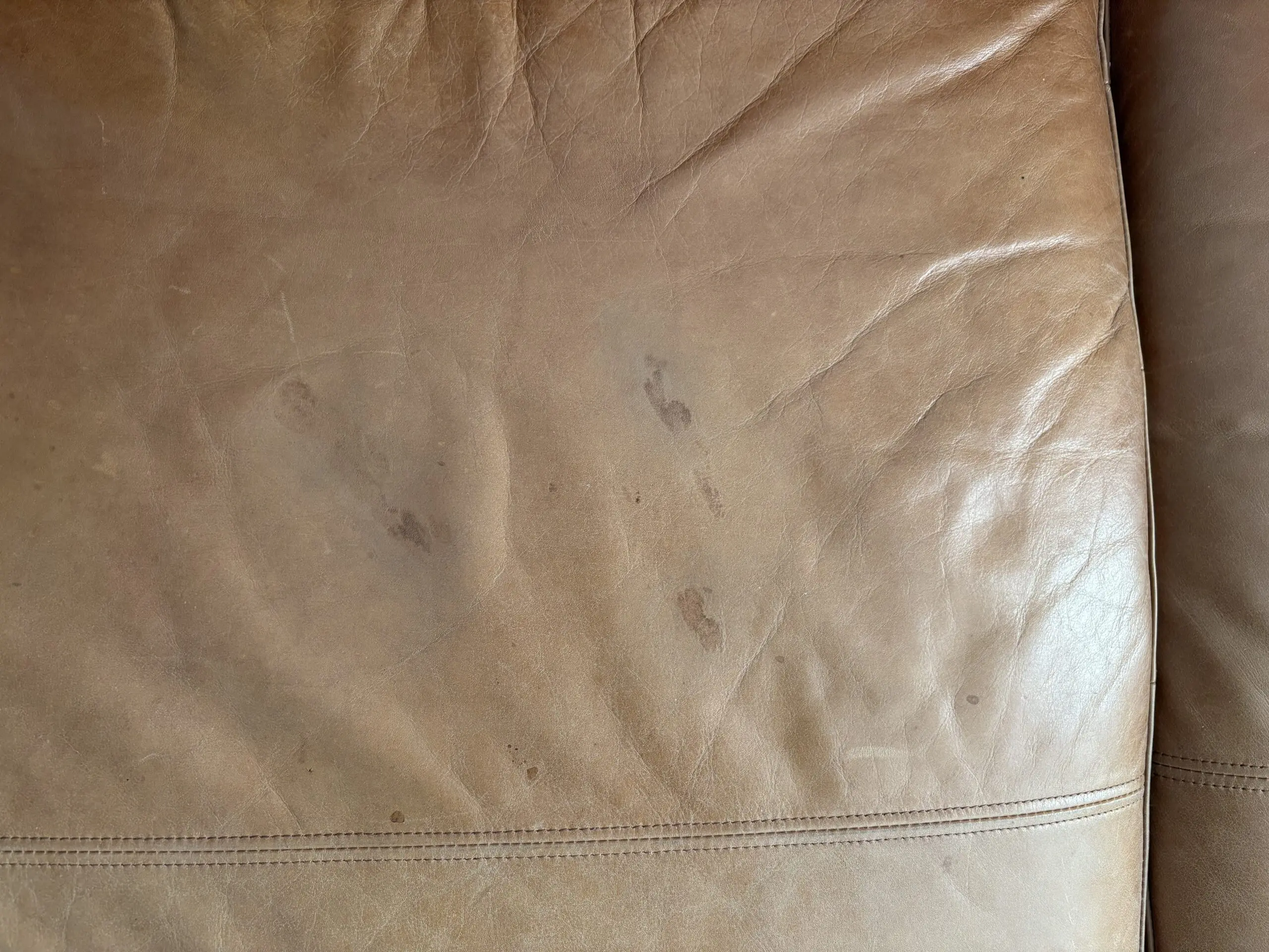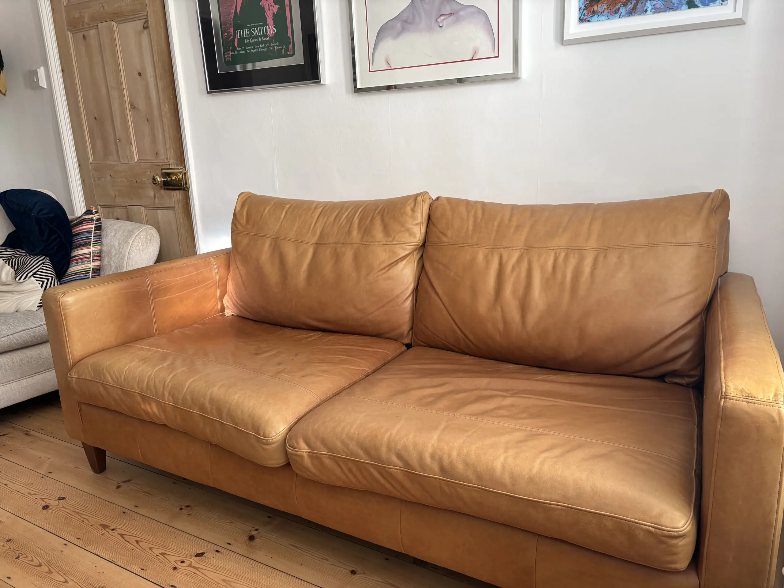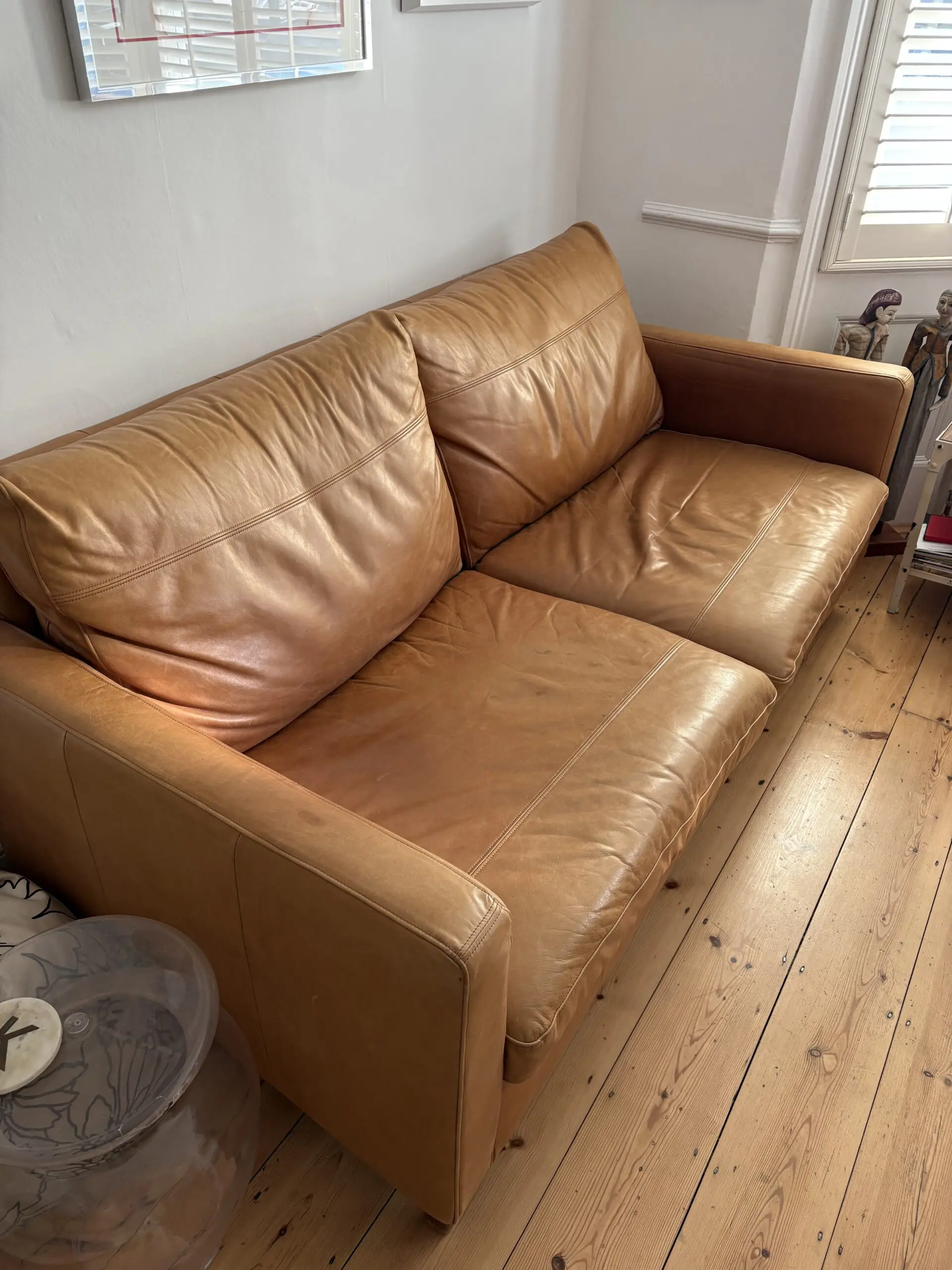 Pre-loved (selling because two sofas do not fit in small lounge so need one larger). It’s wearing well and becoming more lived in as leather sofas should. Marked as seen on one of the seat cushion – gives it character!