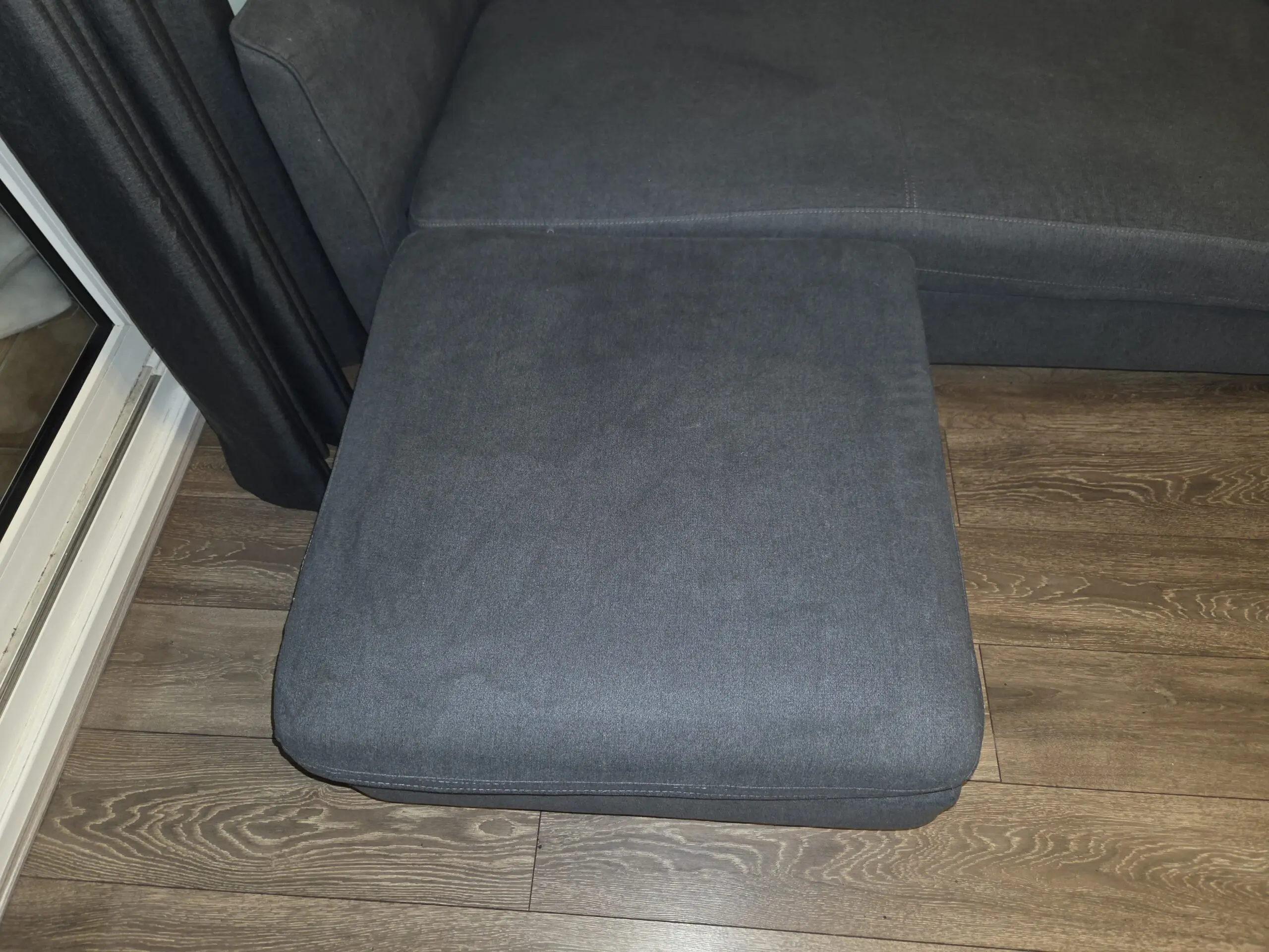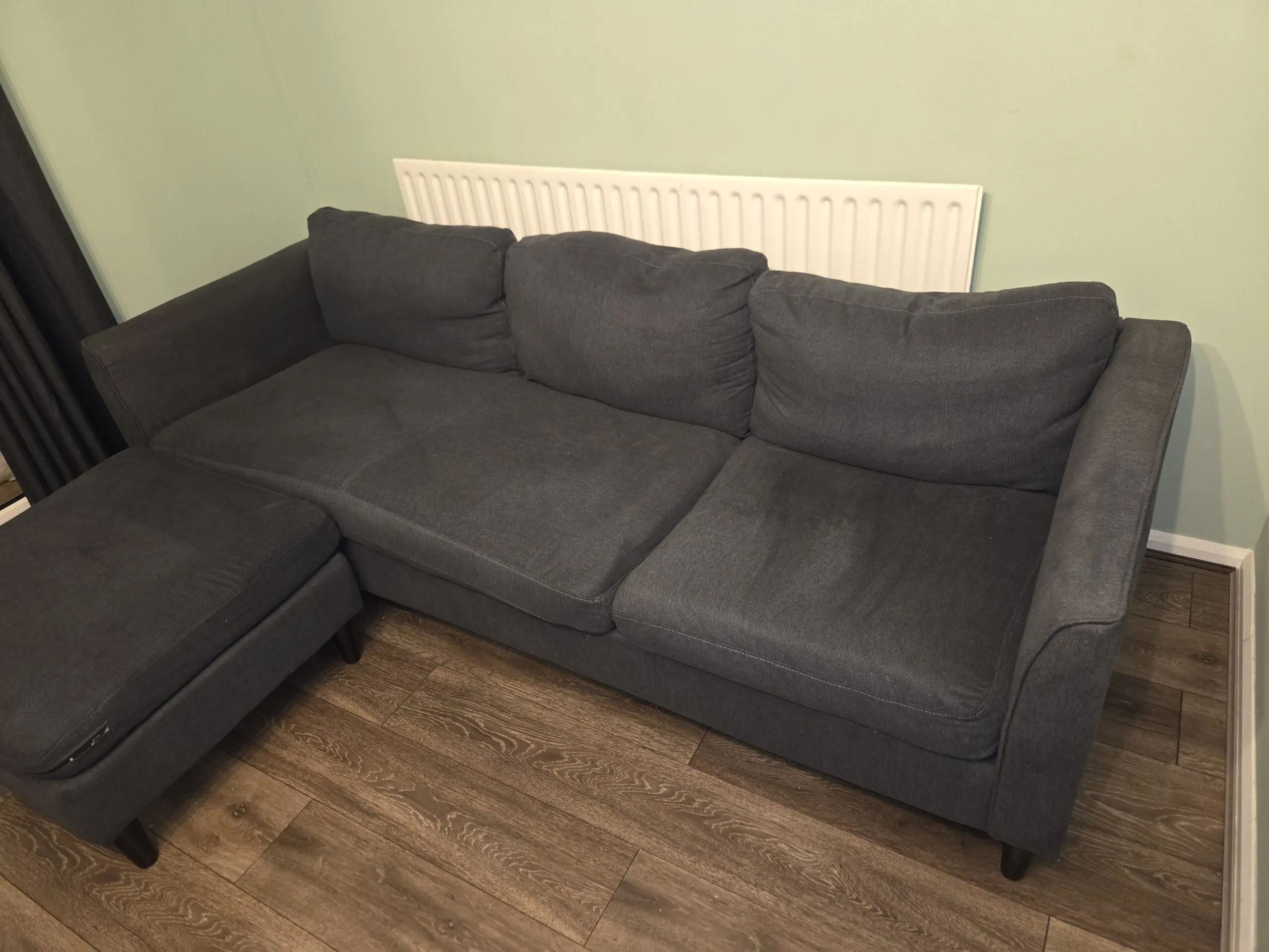Grey 3pc Sofa and Foot stool in good condition only 2 years old. The foot stool can be converted to make the sofa L shaped instead if desired. Cushion covers are removable and washable. Selling due to decorating and it no longer matching the room.