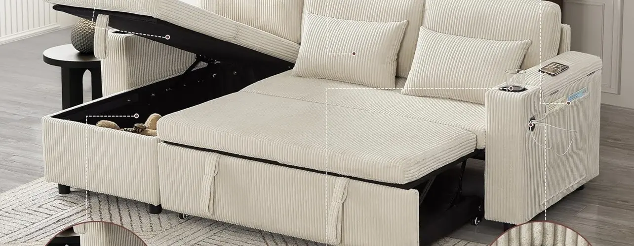 • Multiple storage options: Hidden storage under chaise, armrest compartments, and side pockets