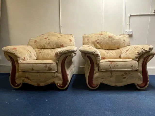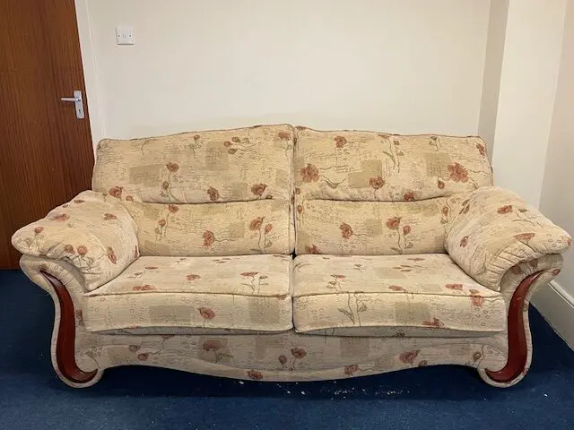 Very comfortable lounge suite comprising three seat sofa and two chairs. Nice fabric, very little use. Beige with nice floral pattern. Appears as new – very clean. Removable cushions for ease of cleaning. Wooden features to sofa / chair arms. Has been in dry storage (shop unit) for some time. Attractive suite that should give years of use. Buyer will not be disappointed.