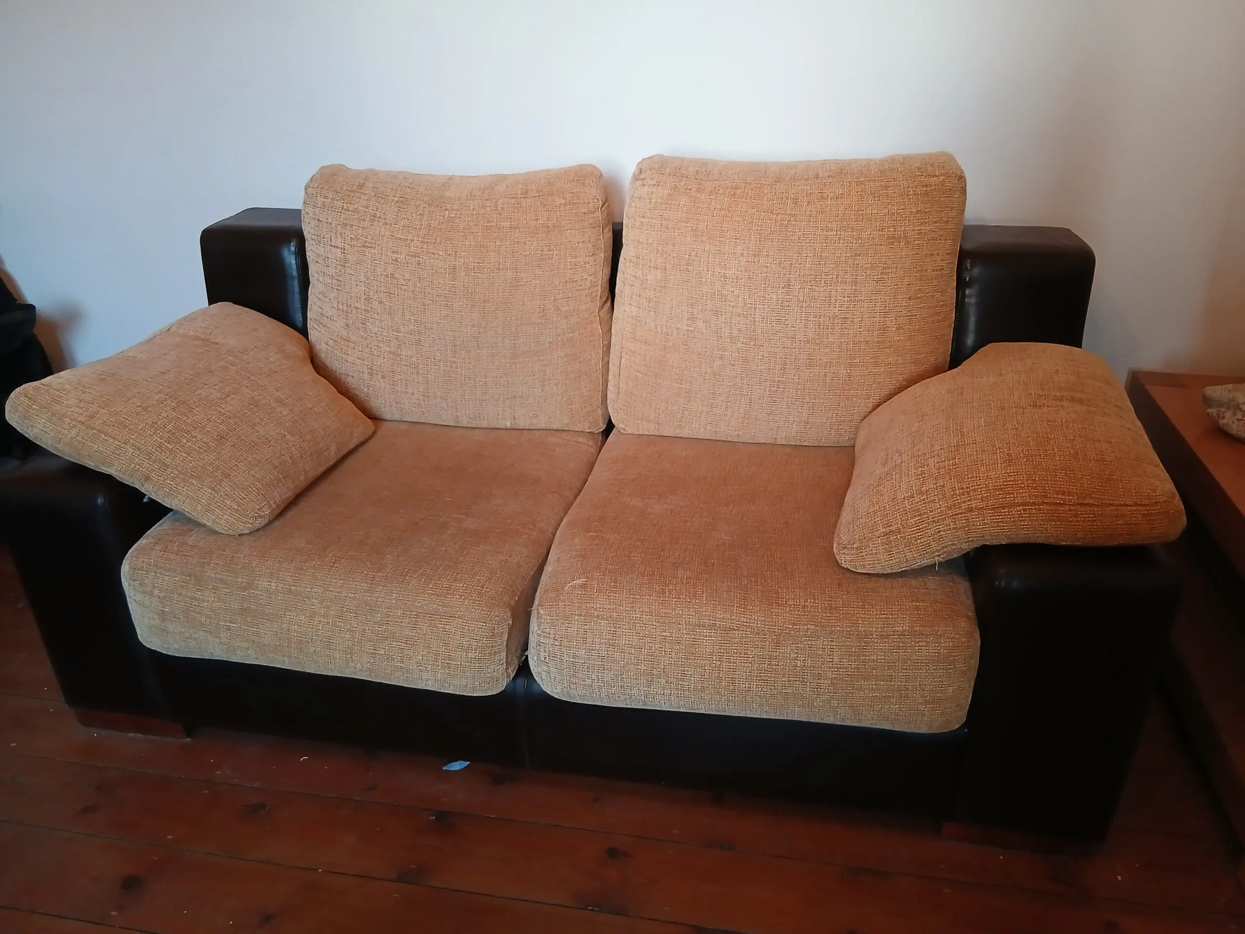 Moradillo three piece suite. One 3 person sofa, one 2 person sofa and one arm chair. Leather upholstered with fabric yellowy coloured cushions. All cushions are removable for washing. Back rest cushions zip onto back of sofa (two of these are broken). Arm rest cushions zip onto sofa arms (three of these are broken). Some light marks on the leather parts. Not sure how old but at least ten years old.