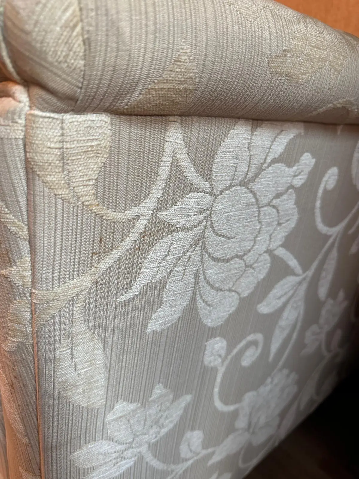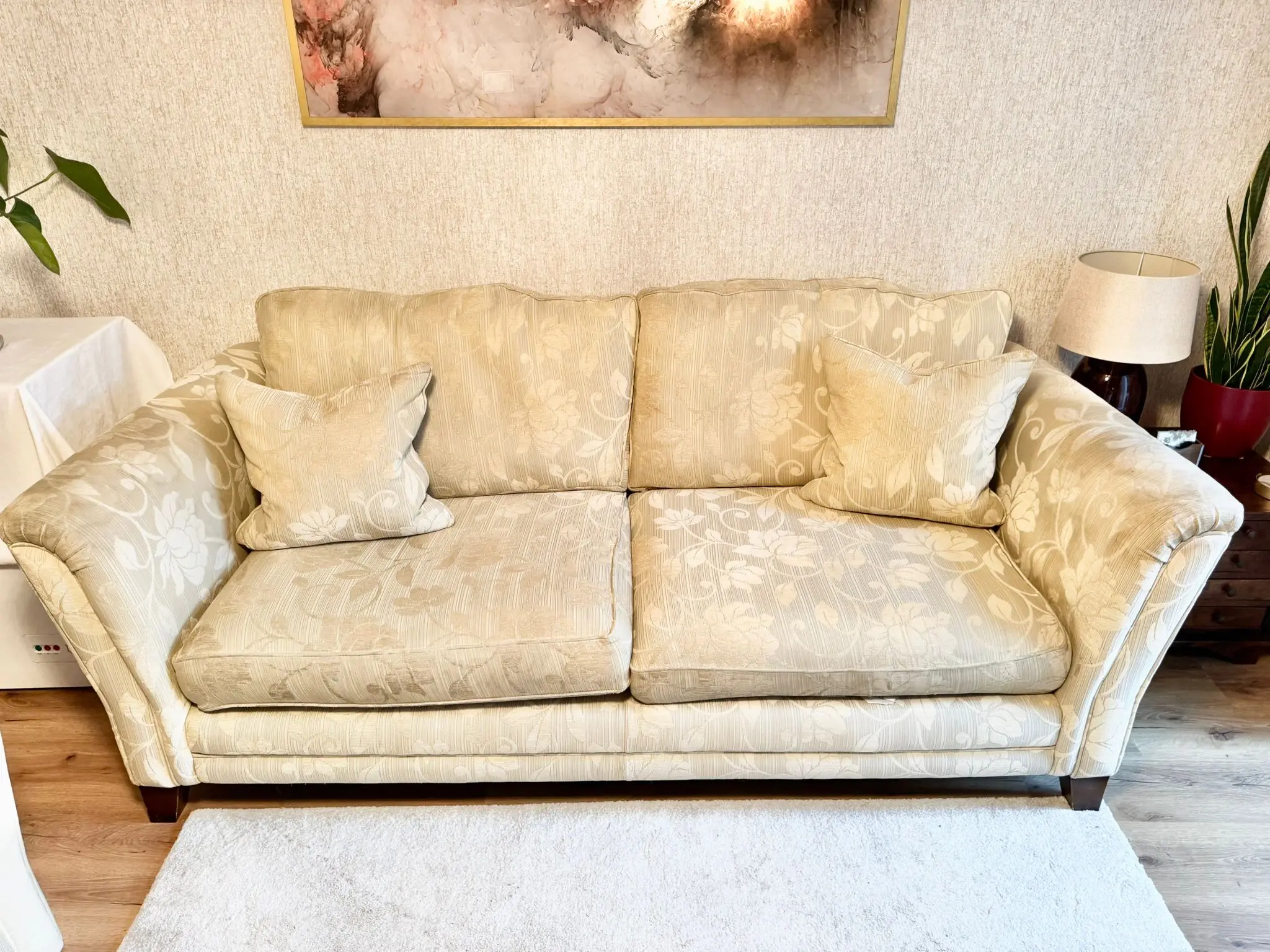 One THREE seater sofa. Fabric cream floral print., soft sheen. As seen . Sturdy, deep seat , plenty of life left in it. Feather cushions plump up well.