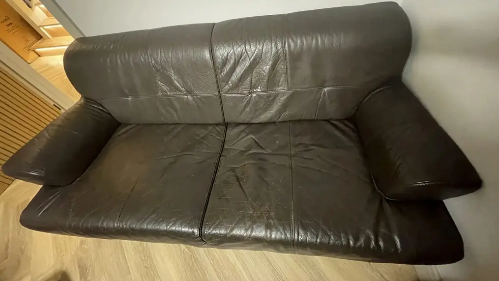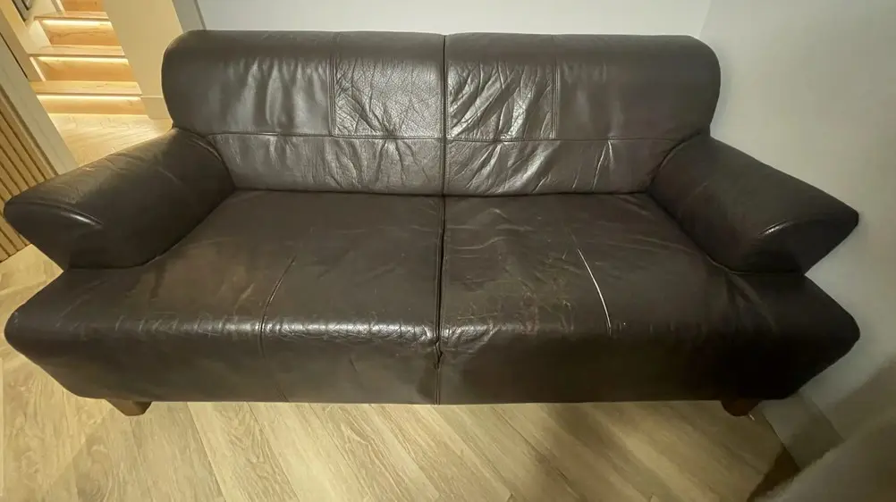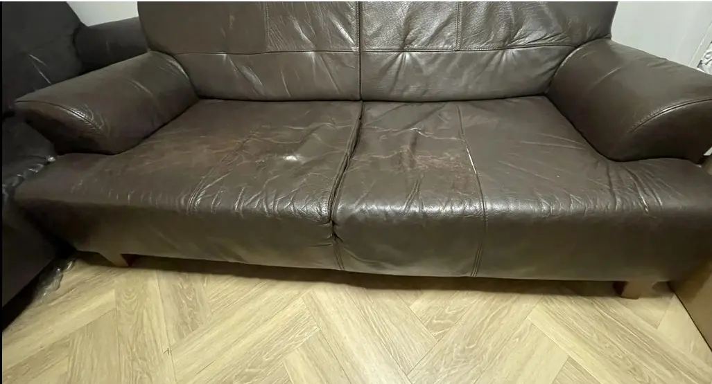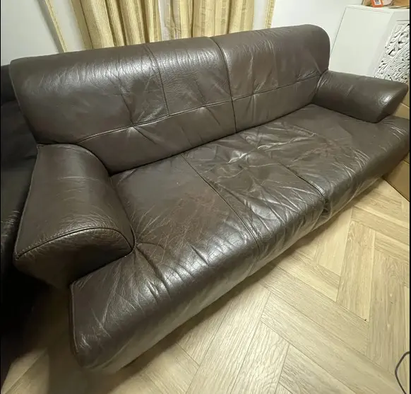 Selling two matching brown genuine leather three-seater sofas. They have a classic, modern design with wide armrests and deep seating that make them very comfortable. The leather is soft and still in good shape, with some visible wear and minor surface cracking from regular use (mainly on the seat areas). Structurally, both sofas are sturdy with no sagging or damage to the frame or cushions. They’d be a great fit for a living room, office, or lounge area.