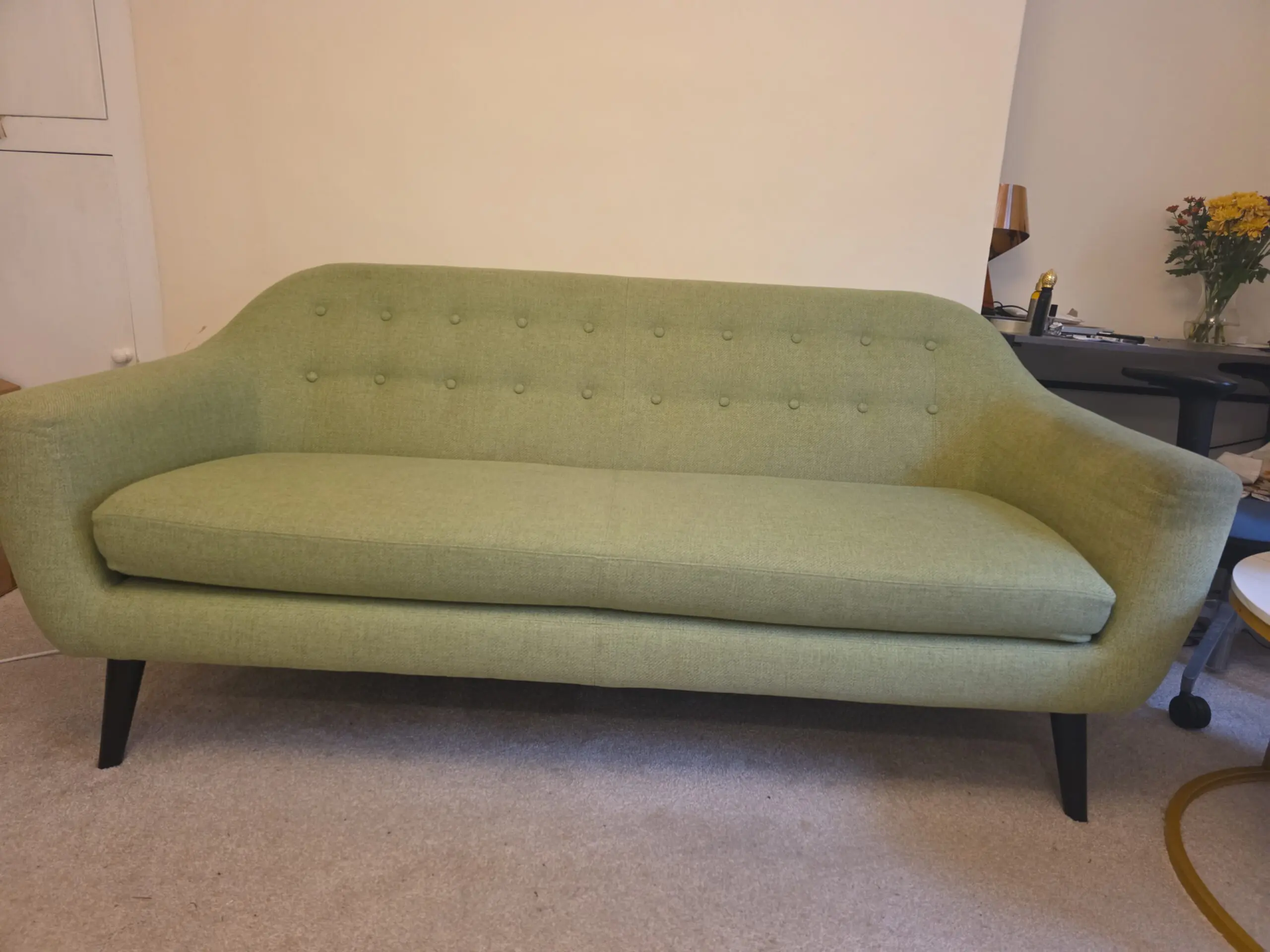 Stylish pair of mid-century modern 3-seater sofas, identical design in two different colours: mustard yellow and sage green.