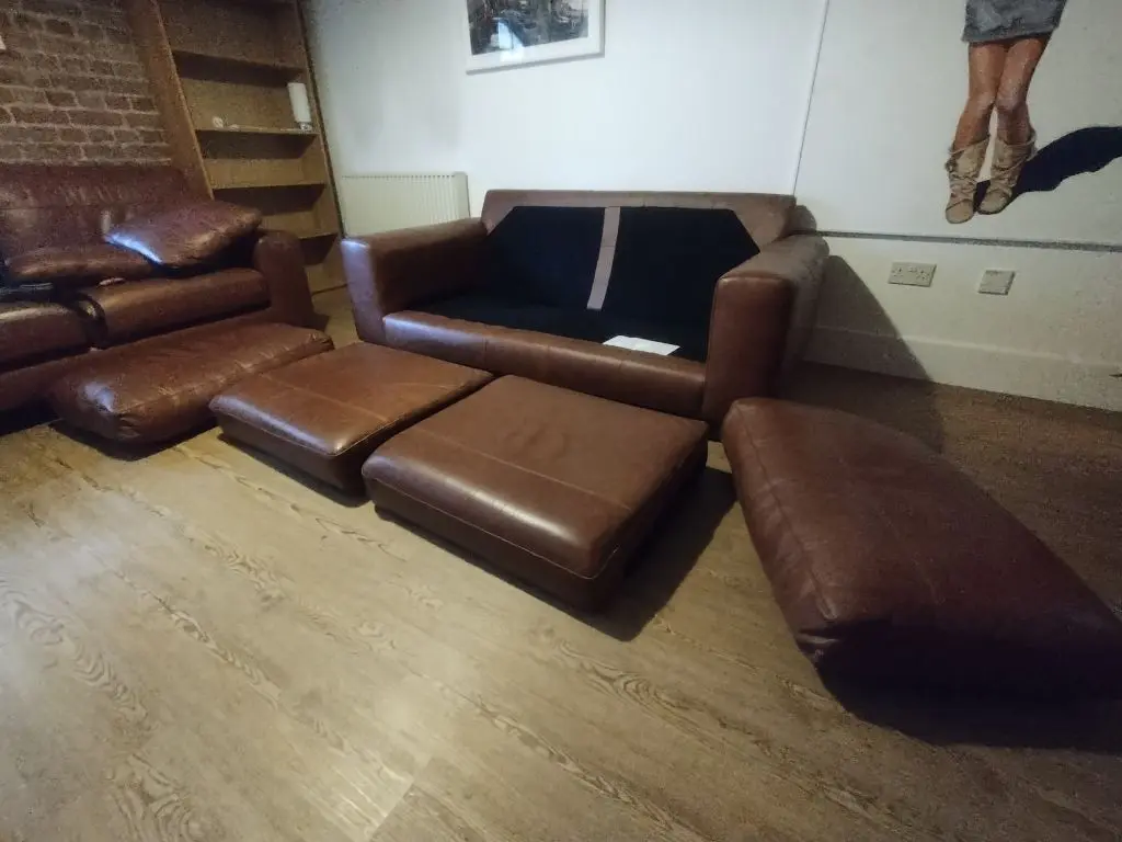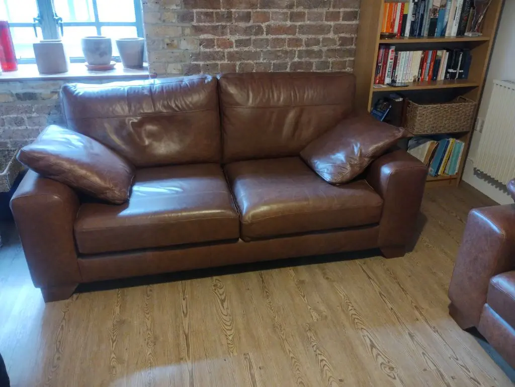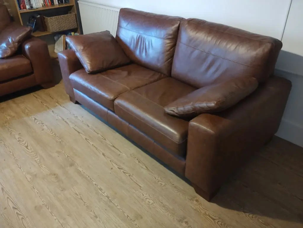 Two identical 3 seater leather sofas, and four separate matching leather cushions. In very good condition. Only 4 years old. For sale, as flat is being sold. Back and seat cushions are removable and can be rotated between sofas to even wear. With the back cushions removed (for delivery) the sofa height reduces to 76cm. Original cost £1500 each.