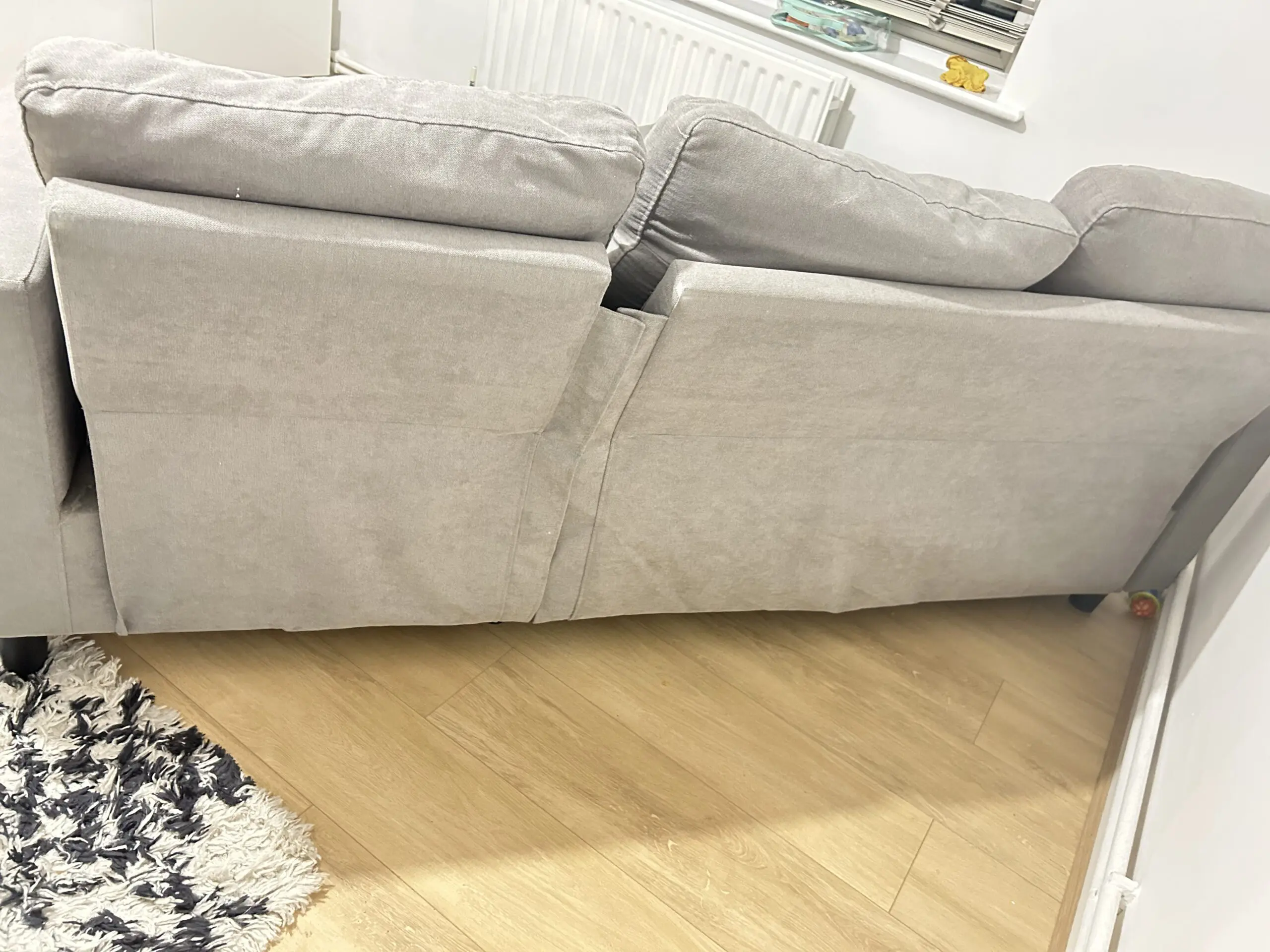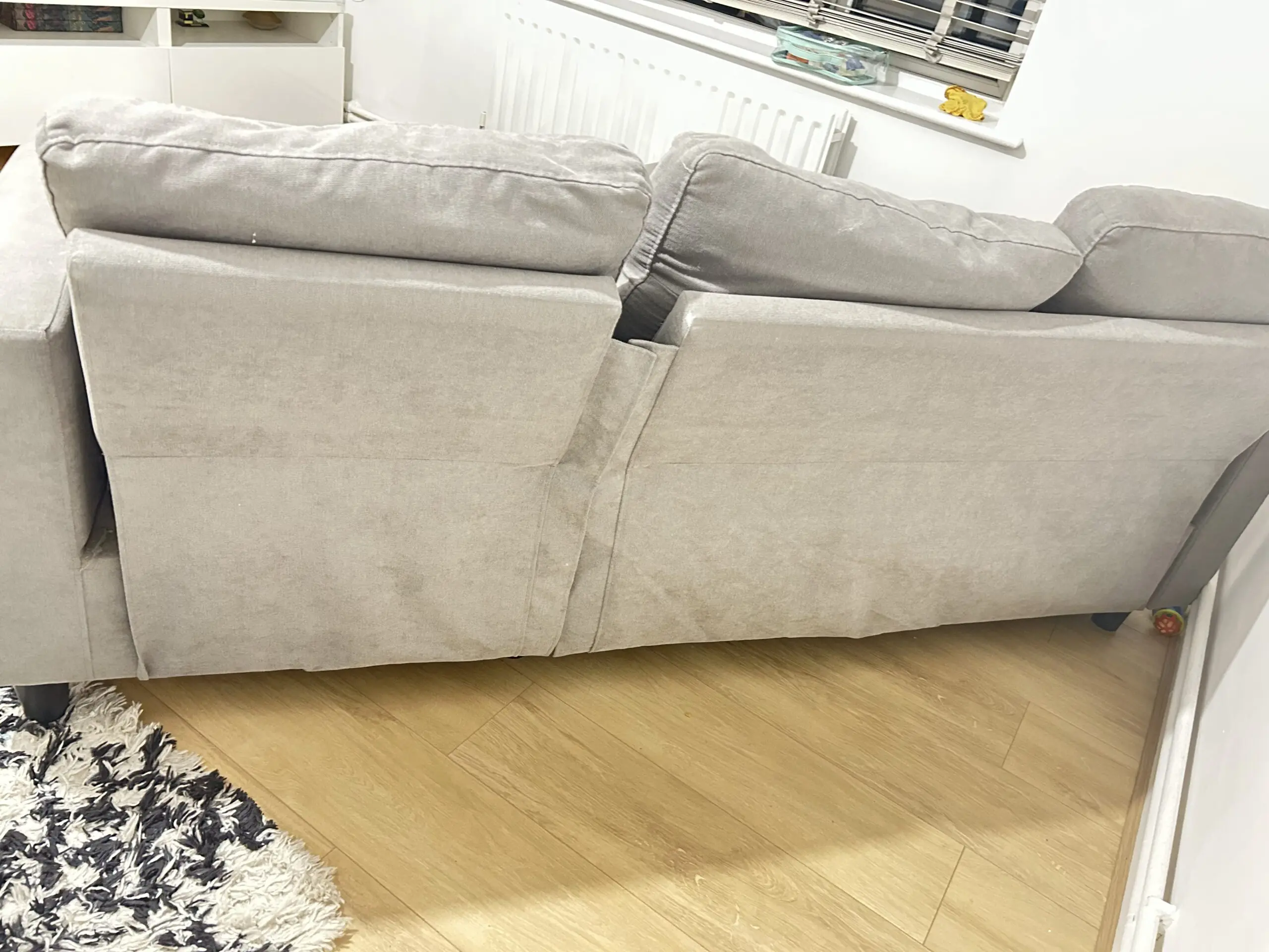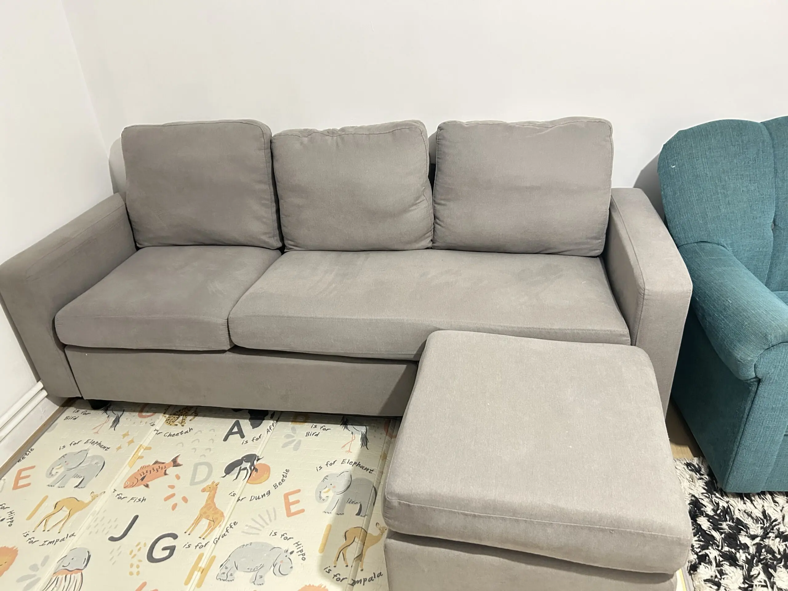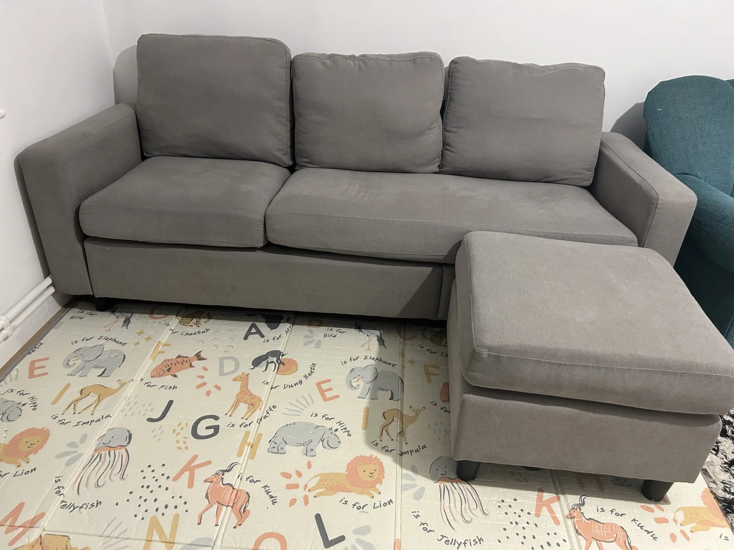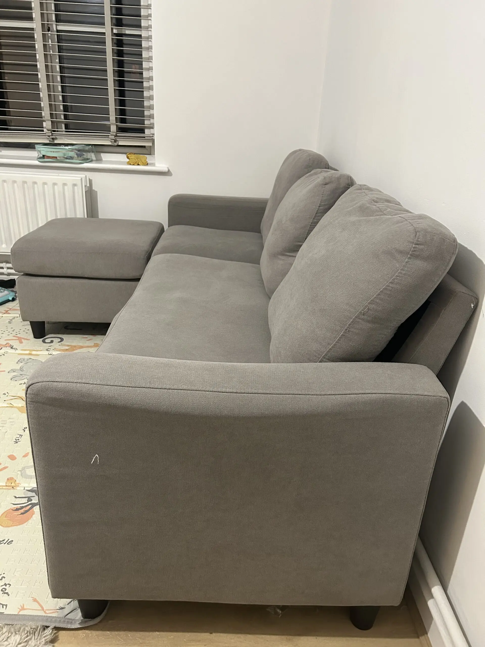 Used grey fabric 3-seater sofa with matching footstool/ottoman. Comfortable and solid, ideal for everyday use. Footstool can be used as a chaise extension or separately.