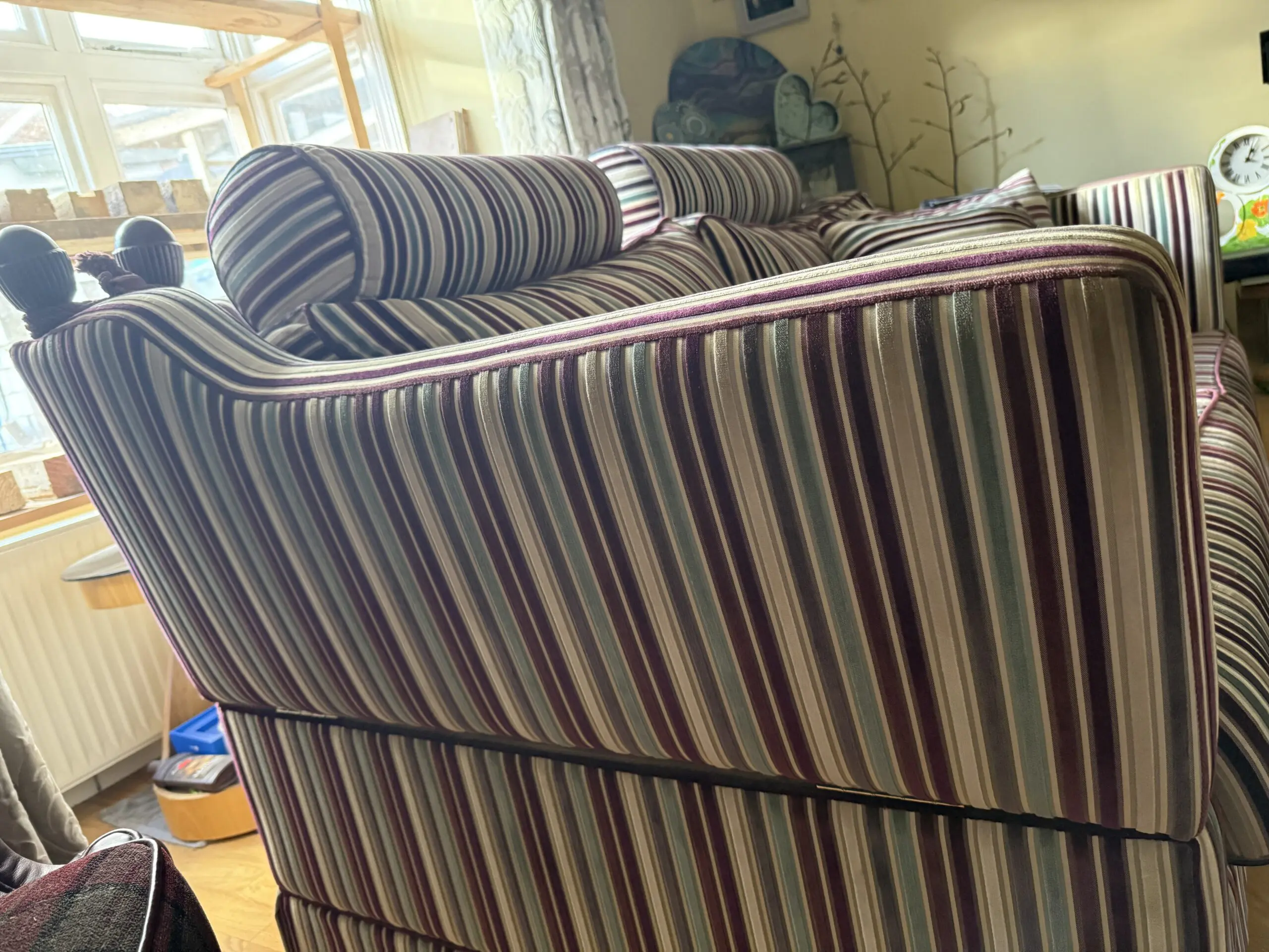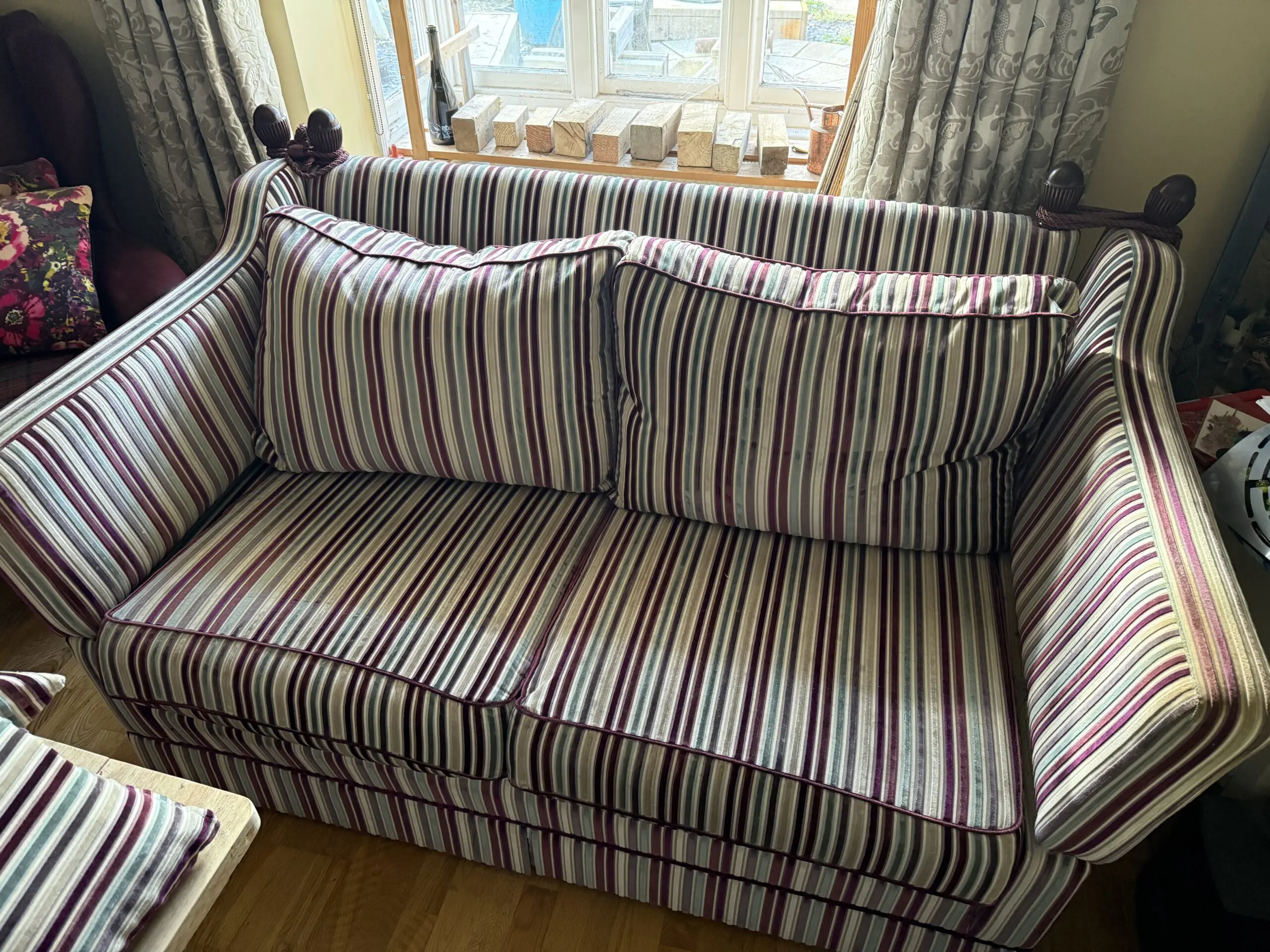Made to order by local craftsman. This vintage style sofa has ‘wing’ arms that fold down on hinges at either end. The seat, back and scatter cushions are filled with feathers. The fabric is a velvet stripe. One tassle is broken and there are minor marks on the arms and seat.