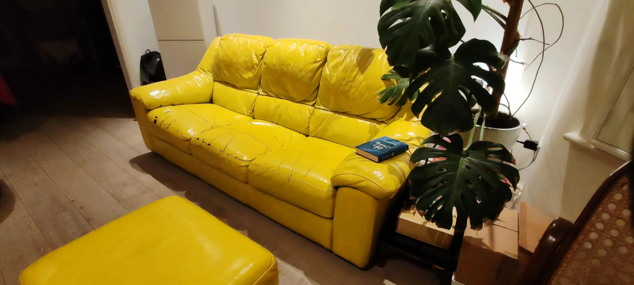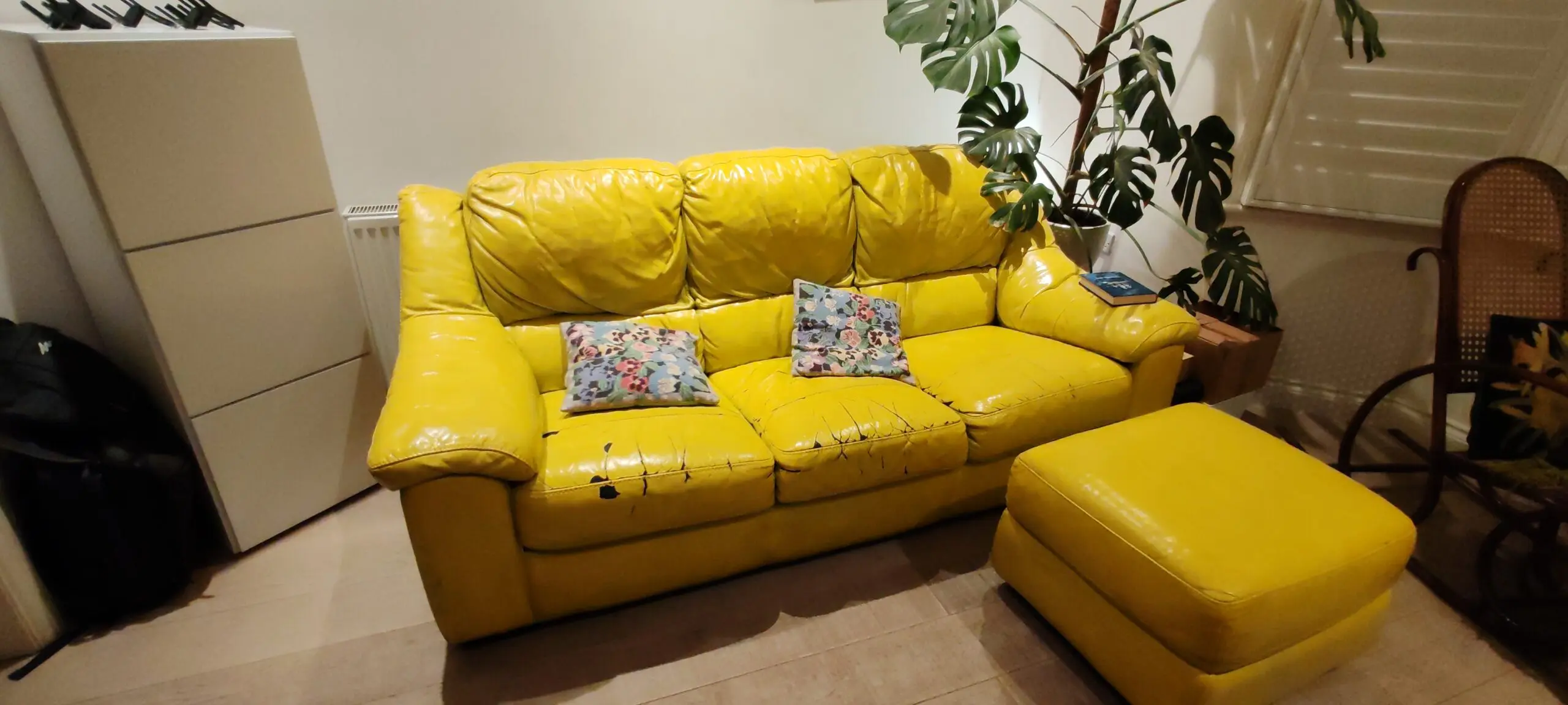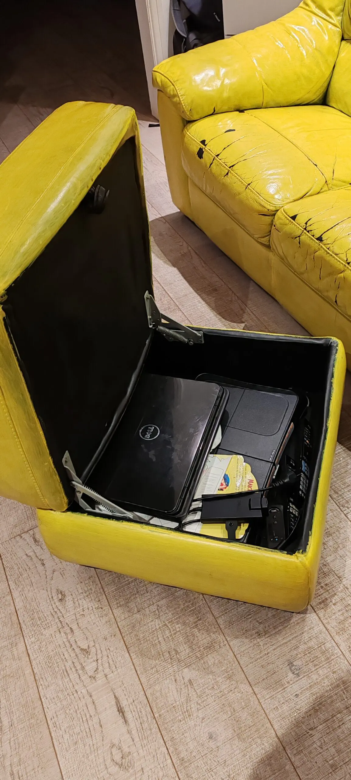 The sofa was black but after a few years we decided to give some colourful style to the living room and painted in yellow. However some of the pain ls starting to come off. The sofa has a puf with storage that you can take included in the price. The sofa is really comfy but after 11 years, we need a change for our eyes.