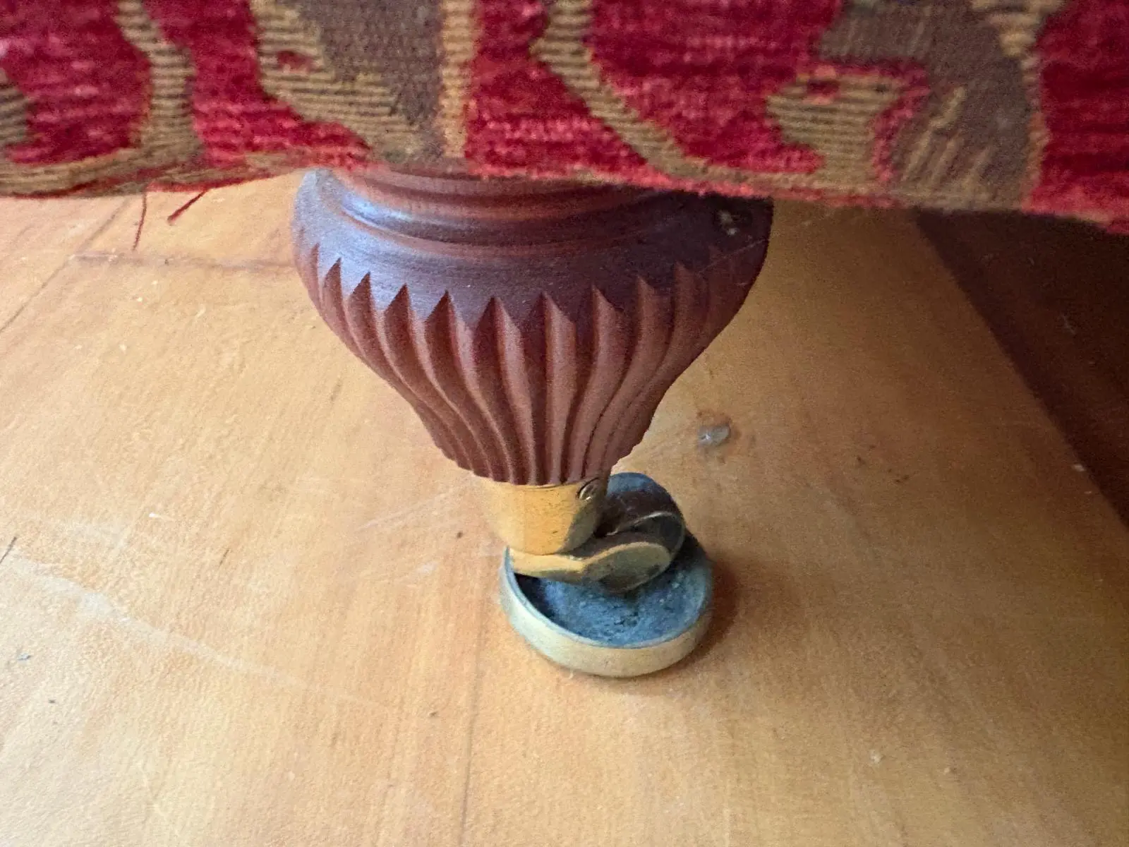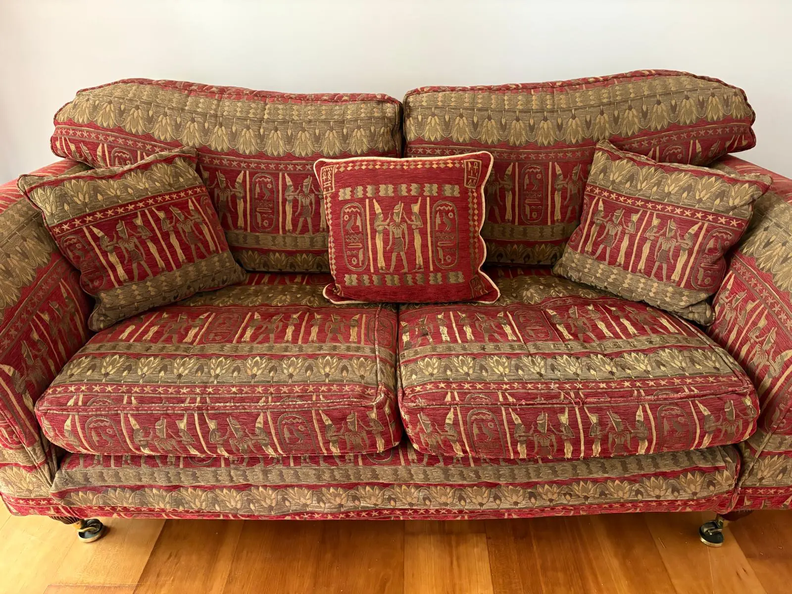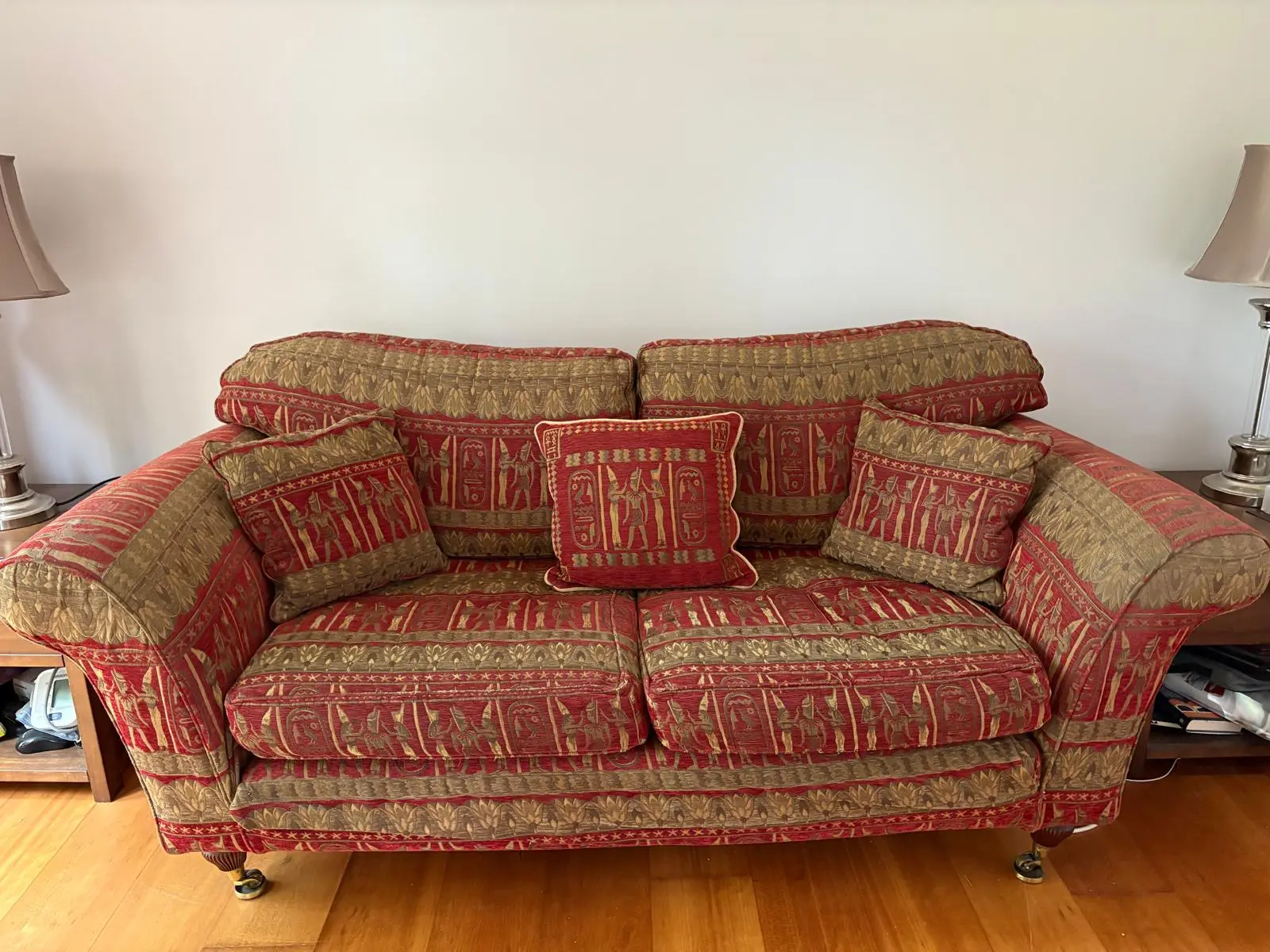 25 years old, very comfortable, in very good condition. There are slight signs of wear to the fabric but very minor. Includes 3 cushions in the same tapestry fabric.